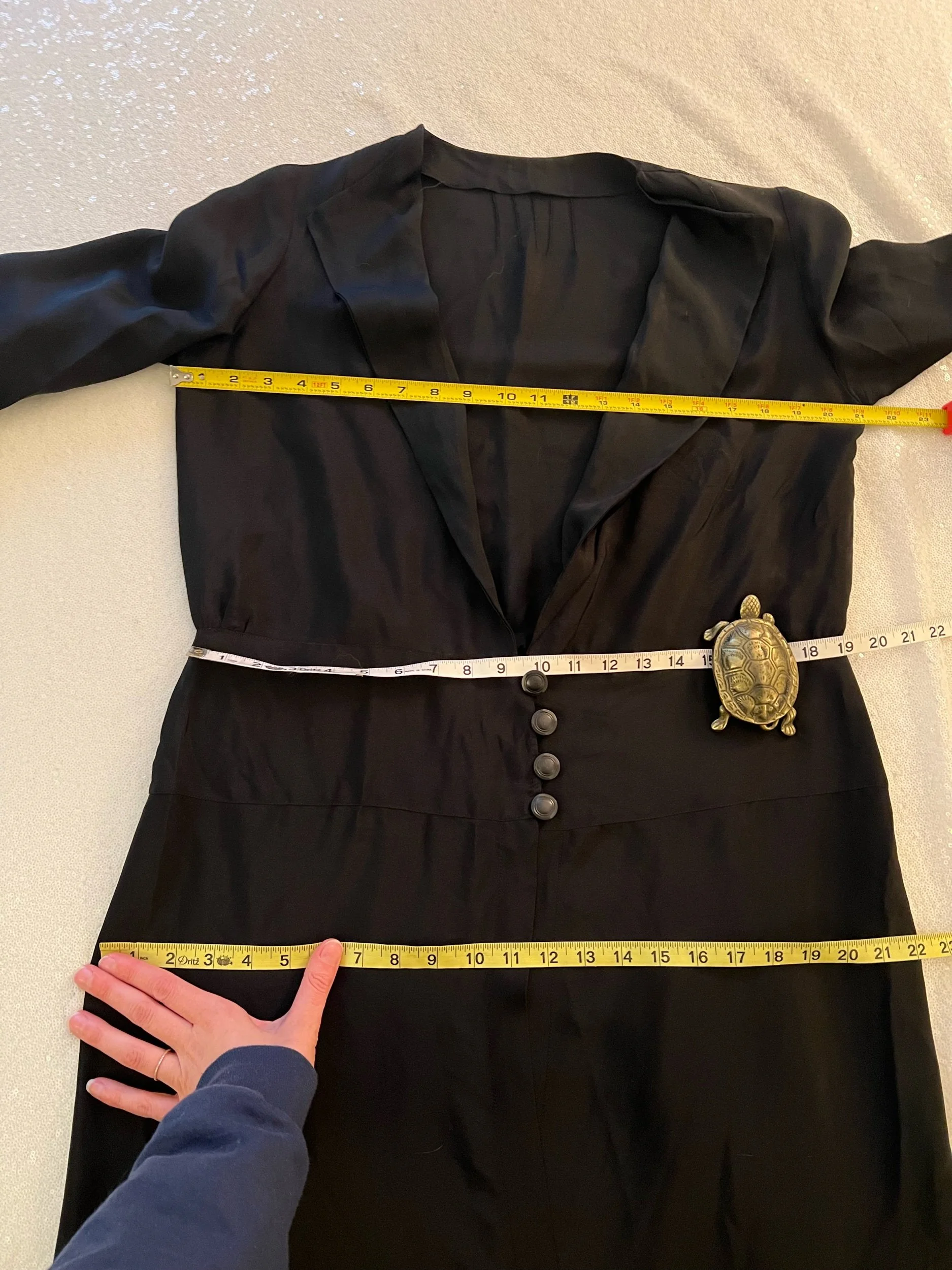 You really can’t beat an 1920s (possibly EARLY 1930s) dress jacket! I truly love these kinds of pieces because they can be so versatile! You can dress the piece up and wear it as intended over another dress for a very vintage look OR you could dress the item down and modern and wear it with a cute top and a pair of jeans. The garment is made of what feels like rayon and it buttons at the front with what feels like celluloid buttons. There are decorative buttons at the sleeves as well. May best fit a modern size Medium, maybe a Large though remember that the 20s style garments are meant to be loose fitting. Model is modern day size 4/6 and dress form is modern Medium for reference.
