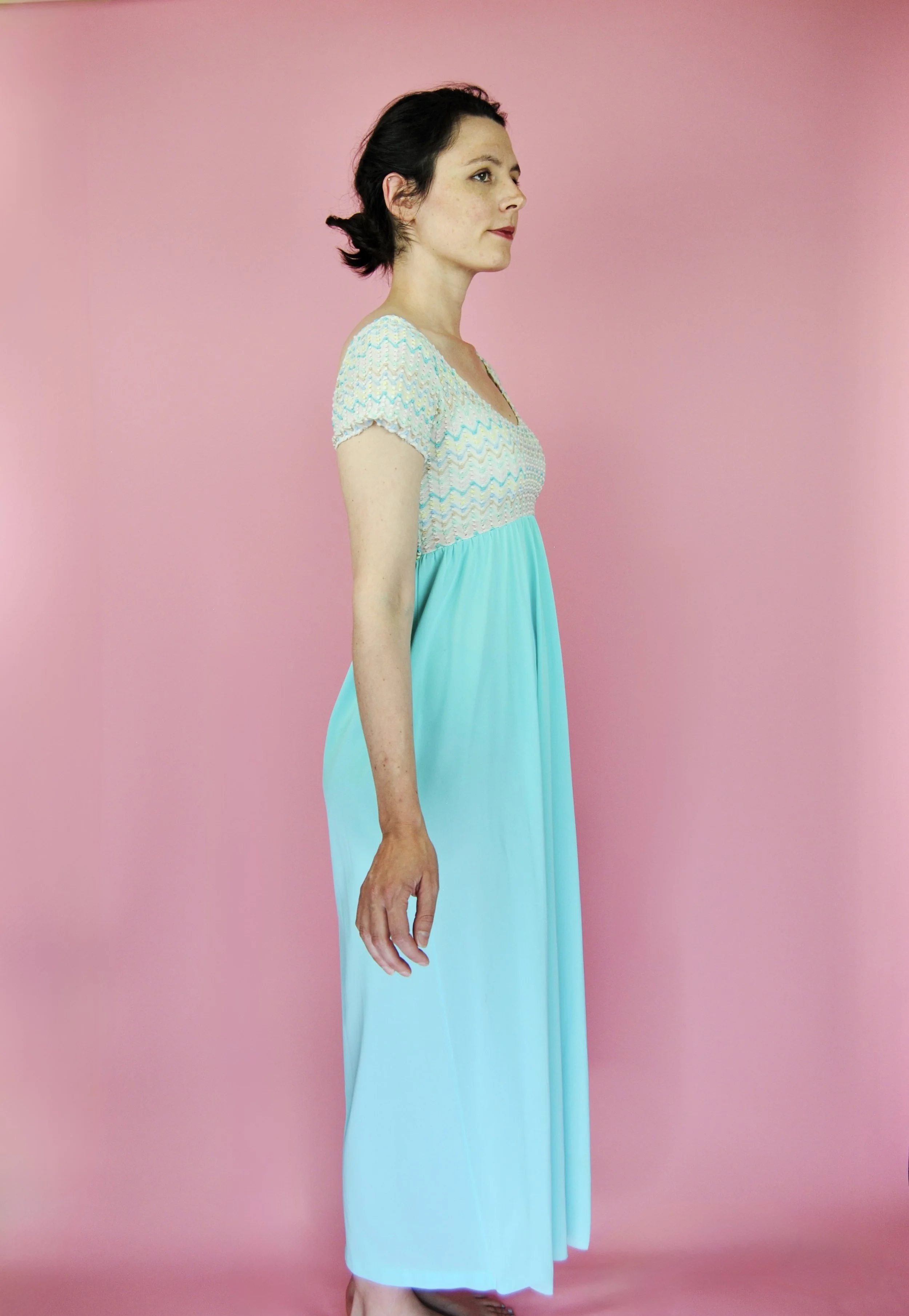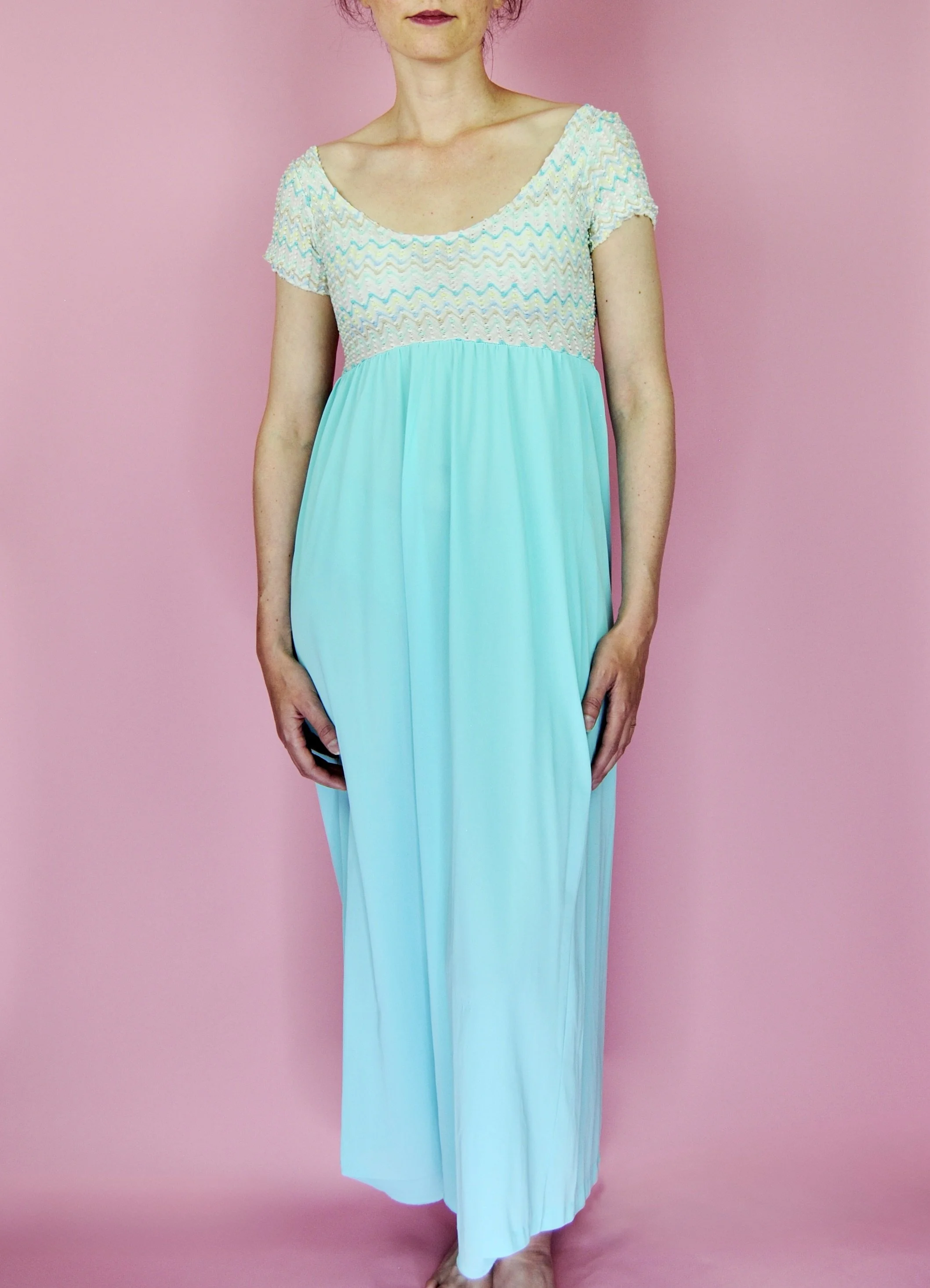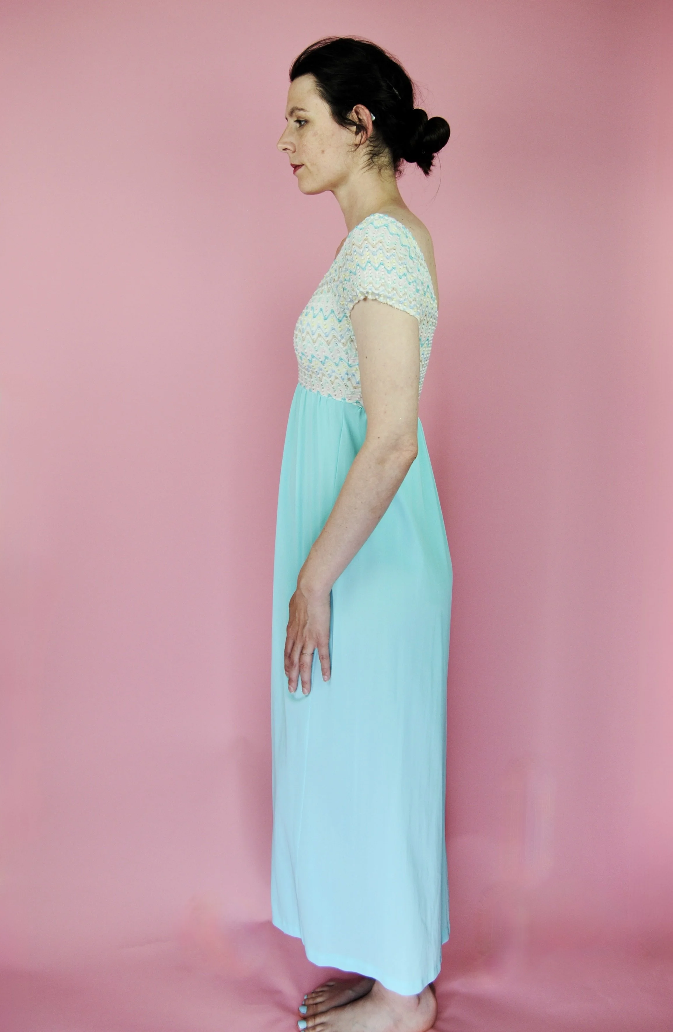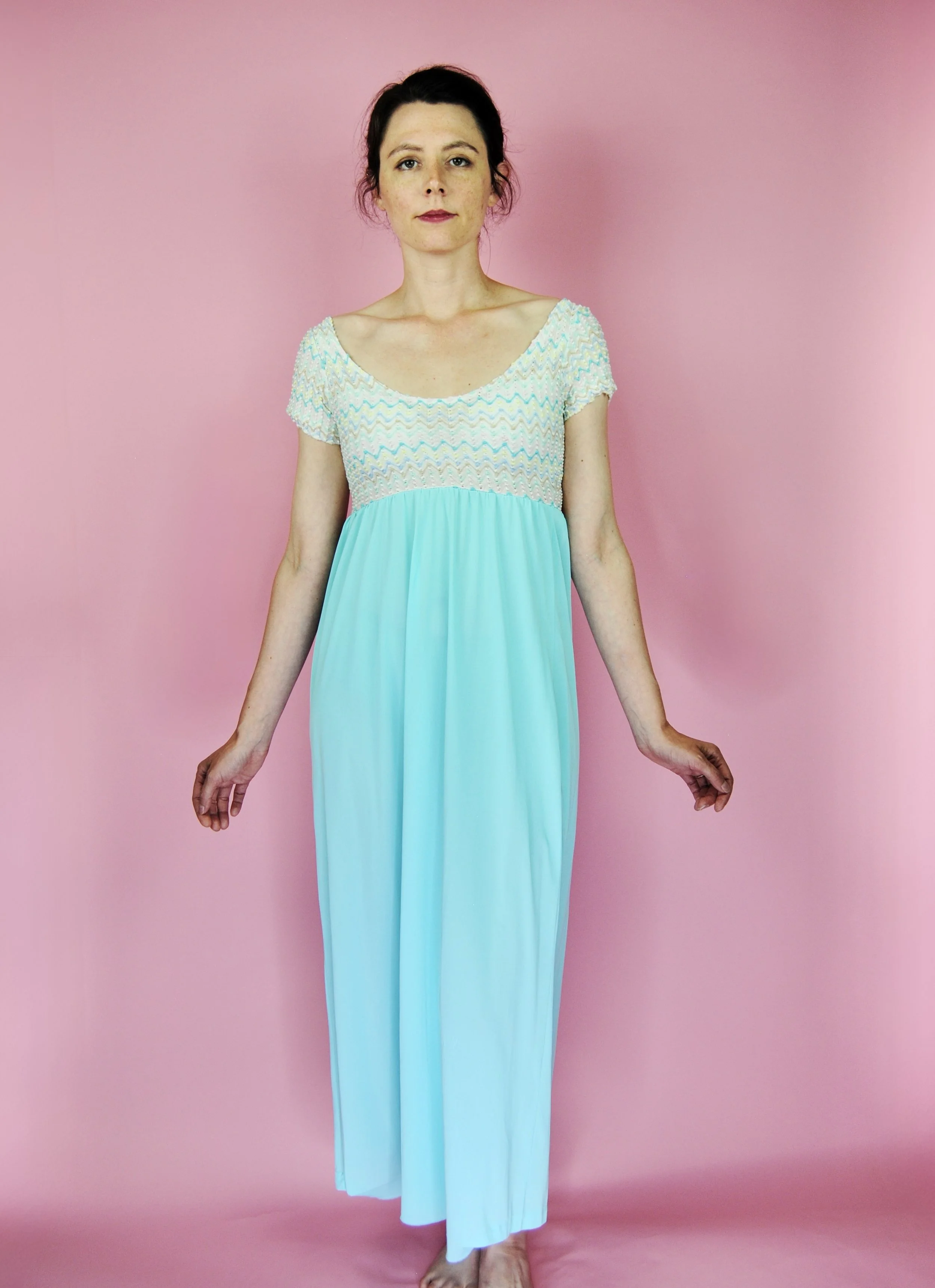 Such a lovely long night gown for any special occasion! Slightly sheer with some lovely lace detailing. Fabric tag says nylon on tricot. The label is for Vanity Fair and says size 36. You do want it to be somewhat loose and comfy as it is a nightgown. For reference, model is modern size 4/6 and dress form is size XS. Model is also wearing an additional slip underneath - you can see it in some pictures, especially at the bodice.