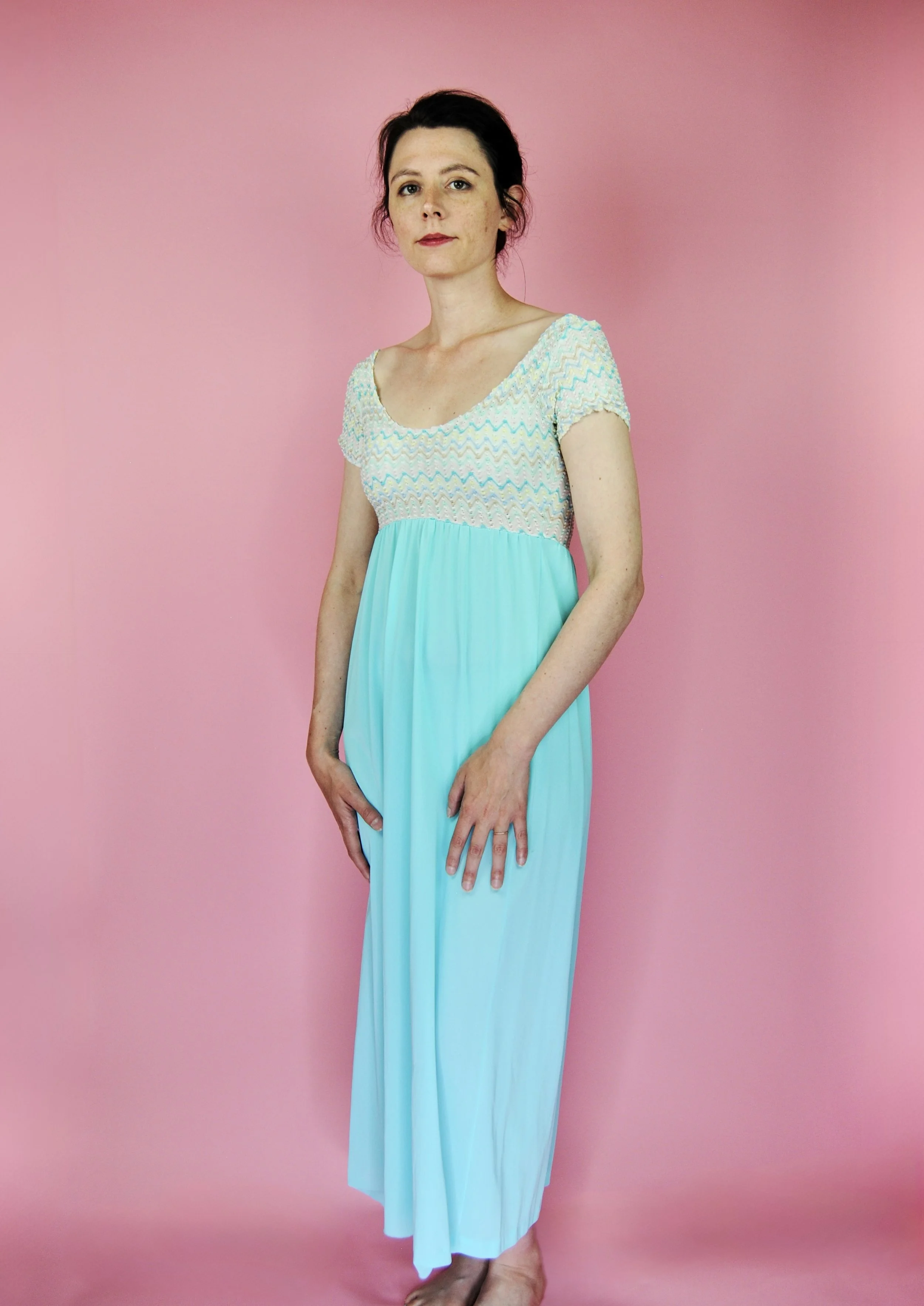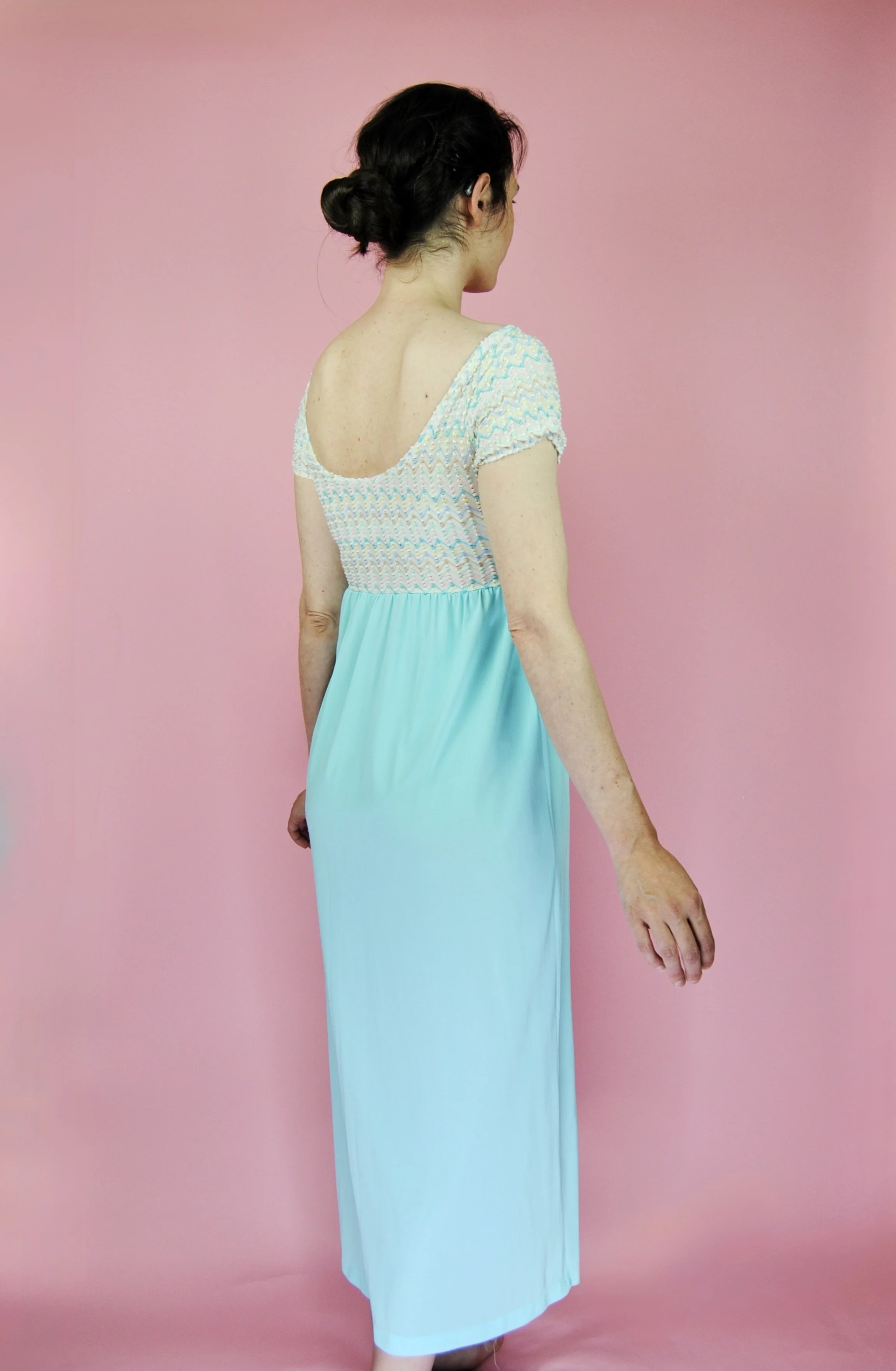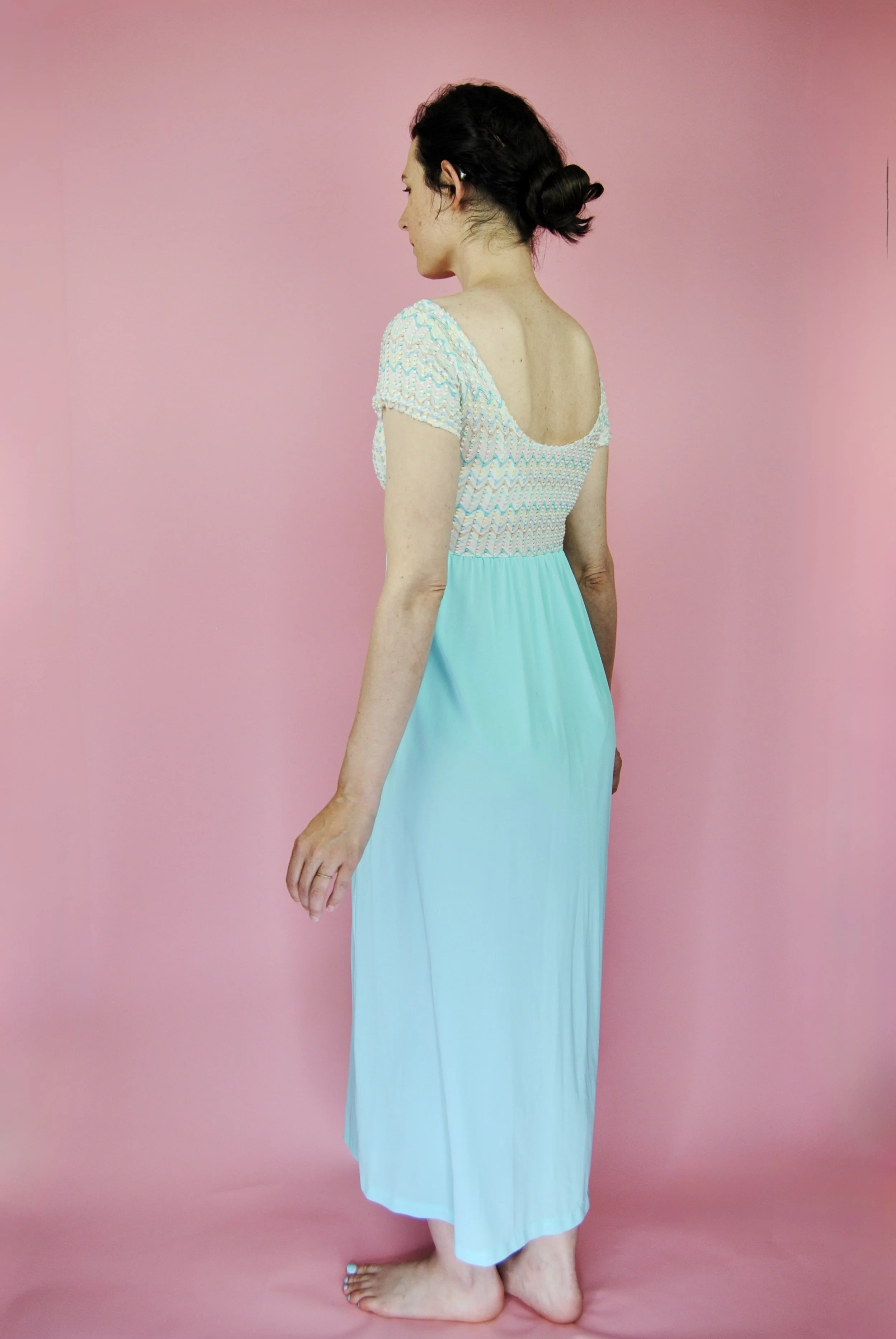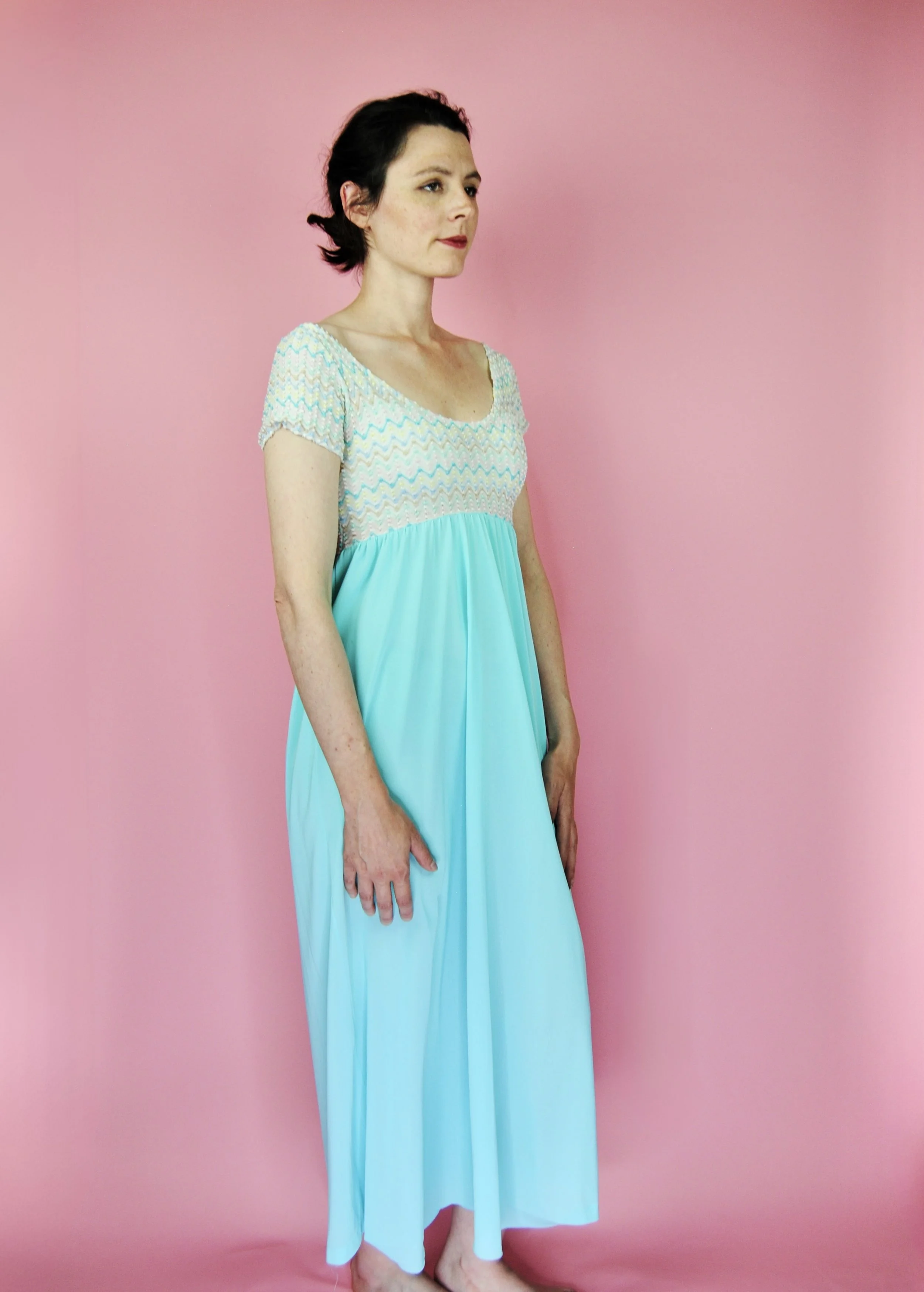 Such a lovely long night gown for any special occasion! Slightly sheer with some lovely lace detailing. Fabric tag says nylon on tricot. The label is for Vanity Fair and says size 36. You do want it to be somewhat loose and comfy as it is a nightgown. For reference, model is modern size 4/6 and dress form is size XS. Model is also wearing an additional slip underneath - you can see it in some pictures, especially at the bodice.