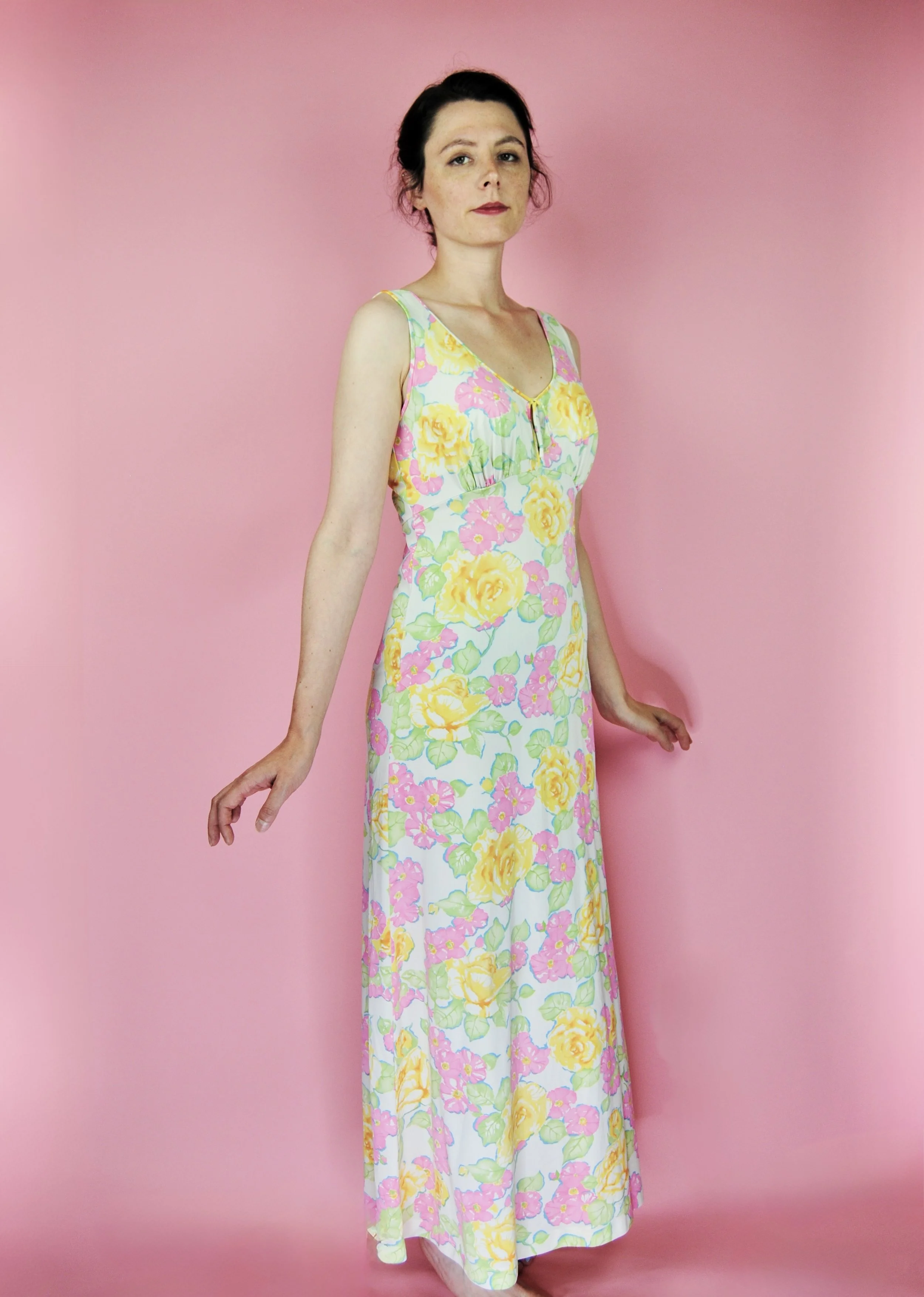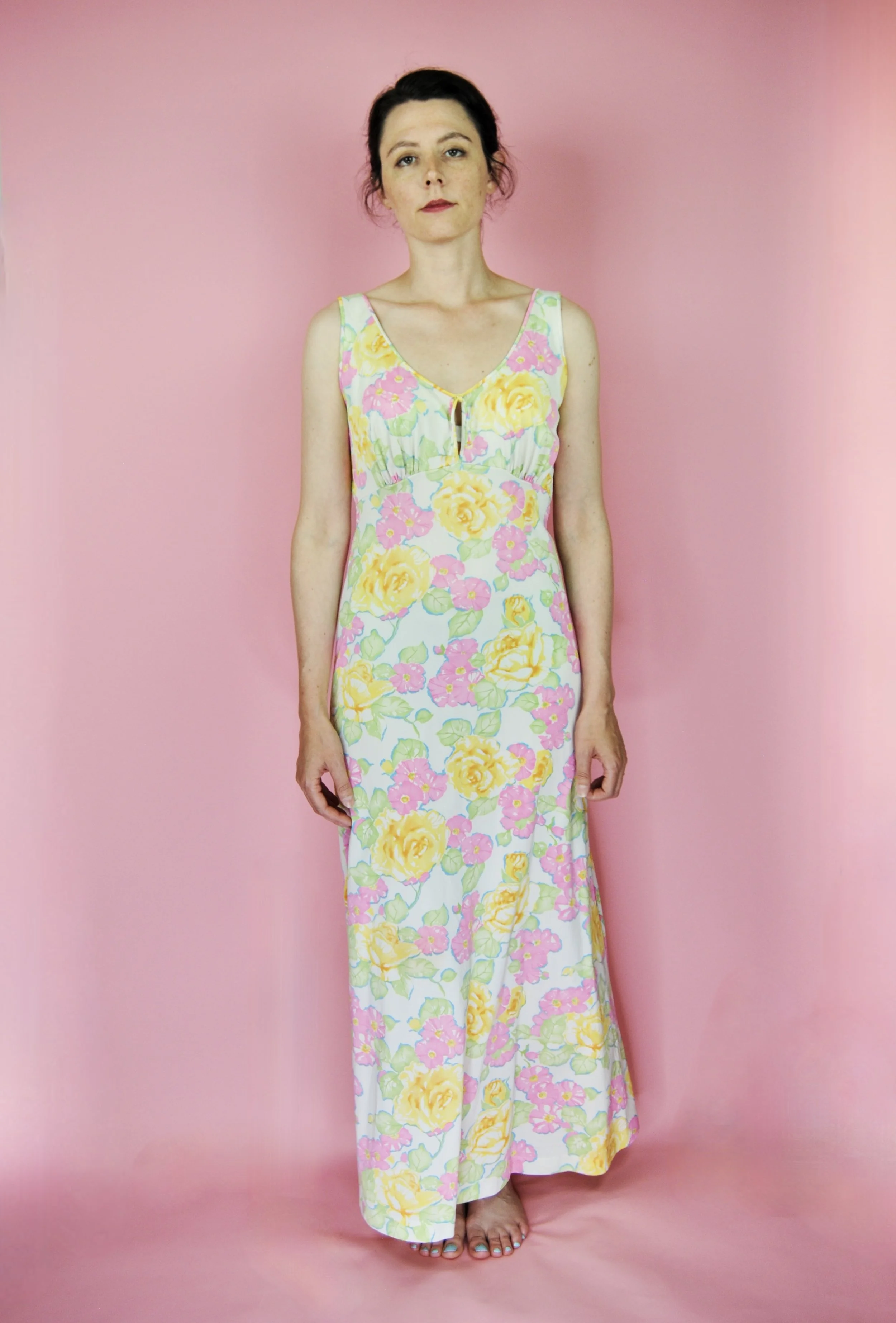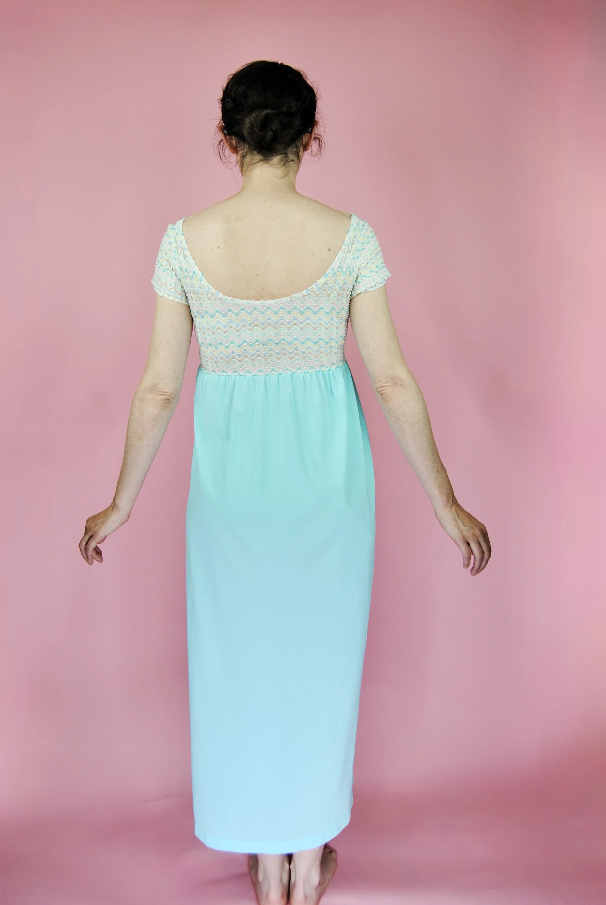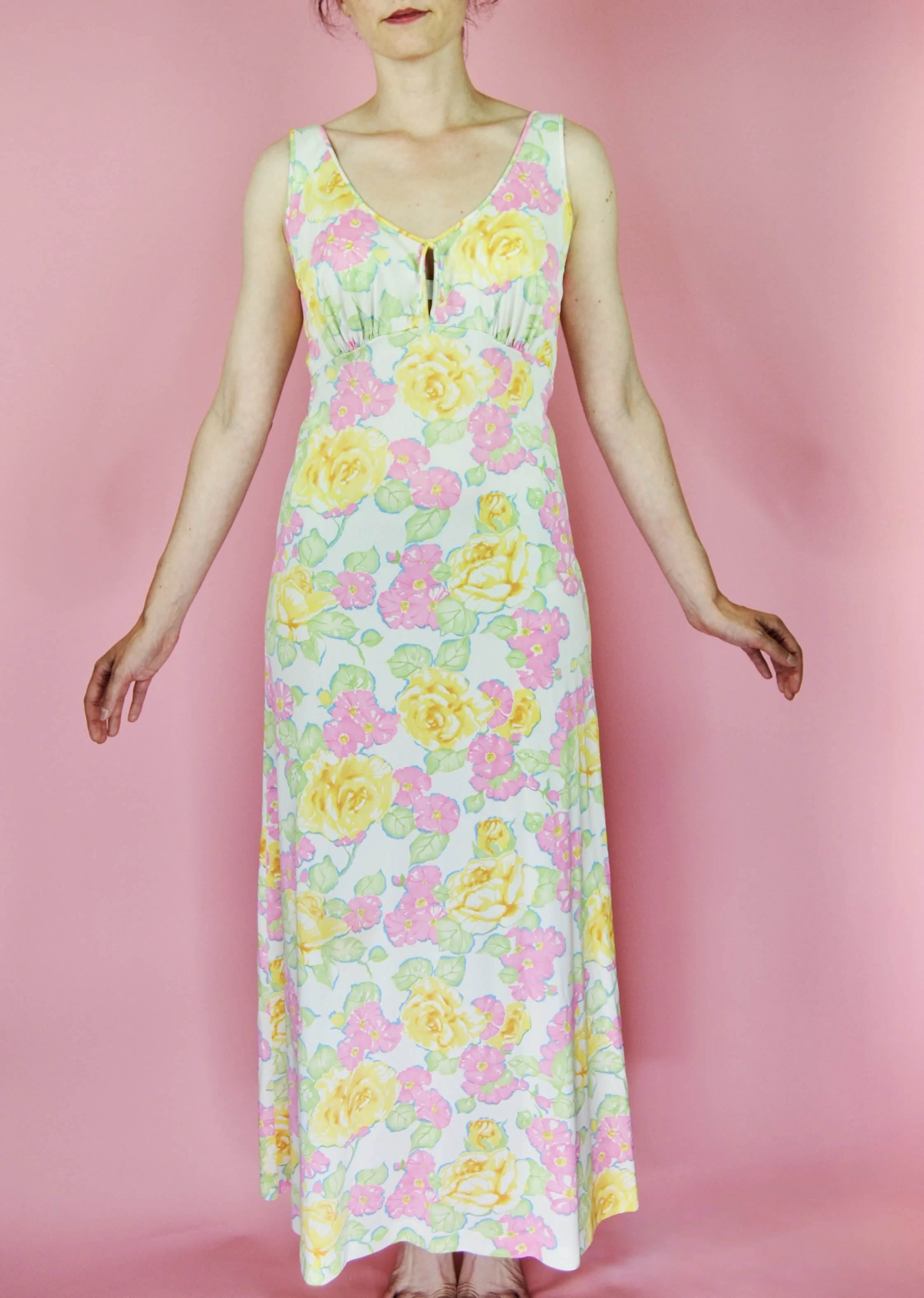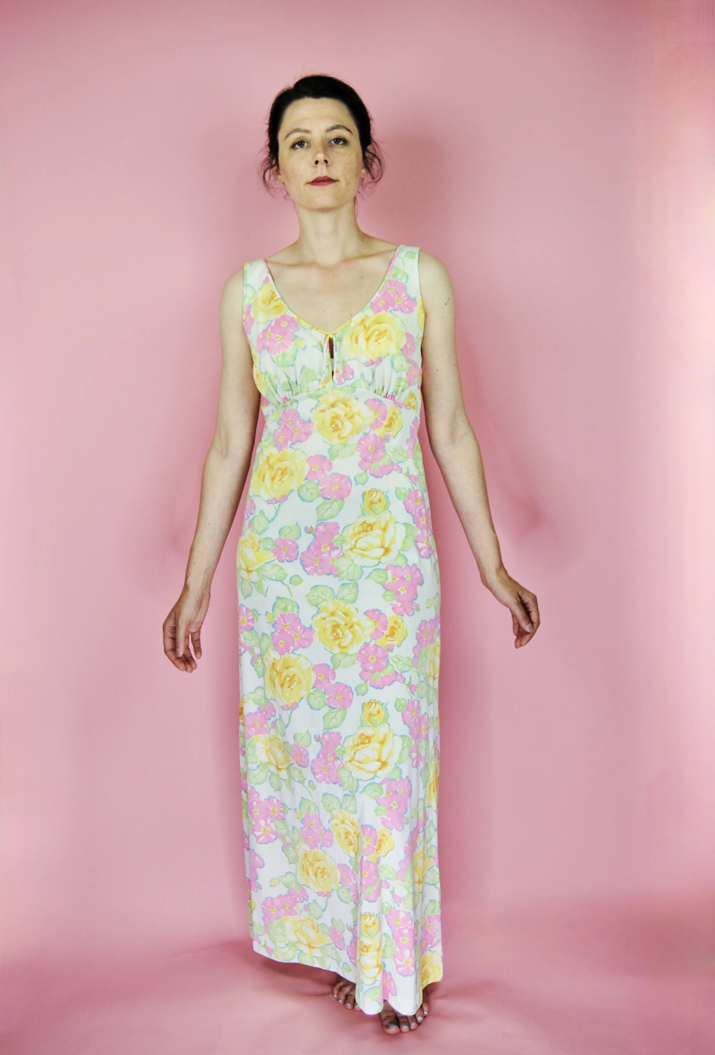 Such a lovely long night gown for any special occasion! Slightly sheer with some lovely lace detailing. Fabric tag says nylon on tricot. The label is for Vanity Fair and says size 36. You do want it to be somewhat loose and comfy as it is a nightgown. For reference, model is modern size 4/6 and dress form is size XS. Model is also wearing an additional slip underneath - you can see it in some pictures, especially at the bodice.