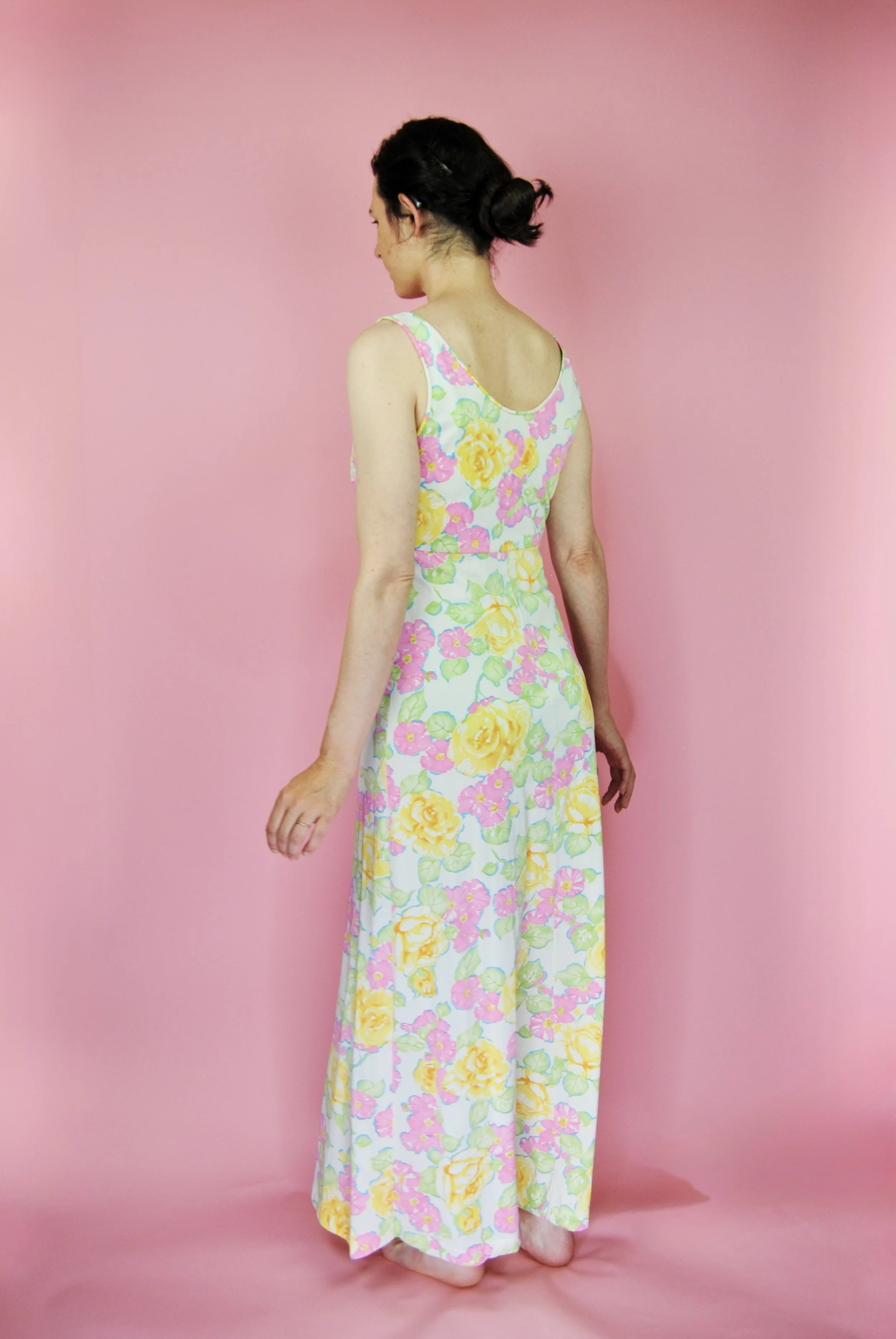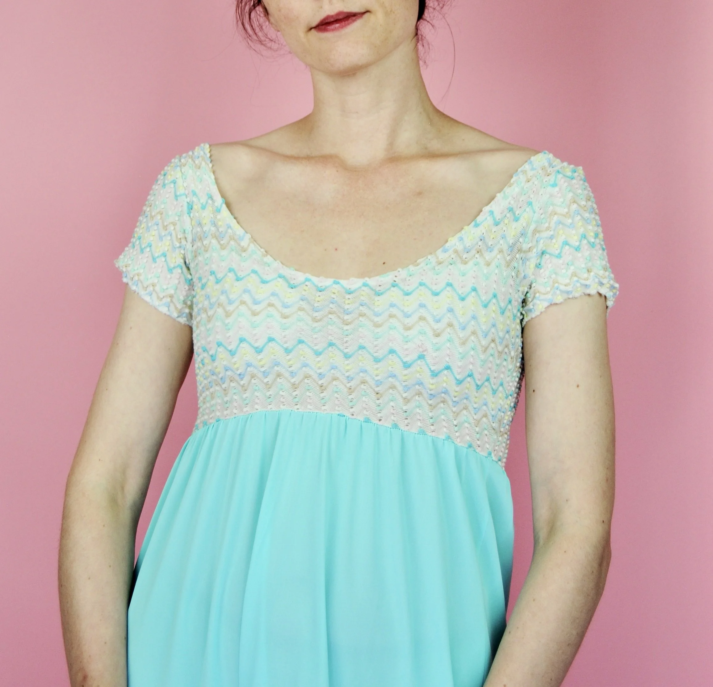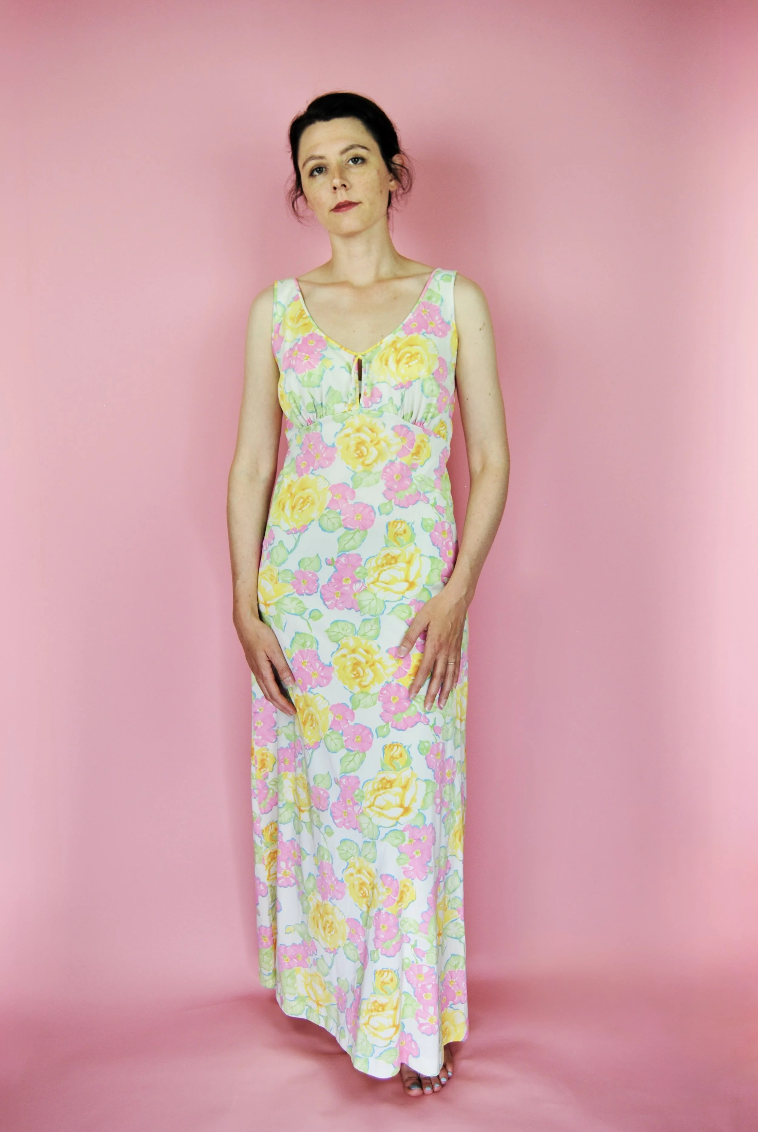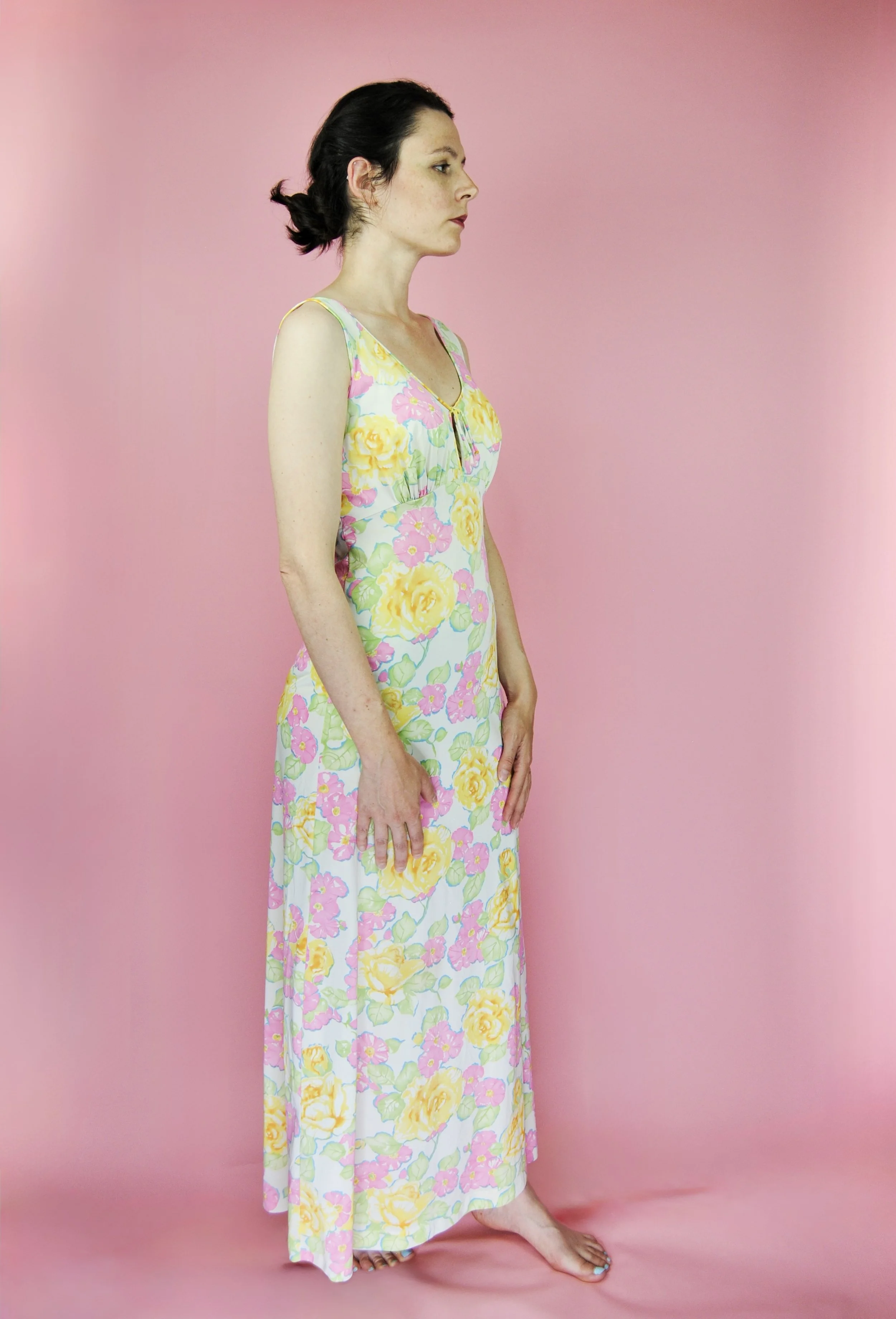 Such a lovely long night gown for any special occasion! Slightly sheer with some lovely lace detailing. Fabric tag says nylon on tricot. The label is for Vanity Fair and says size 36. You do want it to be somewhat loose and comfy as it is a nightgown. For reference, model is modern size 4/6 and dress form is size XS. Model is also wearing an additional slip underneath - you can see it in some pictures, especially at the bodice.