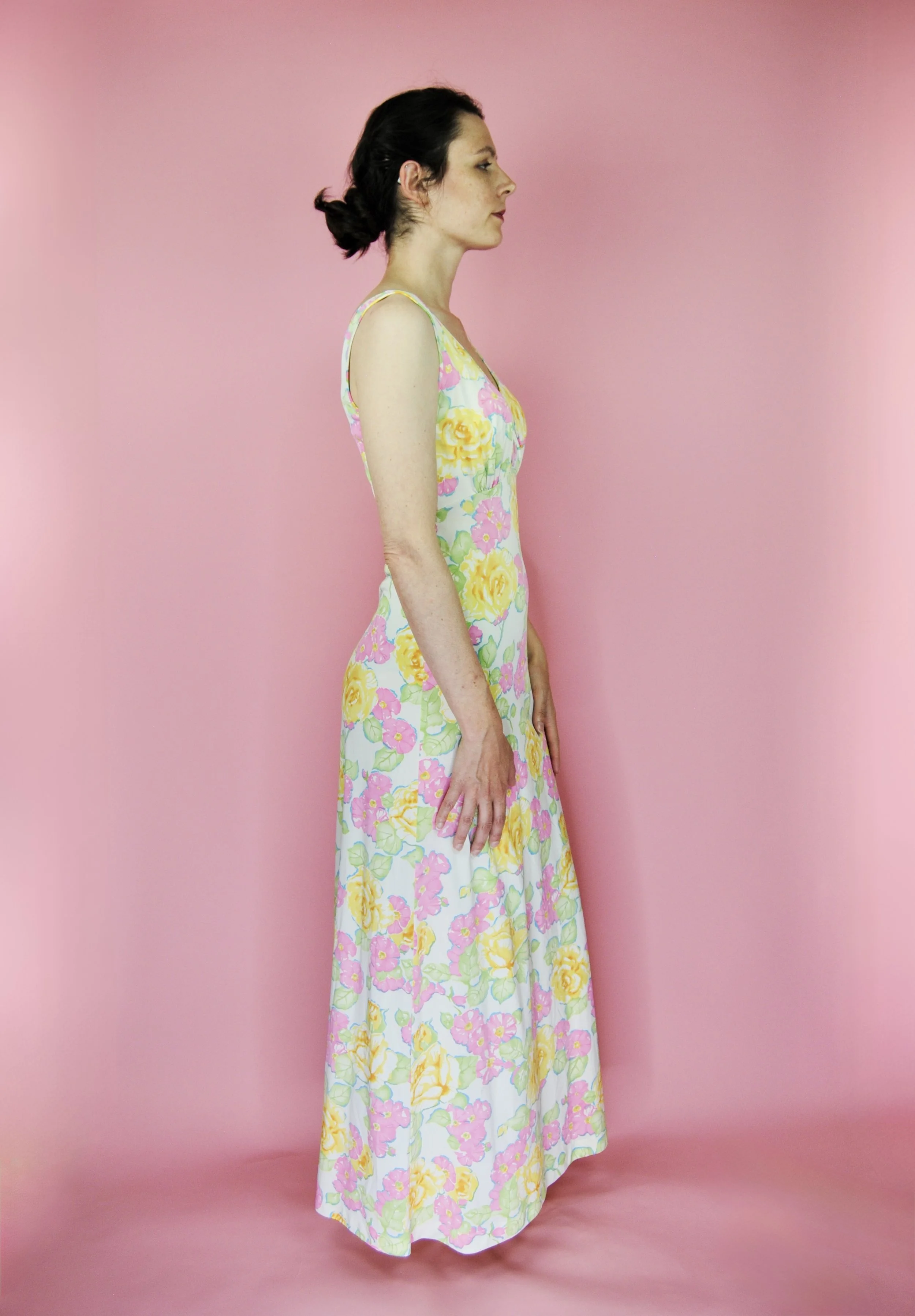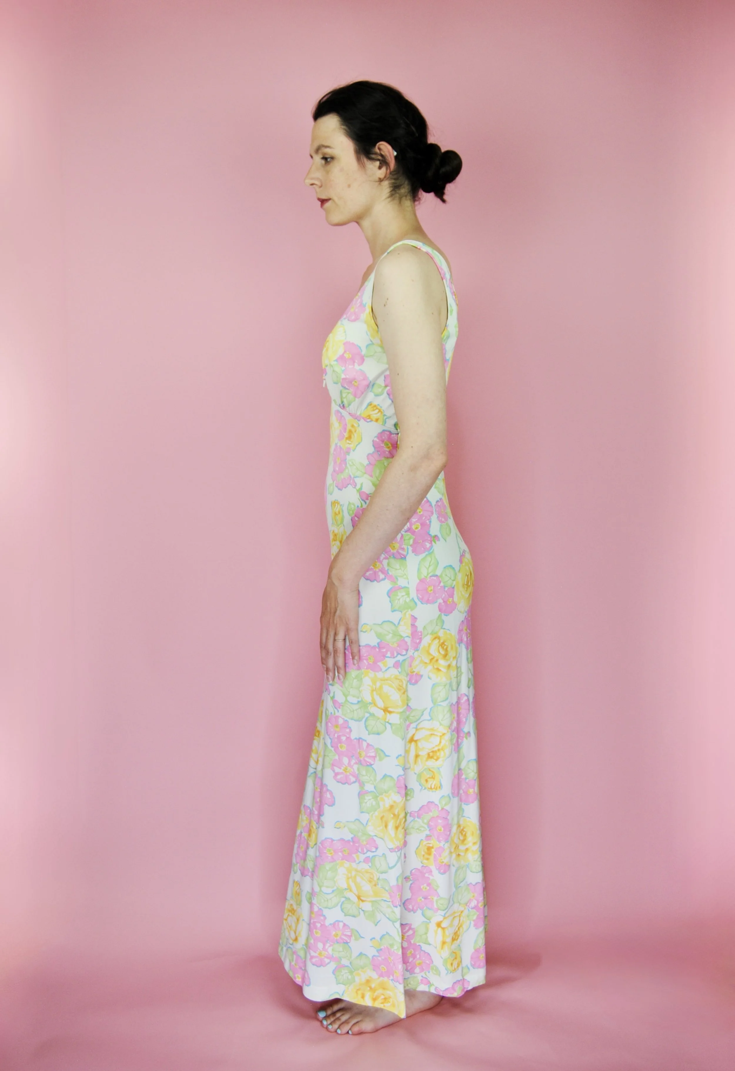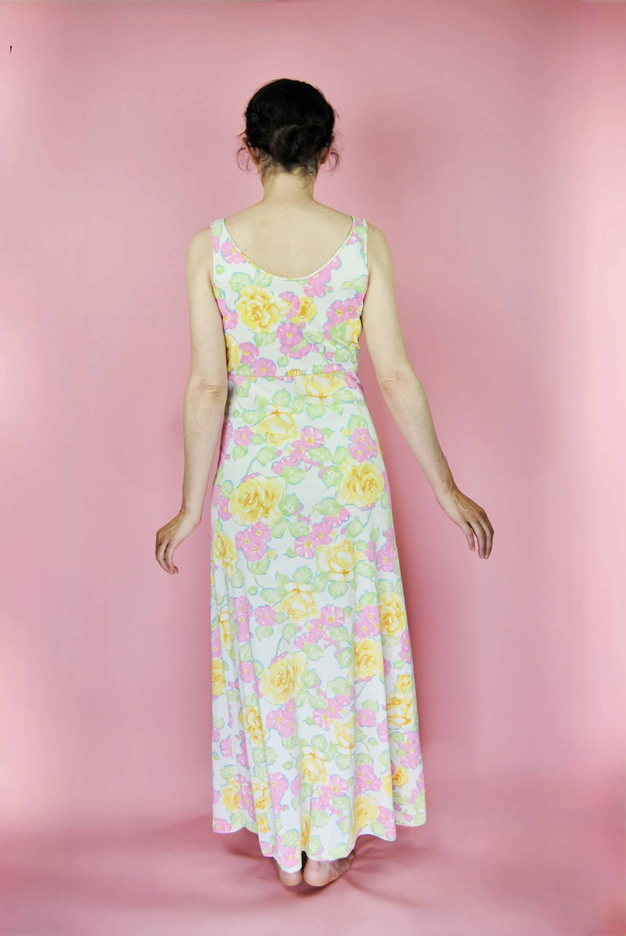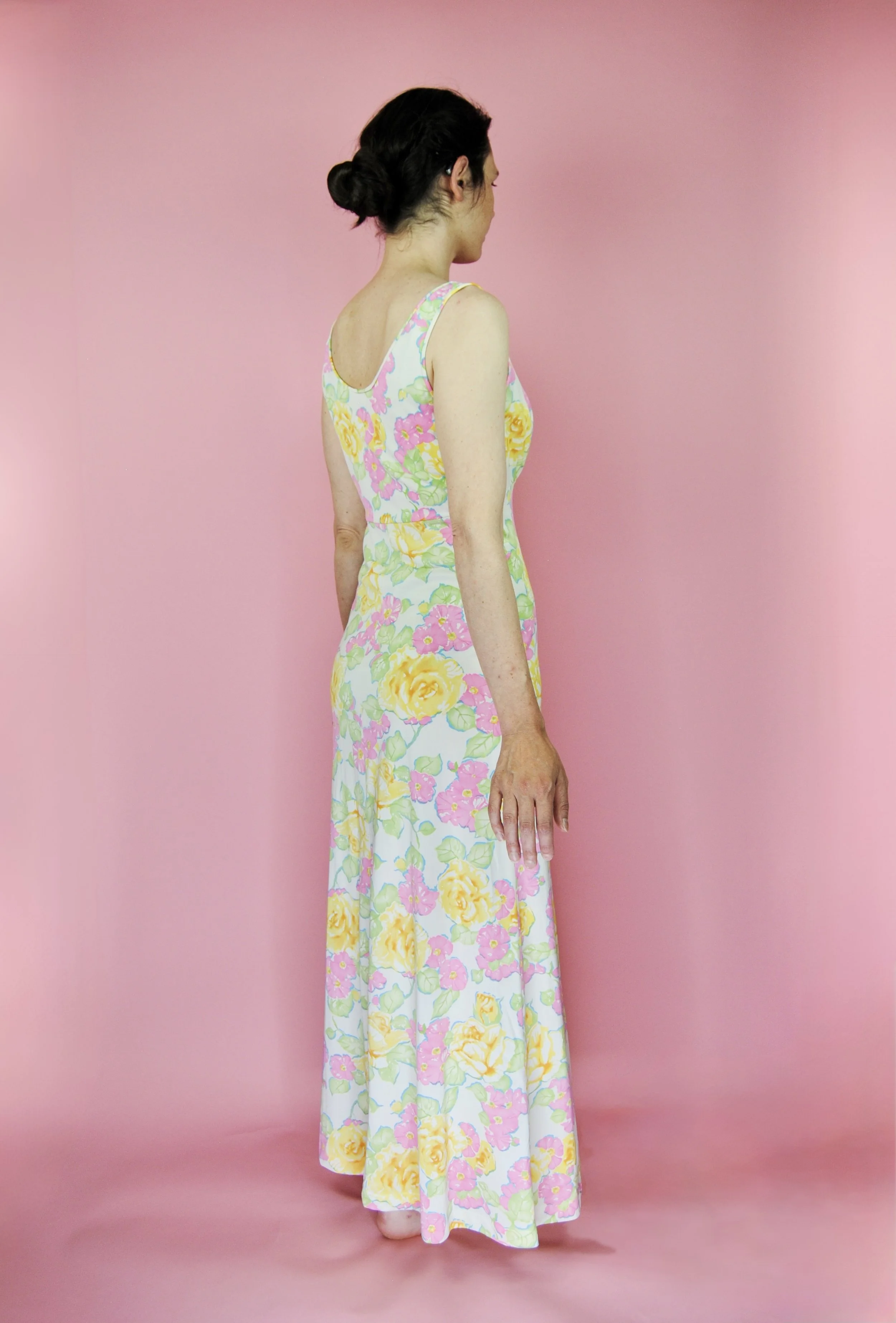 Such a lovely long night gown for any special occasion! Slightly sheer with some lovely lace detailing. Fabric tag says nylon on tricot. The label is for Vanity Fair and says size 36. You do want it to be somewhat loose and comfy as it is a nightgown. For reference, model is modern size 4/6 and dress form is size XS. Model is also wearing an additional slip underneath - you can see it in some pictures, especially at the bodice.