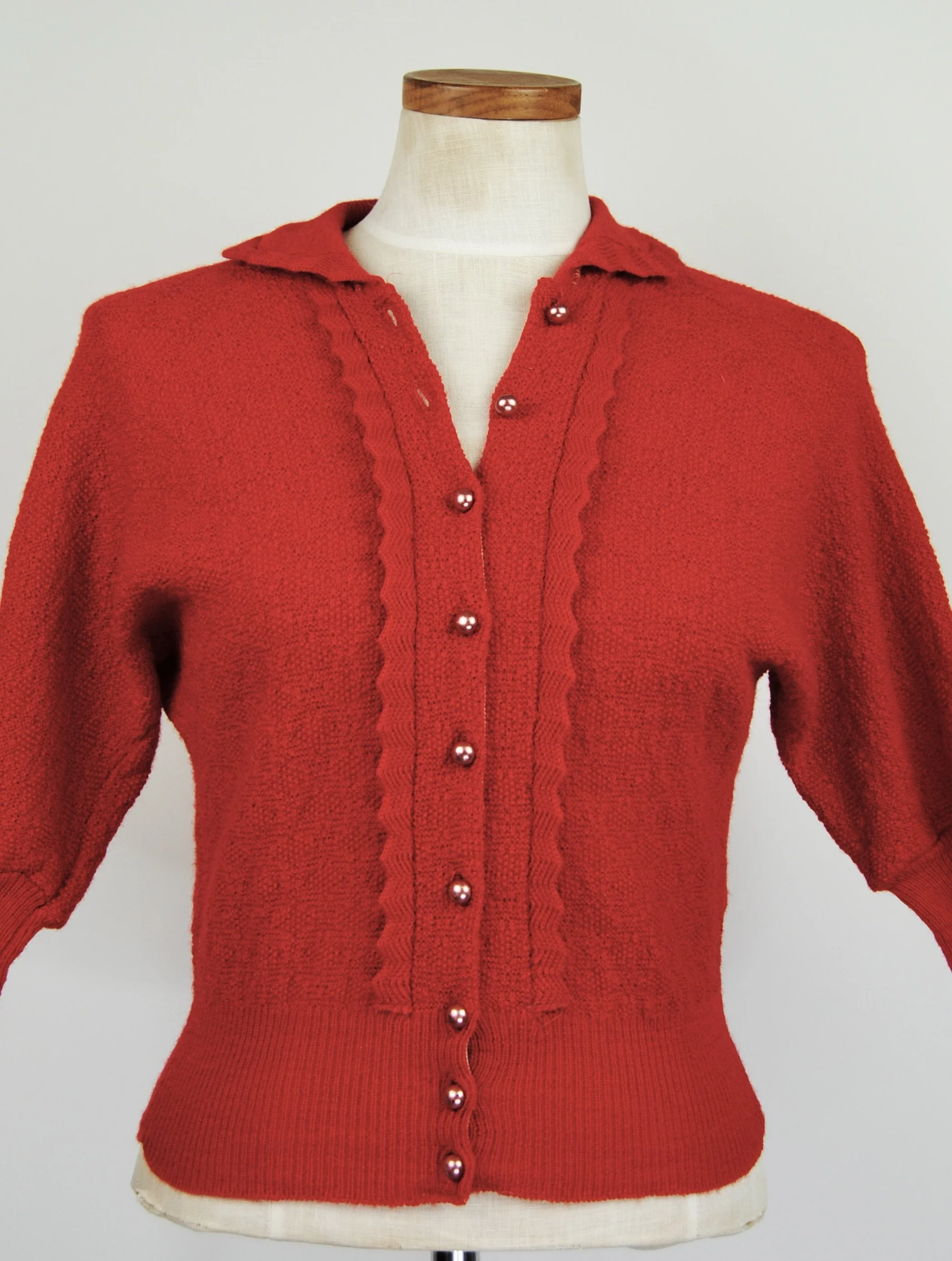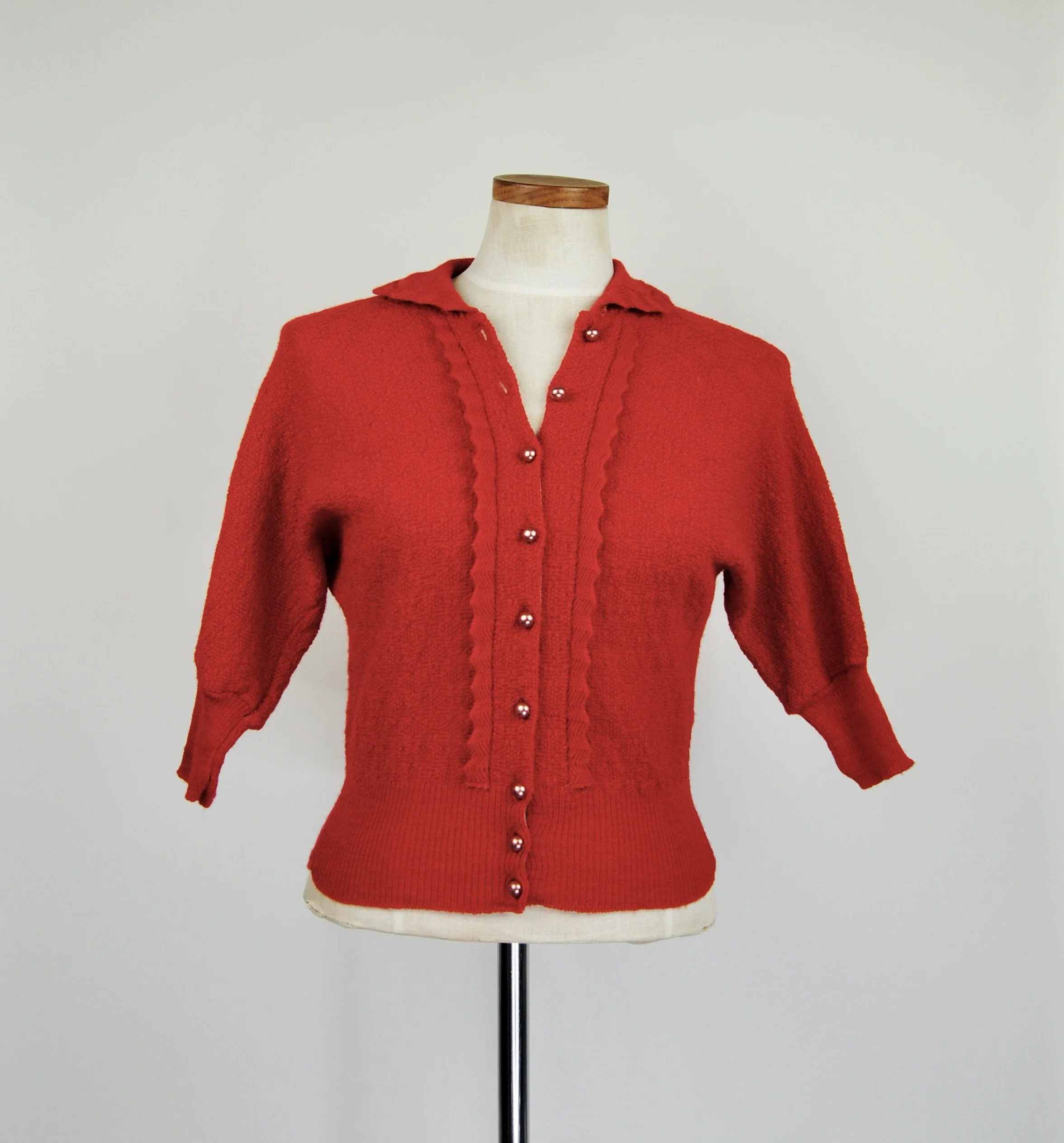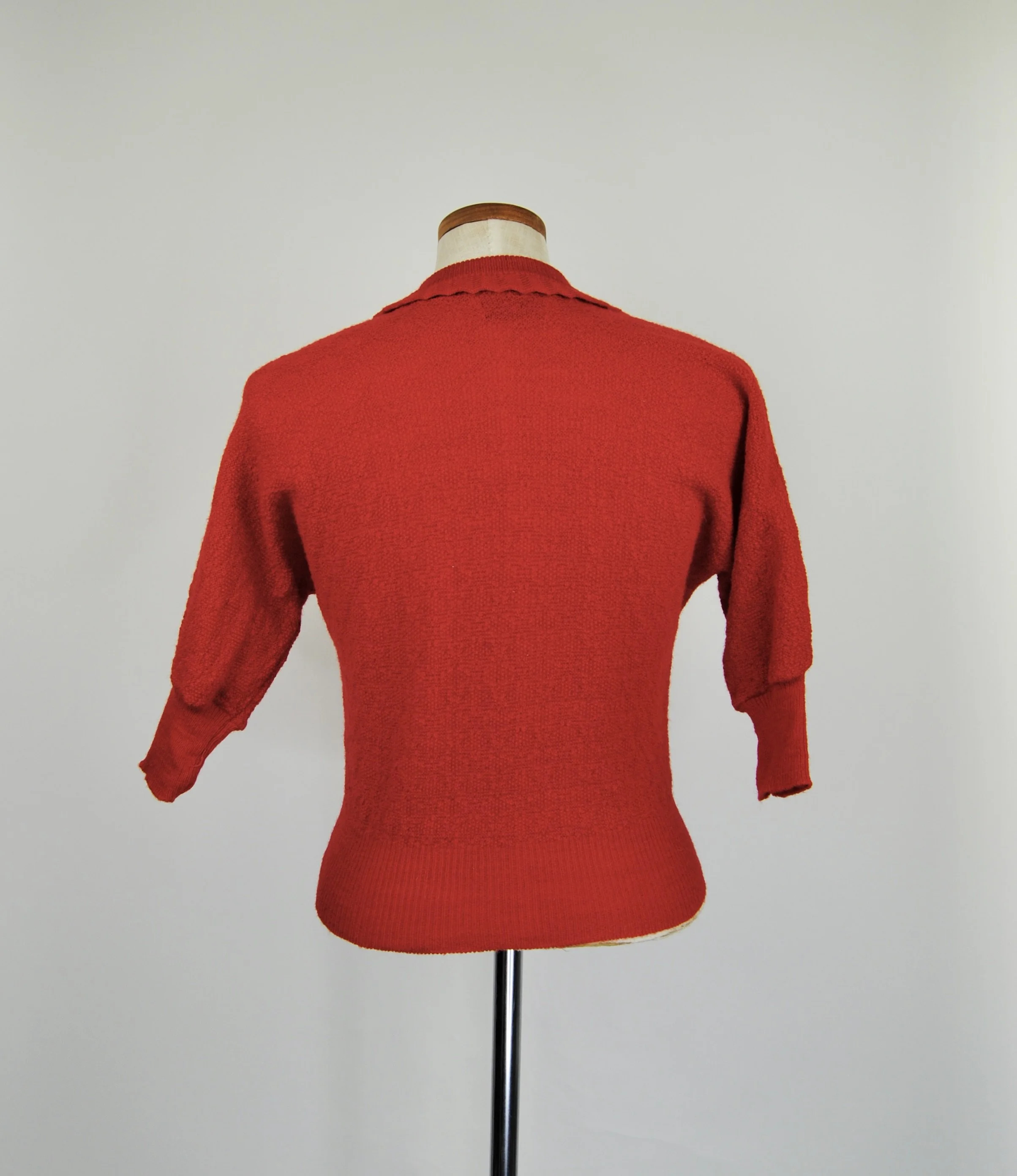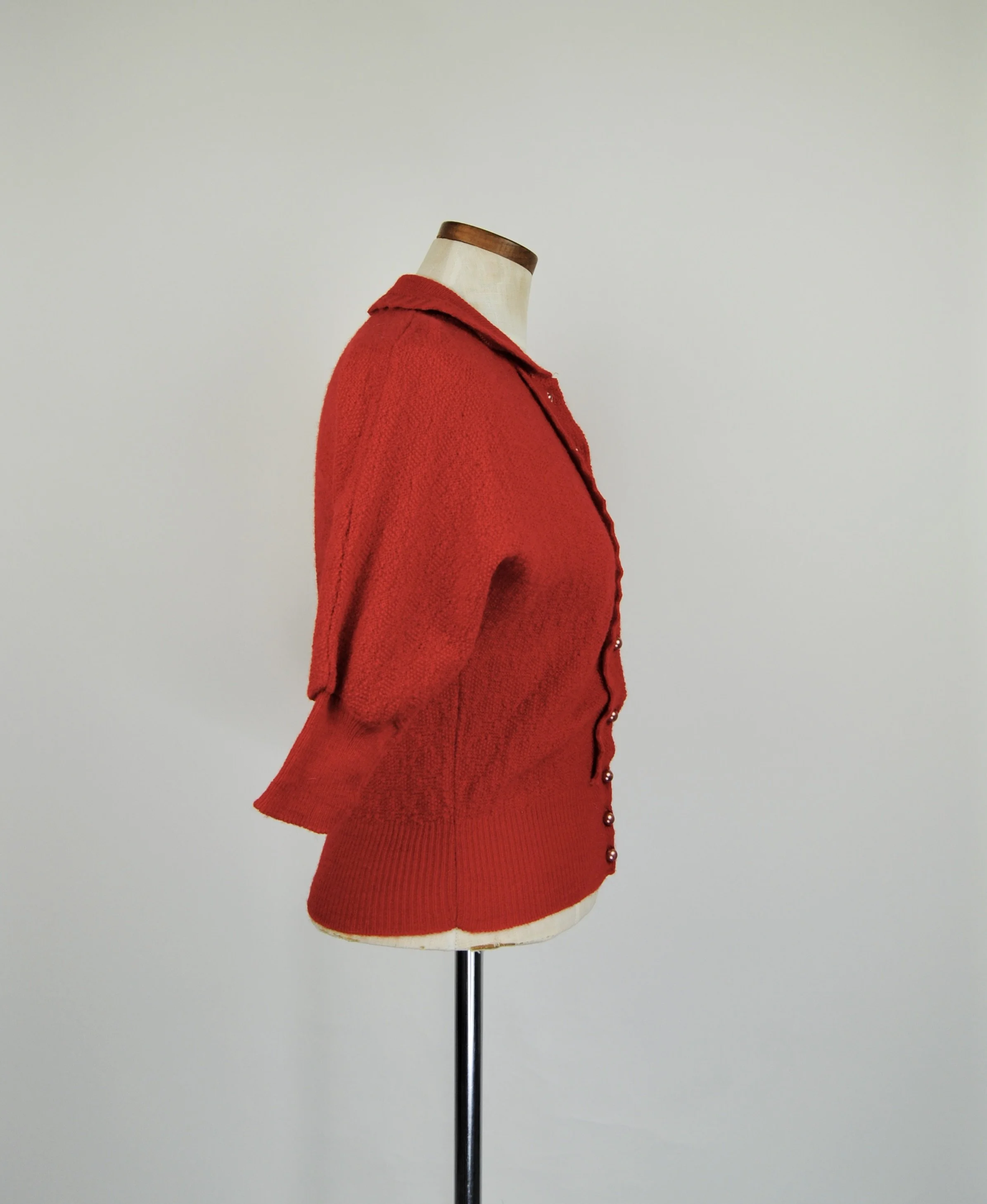 A lovely vintage 1950s knit set for the collector. The dark emerald green color is so lovely with the pearl buttons. The sweater buttons up the front and features dolman style sleeves. Skirt is a pull on. There was no label or size tag. Feels like wool. Would likely best fit a modern Medium, possibly a Large given the stretching capabilities of the knit and depending on how you like your sweaters to fit. For reference model is modern women’s size 4/6 and top was large in the bust. Dress form is a modern medium and sweater fit much better across the chest. Please see measurement - though remember there is a bit of give to the fabric.
