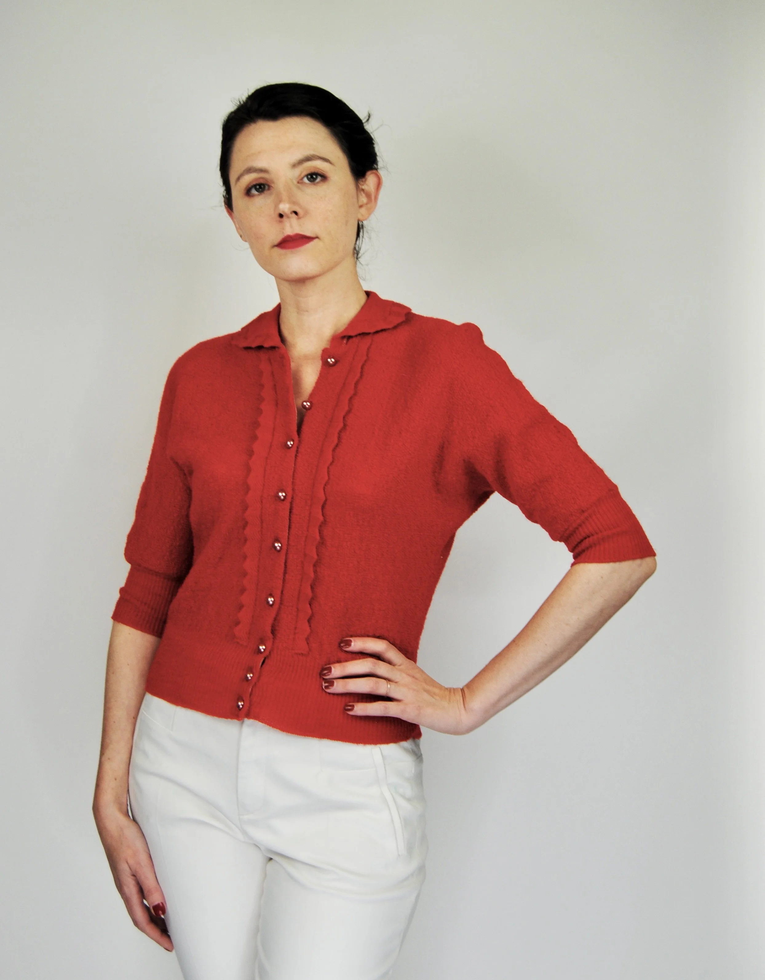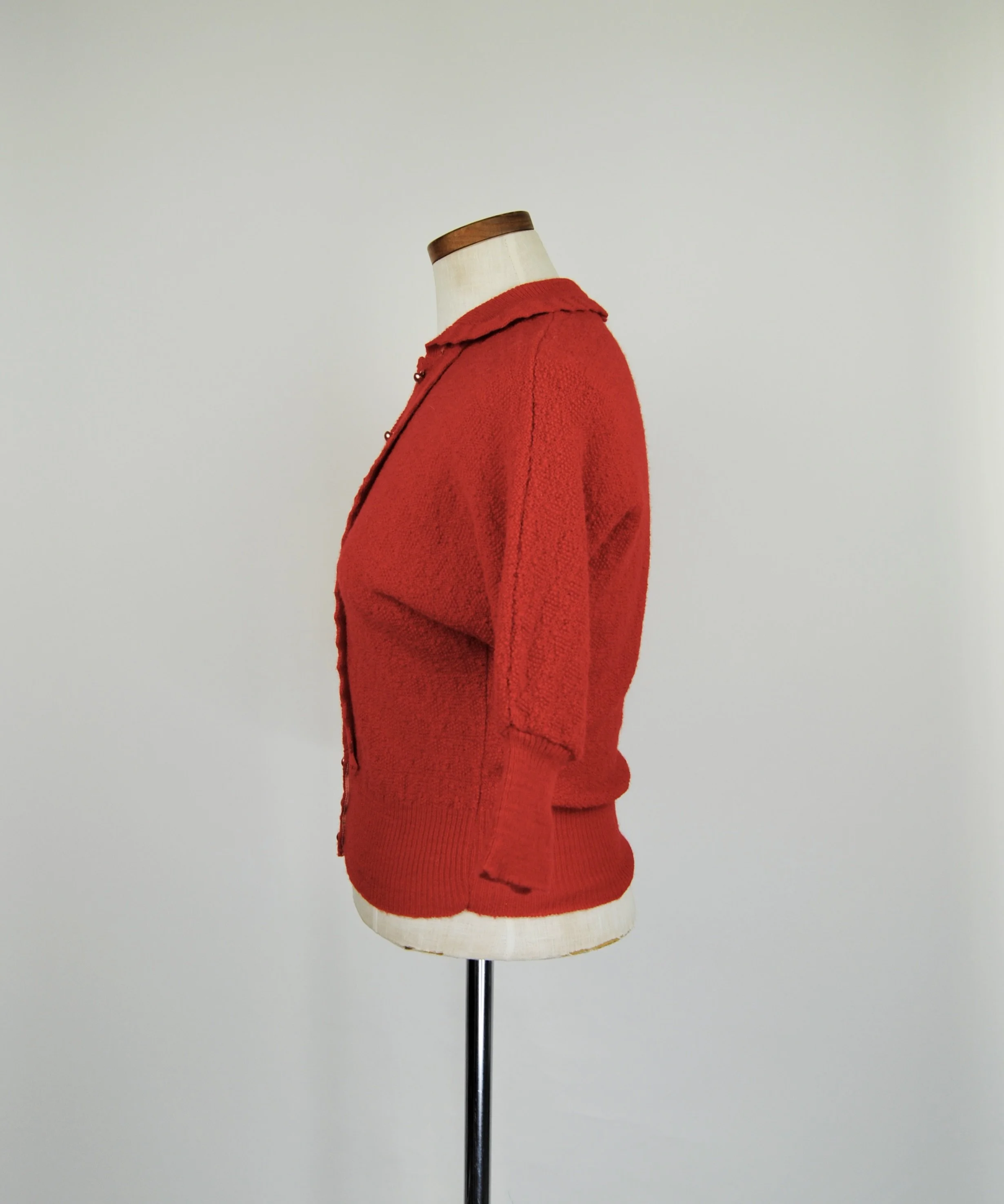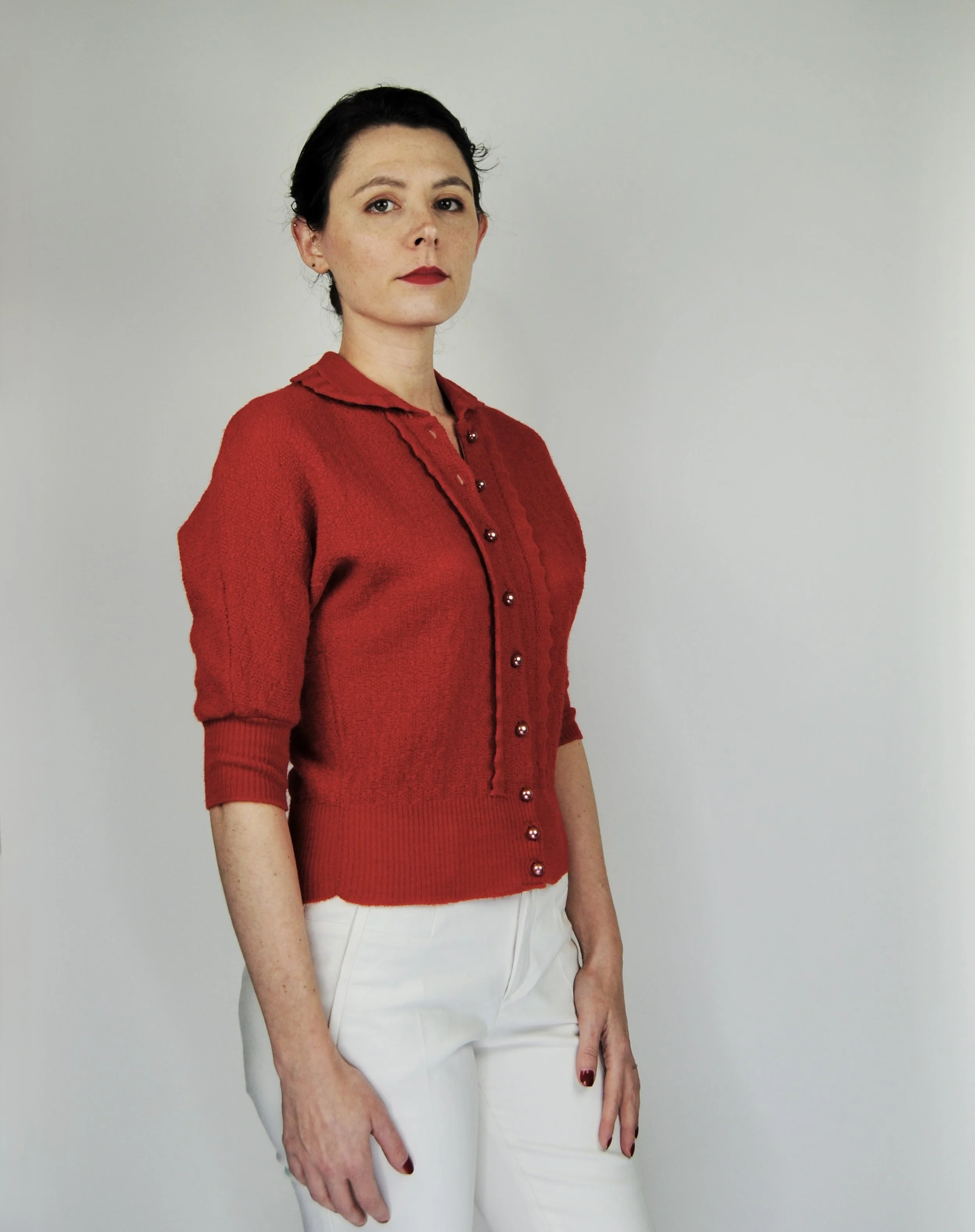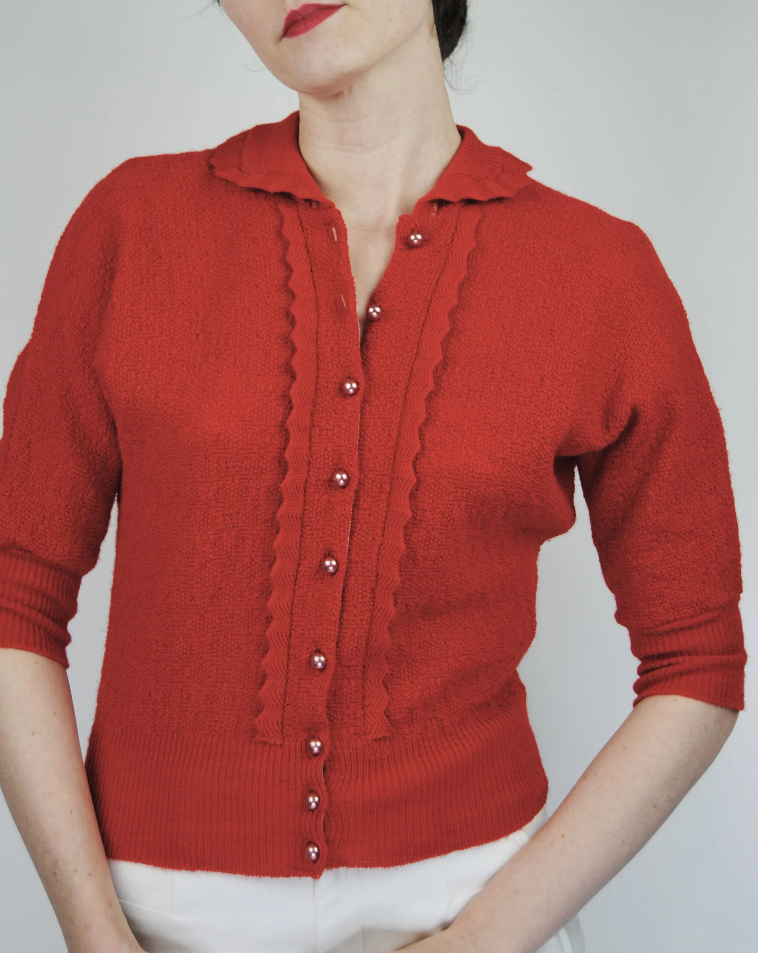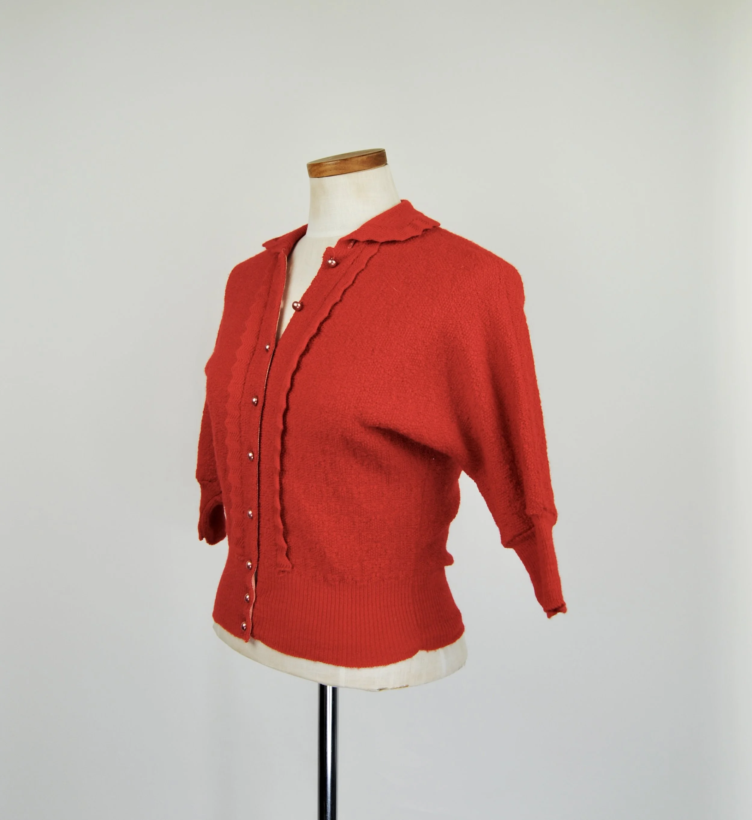 A lovely vintage 1950s knit set for the collector. The dark emerald green color is so lovely with the pearl buttons. The sweater buttons up the front and features dolman style sleeves. Skirt is a pull on. There was no label or size tag. Feels like wool. Would likely best fit a modern Medium, possibly a Large given the stretching capabilities of the knit and depending on how you like your sweaters to fit. For reference model is modern women’s size 4/6 and top was large in the bust. Dress form is a modern medium and sweater fit much better across the chest. Please see measurement - though remember there is a bit of give to the fabric.