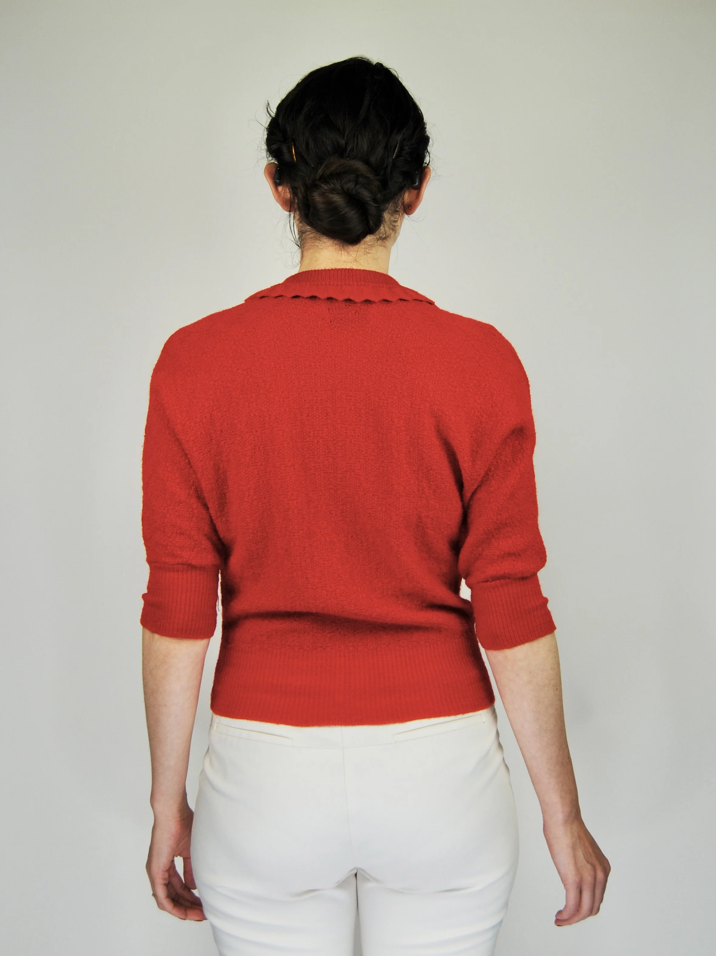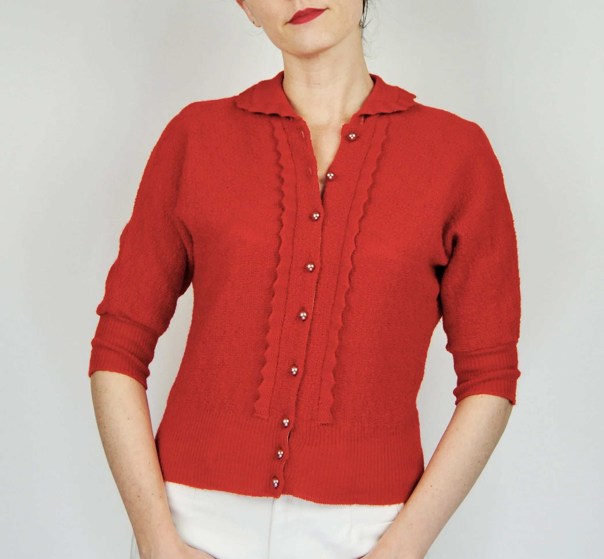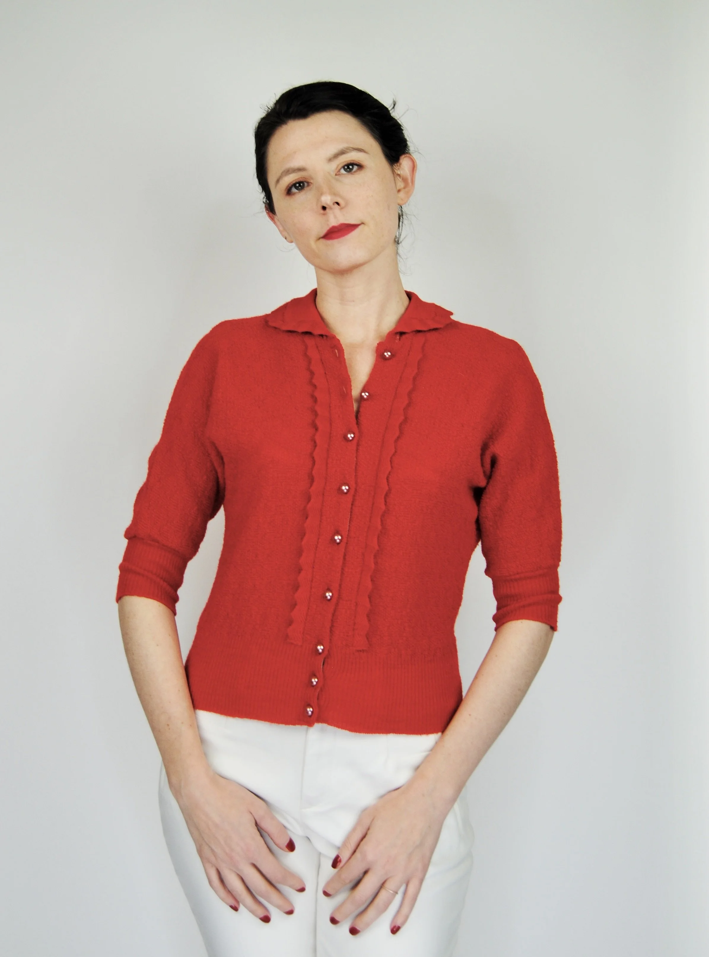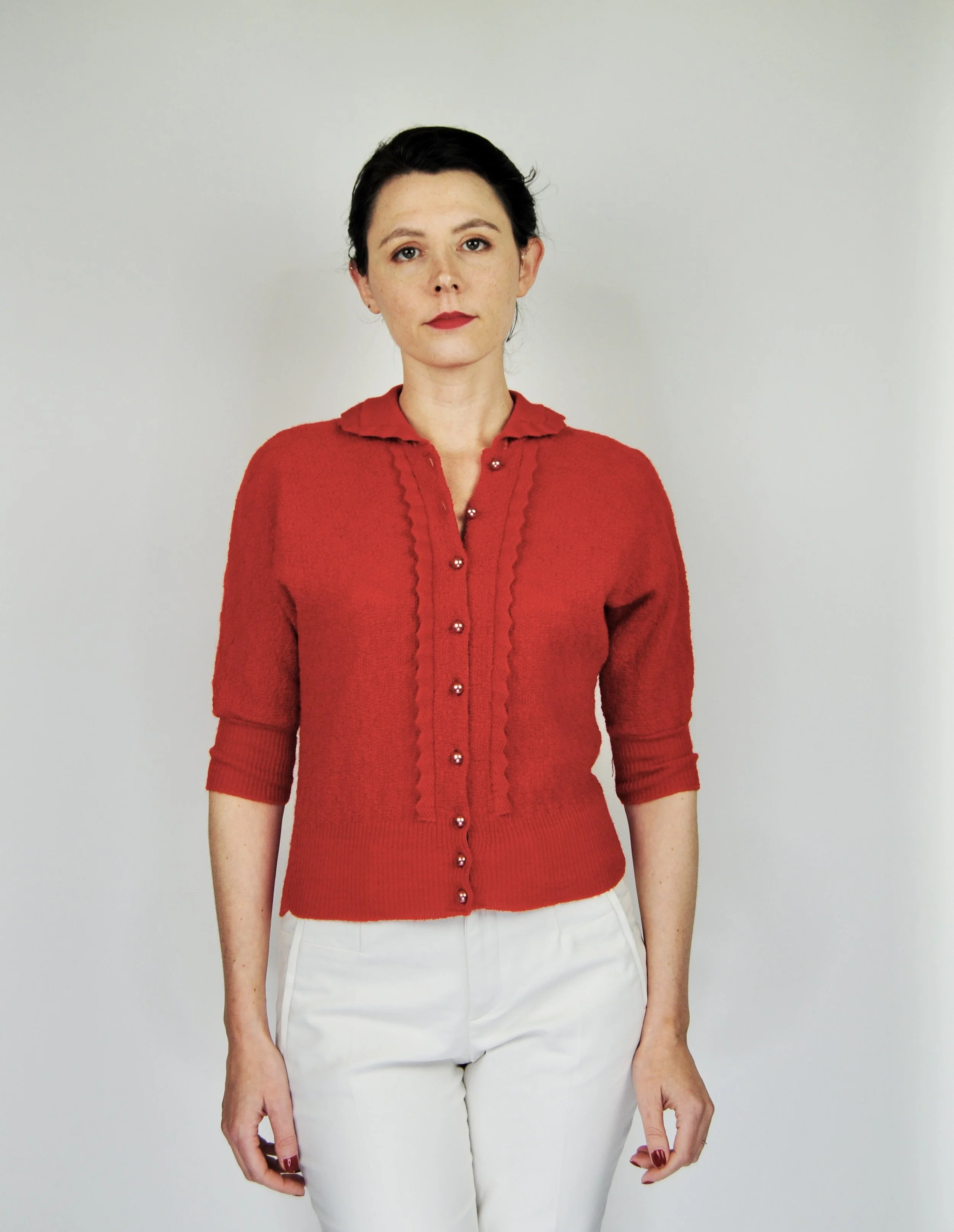 A lovely vintage 1950s knit set for the collector. The dark emerald green color is so lovely with the pearl buttons. The sweater buttons up the front and features dolman style sleeves. Skirt is a pull on. There was no label or size tag. Feels like wool. Would likely best fit a modern Medium, possibly a Large given the stretching capabilities of the knit and depending on how you like your sweaters to fit. For reference model is modern women’s size 4/6 and top was large in the bust. Dress form is a modern medium and sweater fit much better across the chest. Please see measurement - though remember there is a bit of give to the fabric.