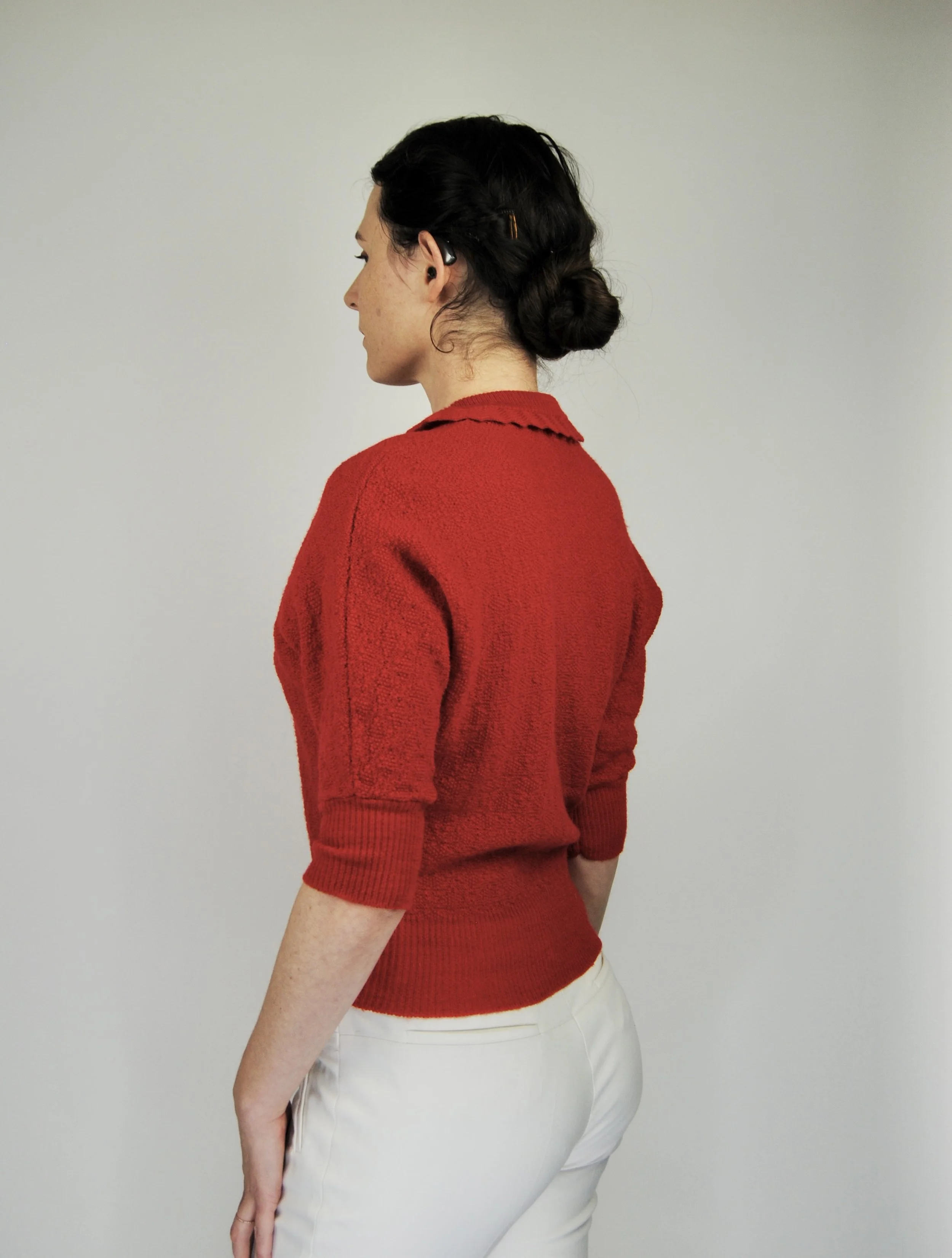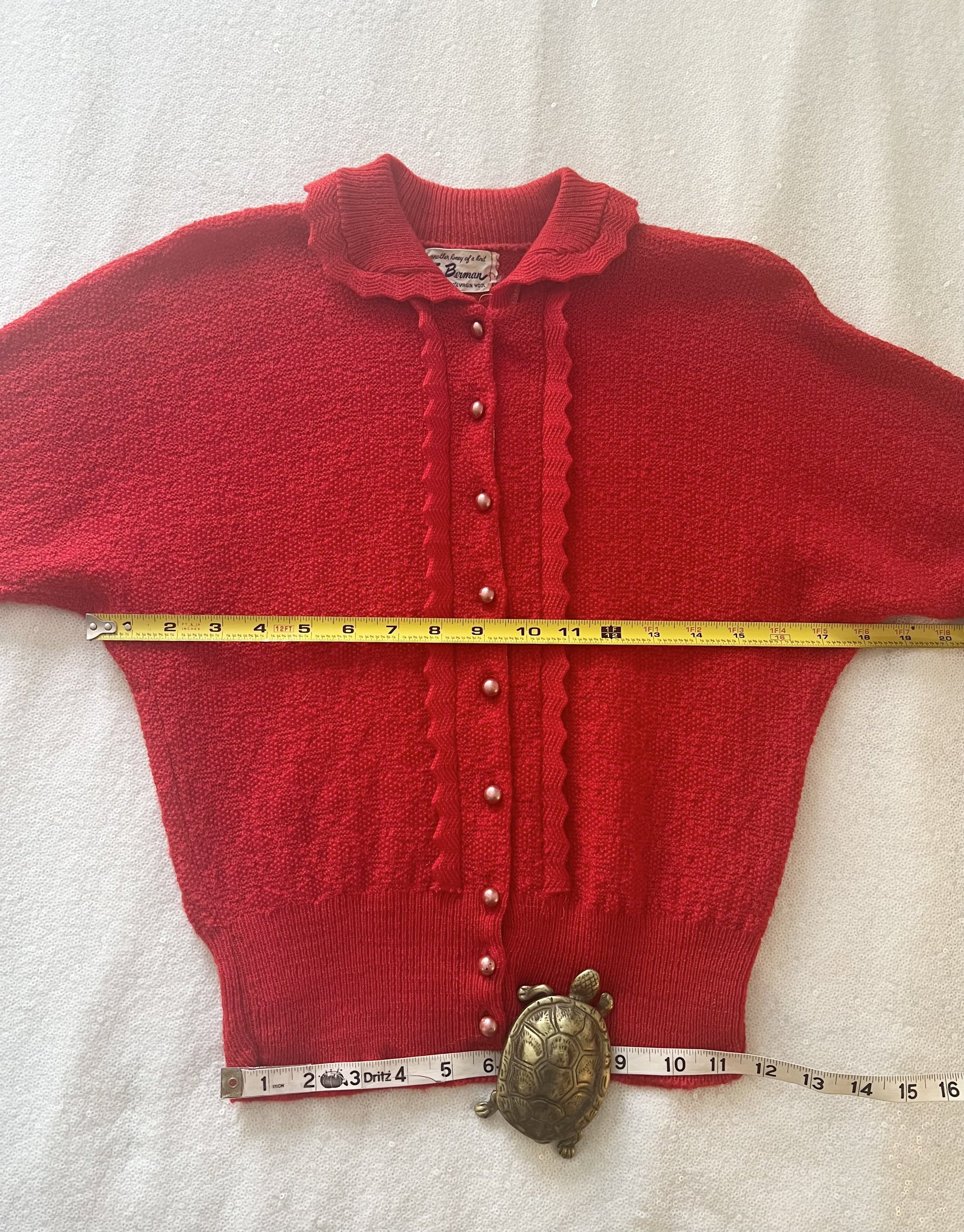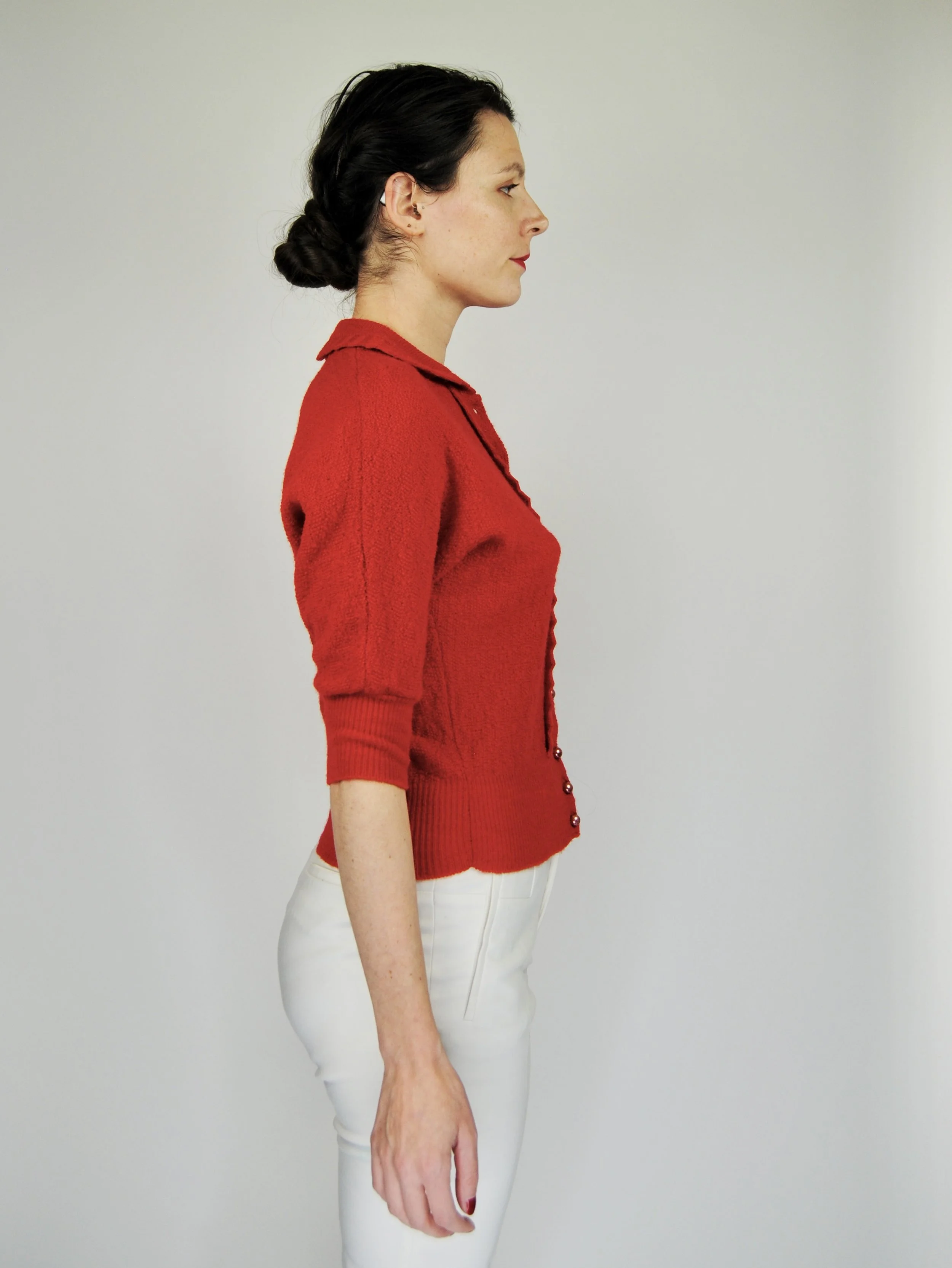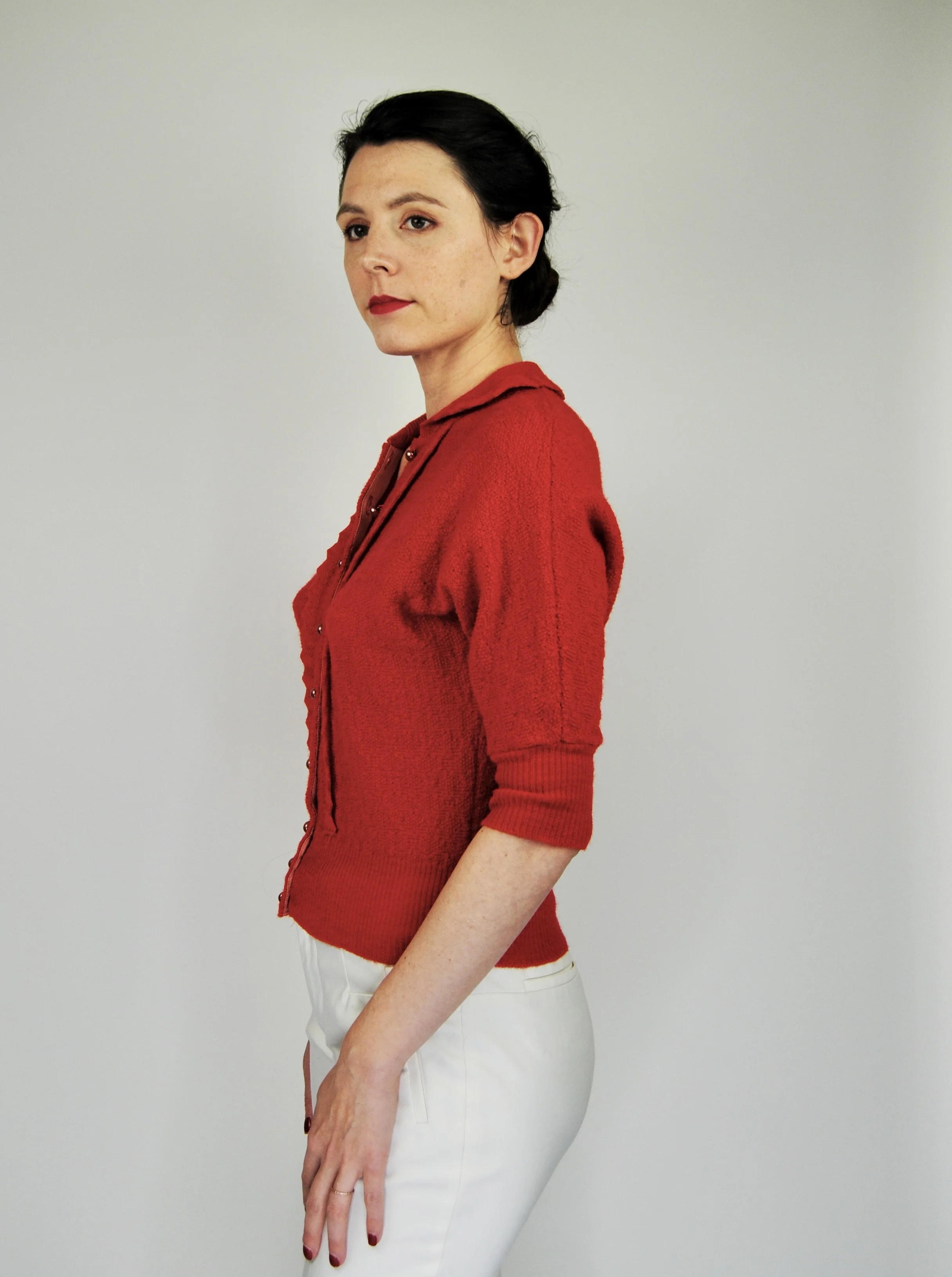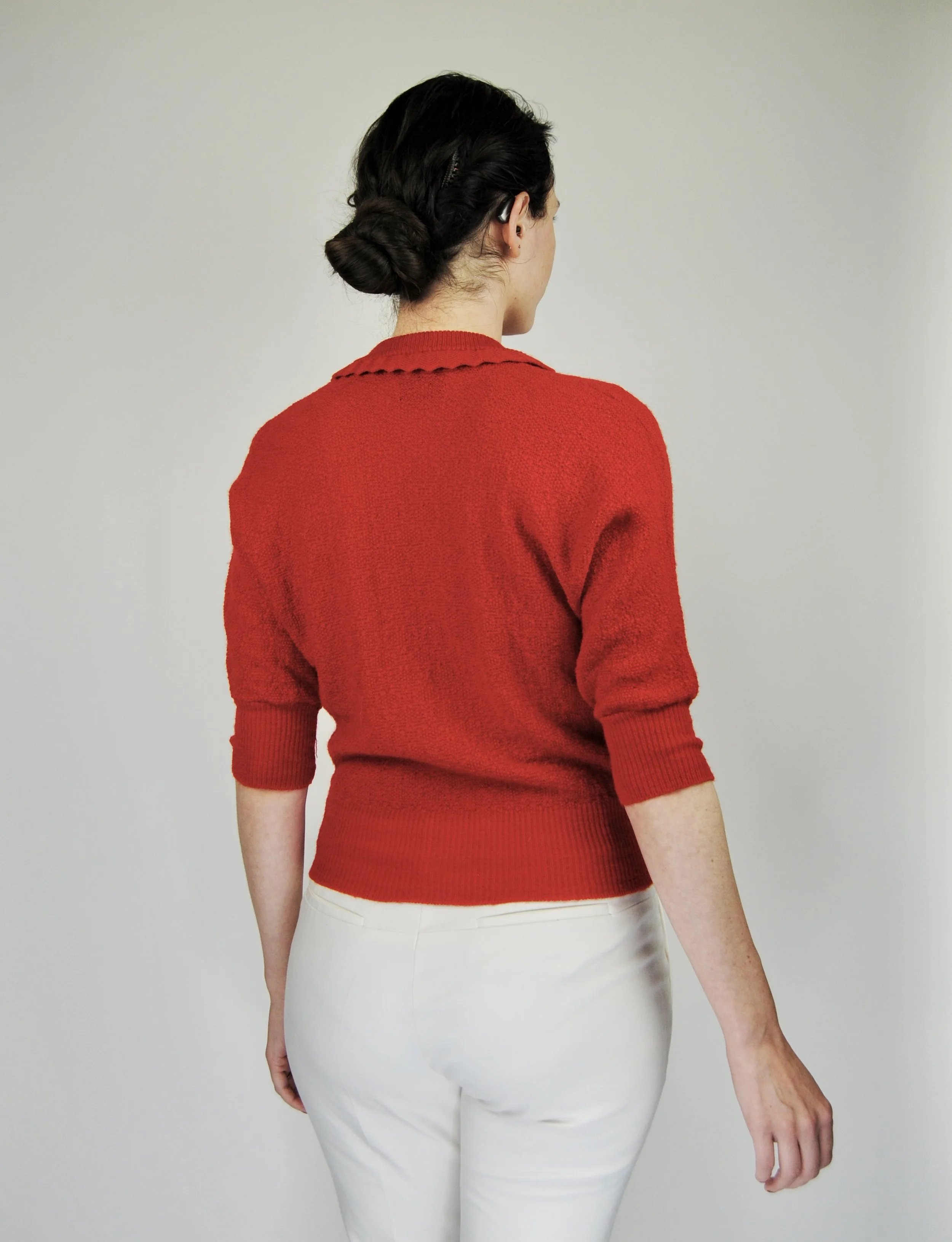 A lovely vintage 1950s knit set for the collector. The dark emerald green color is so lovely with the pearl buttons. The sweater buttons up the front and features dolman style sleeves. Skirt is a pull on. There was no label or size tag. Feels like wool. Would likely best fit a modern Medium, possibly a Large given the stretching capabilities of the knit and depending on how you like your sweaters to fit. For reference model is modern women’s size 4/6 and top was large in the bust. Dress form is a modern medium and sweater fit much better across the chest. Please see measurement - though remember there is a bit of give to the fabric.