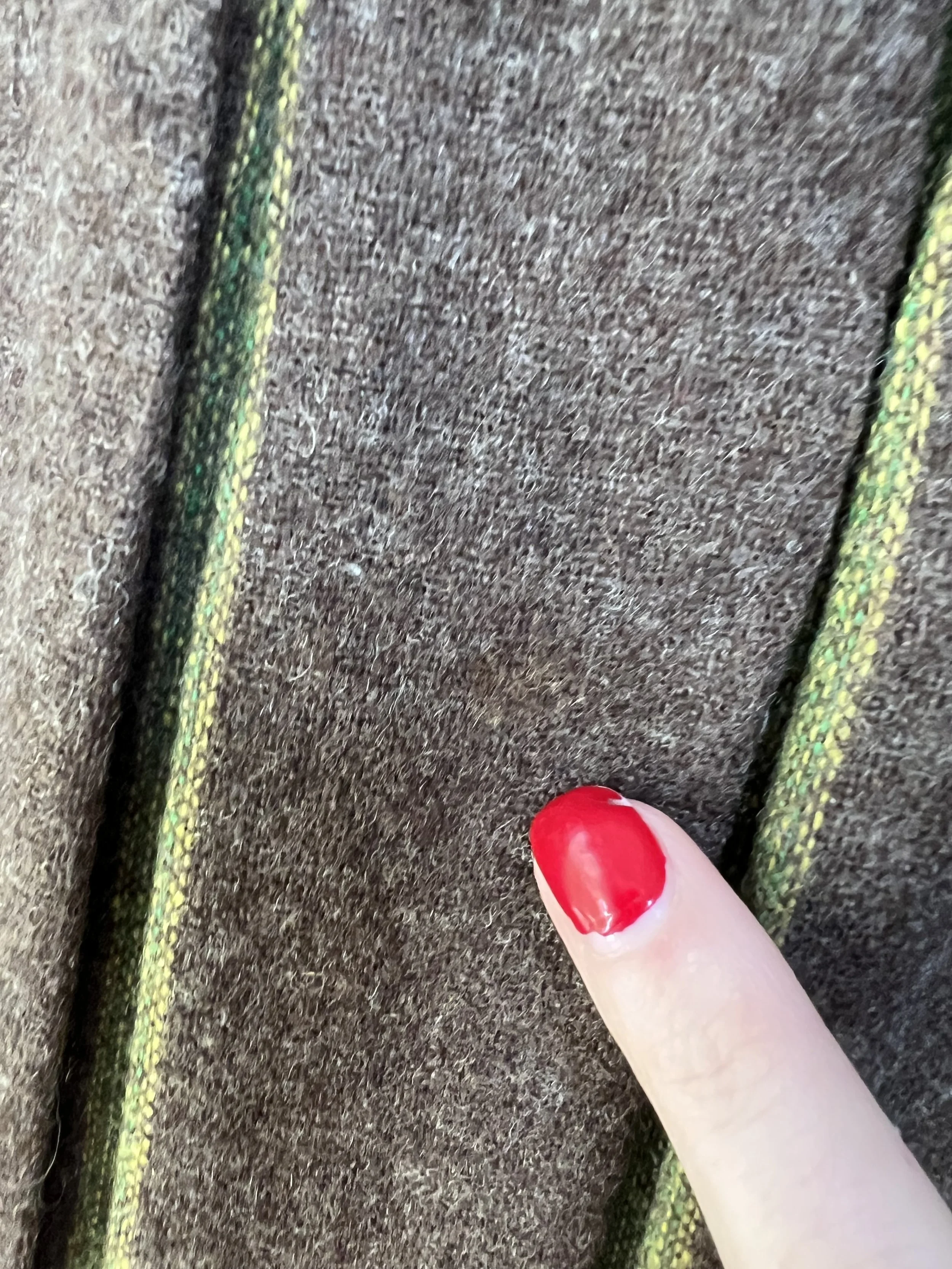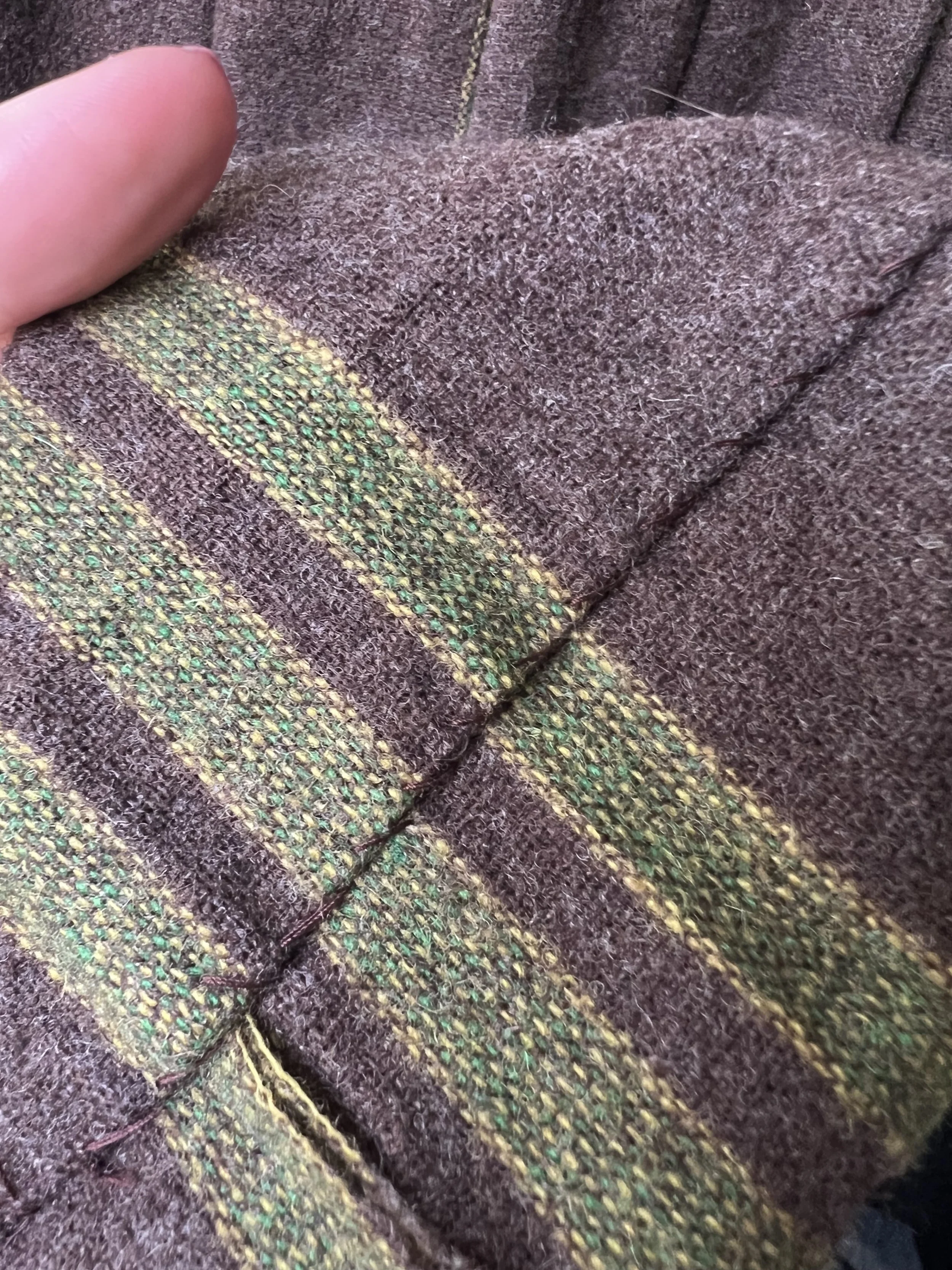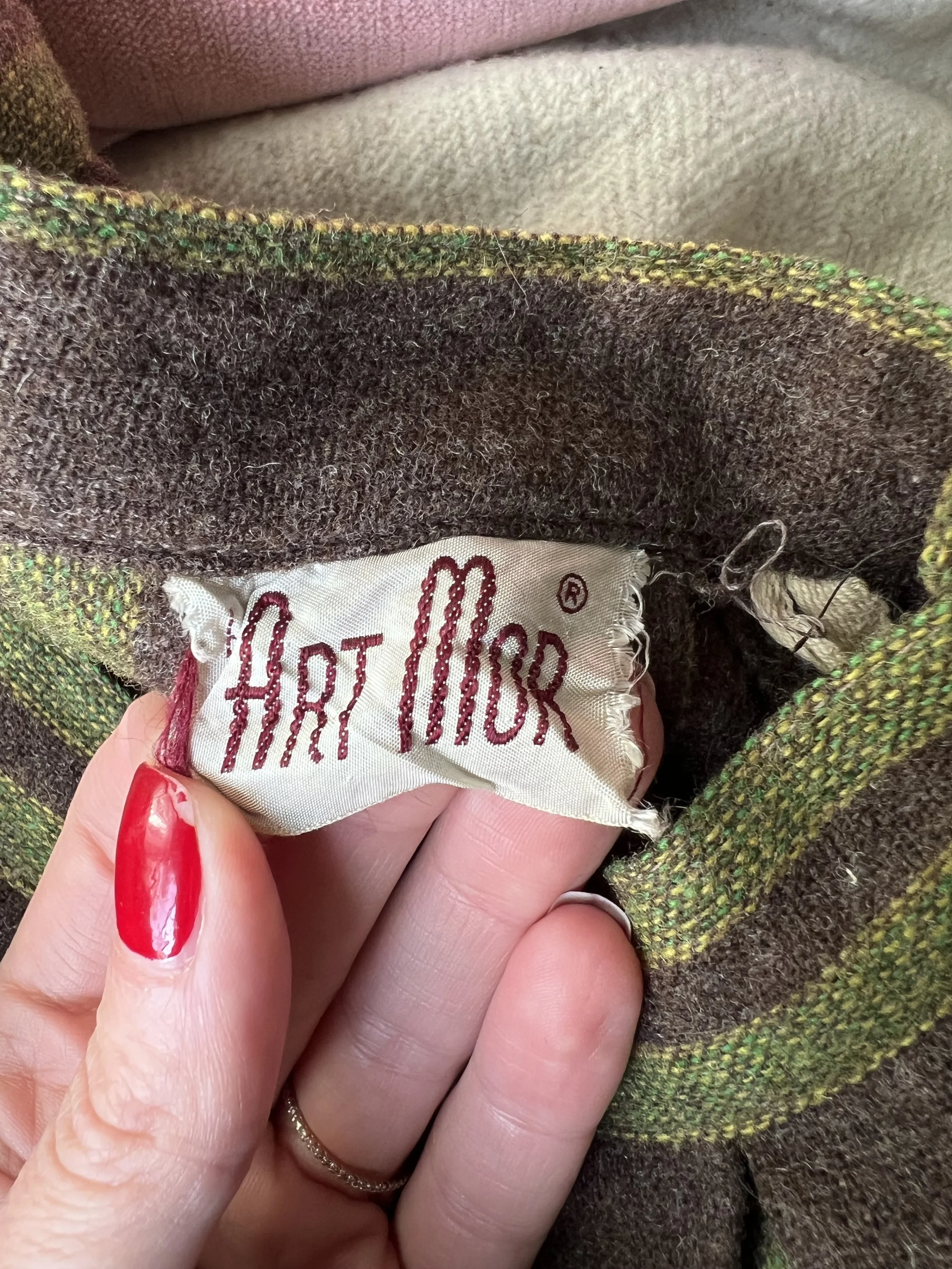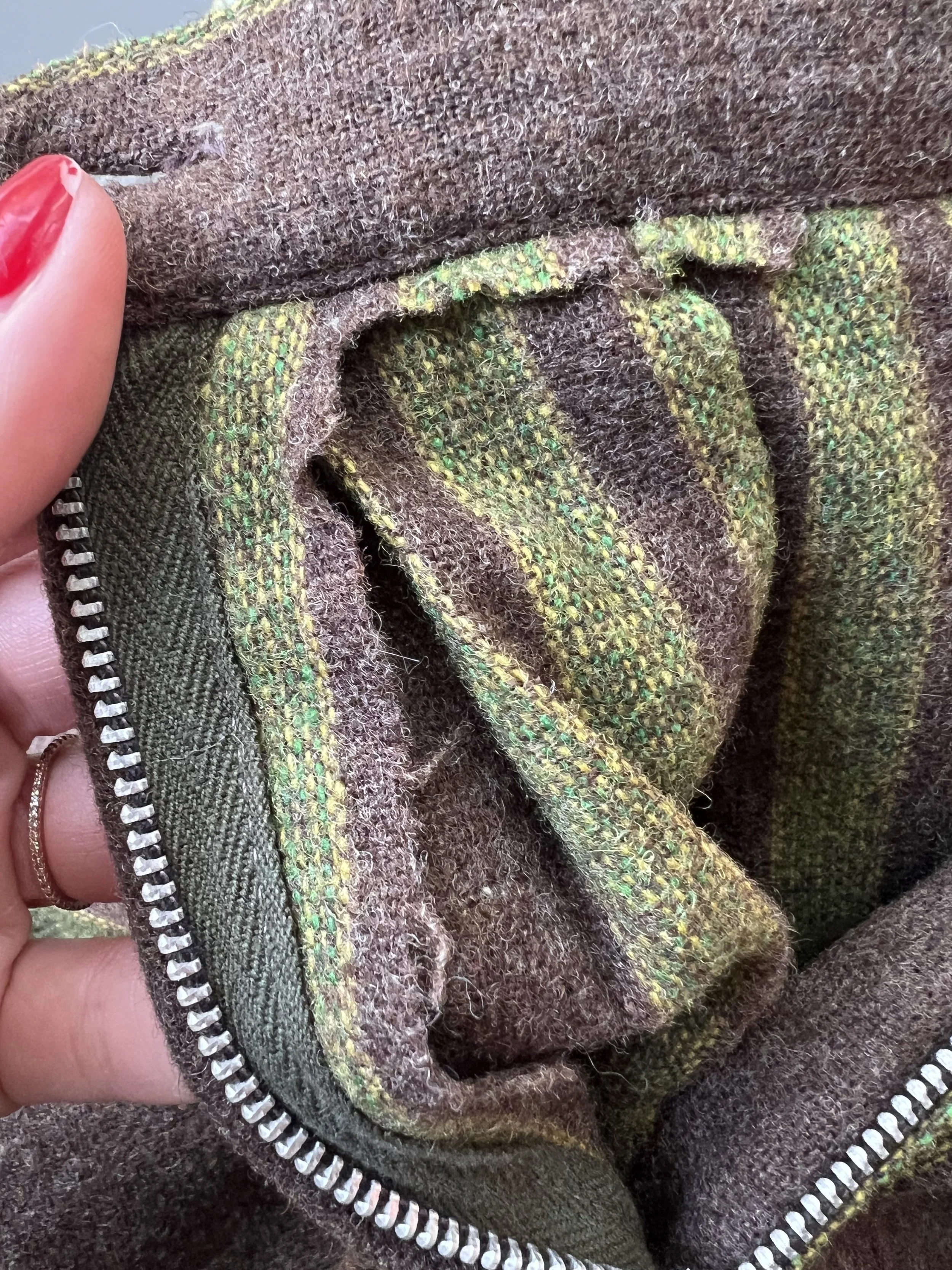 Good Vintage Condition- Some overall expected wear to piece. A few areas of very small pulls or pilling/ fuzzing/ faint spots. Some wear to the interior lining of the piece including some slight discoloration and small holes. Marks to tag. Very small pin hole found at the back of the neck on the green trim of the piece. Slight discoloration to that same piping right at the edge. Not obvious though unless looking very close.