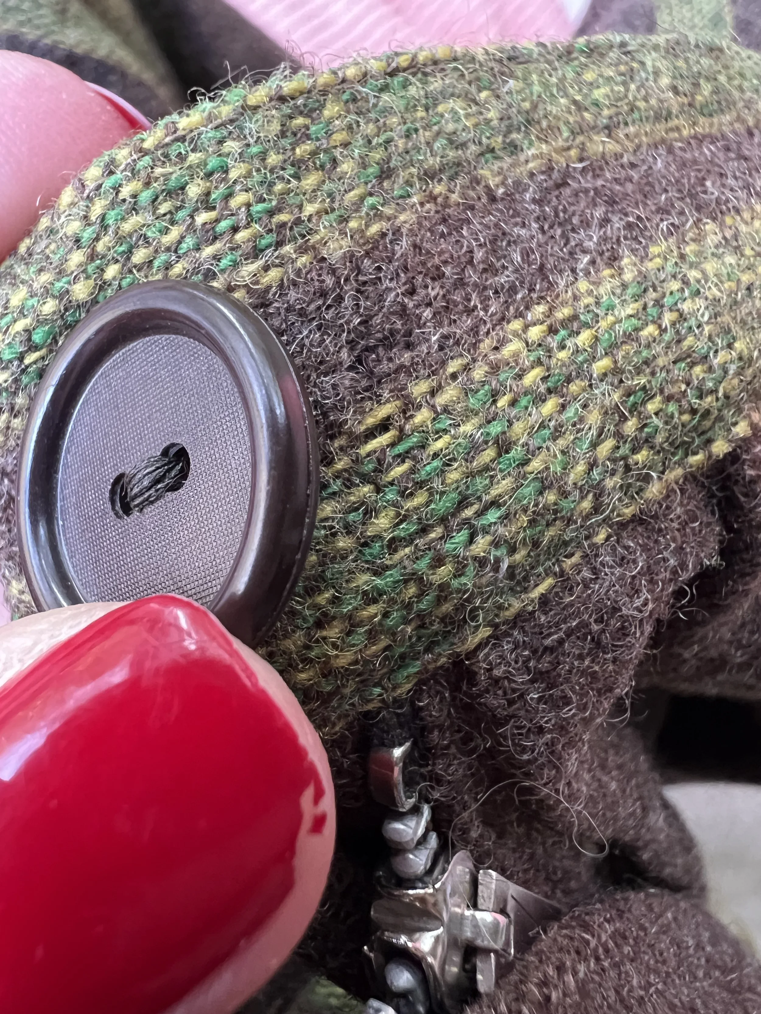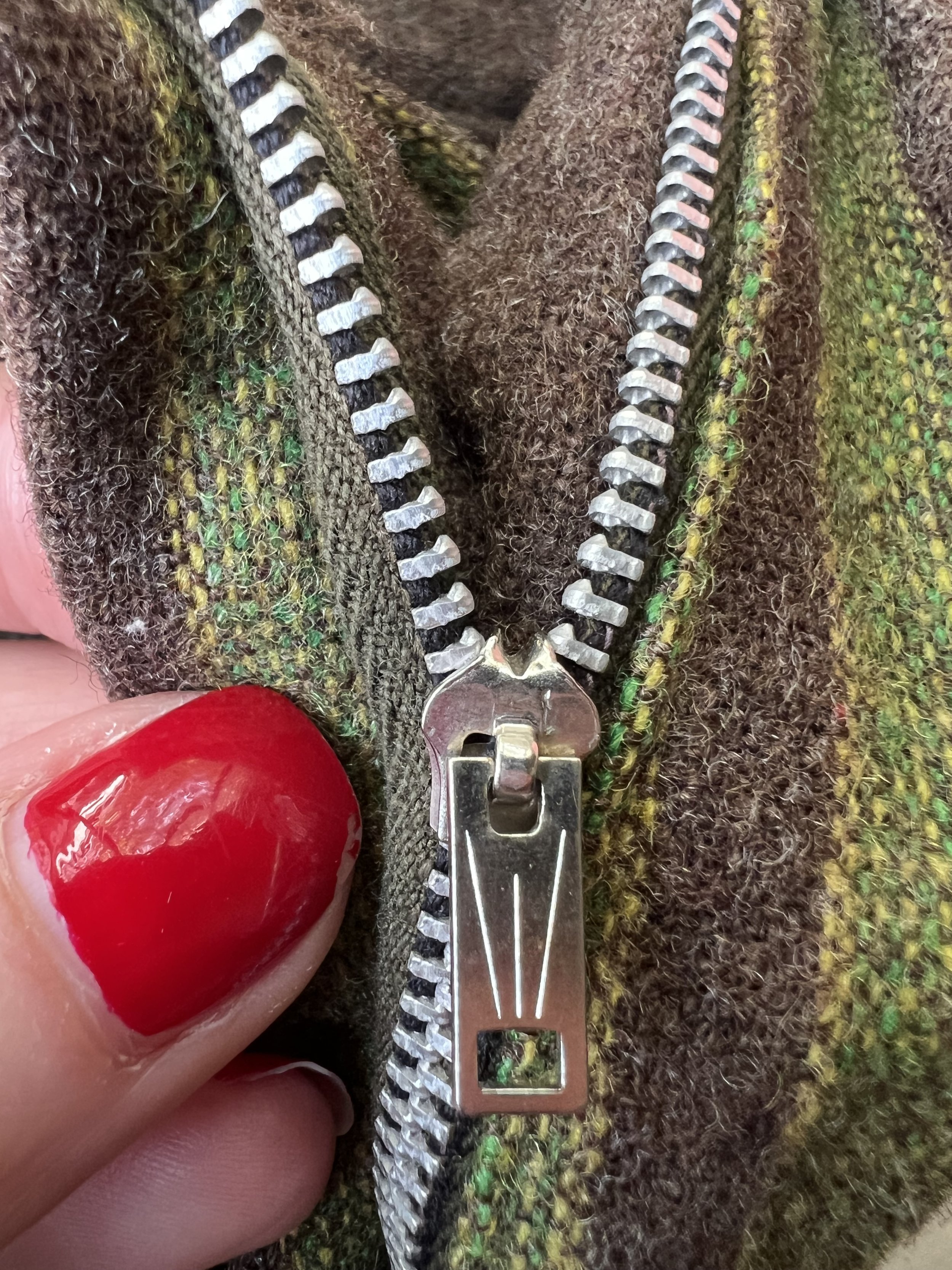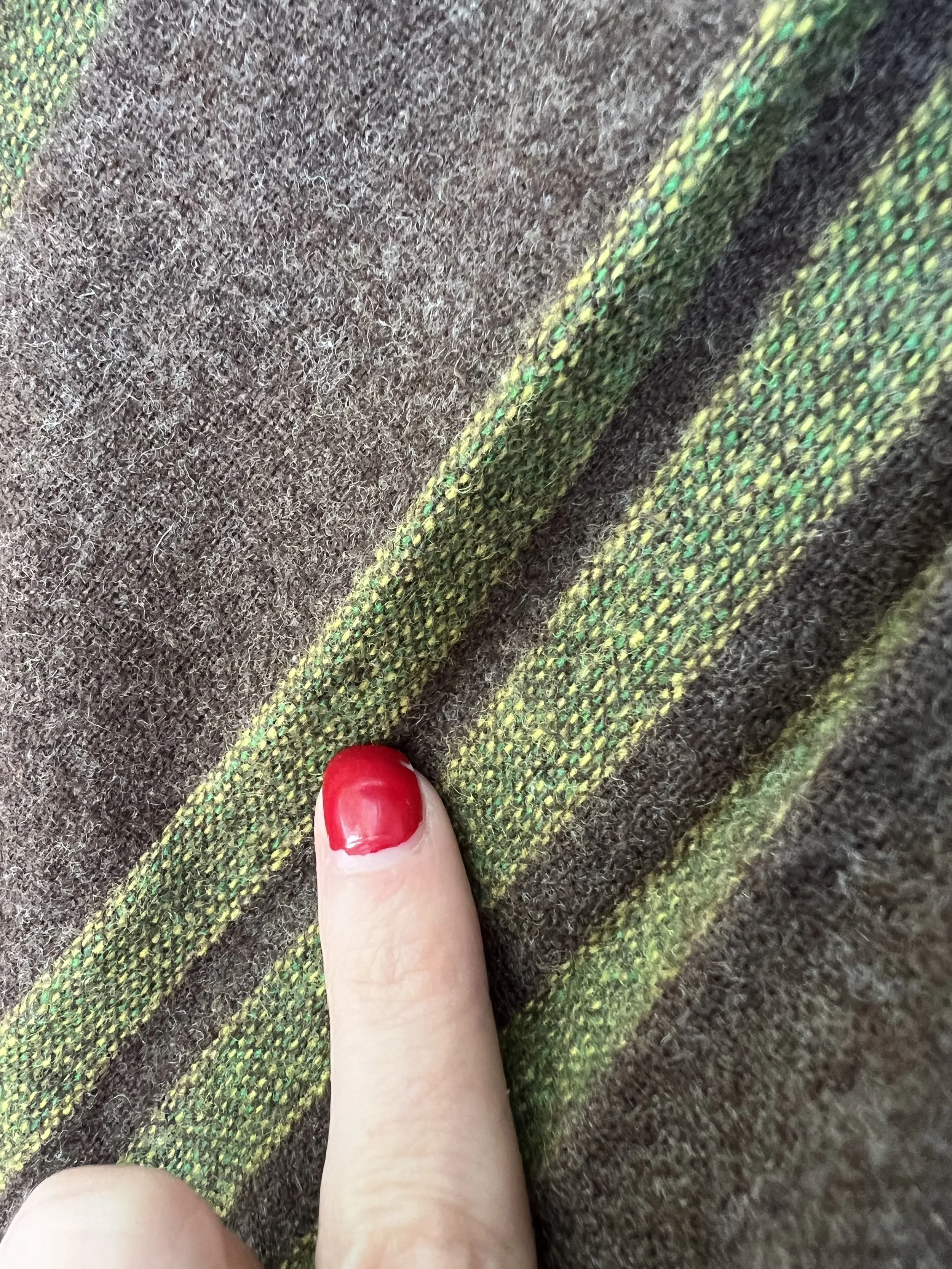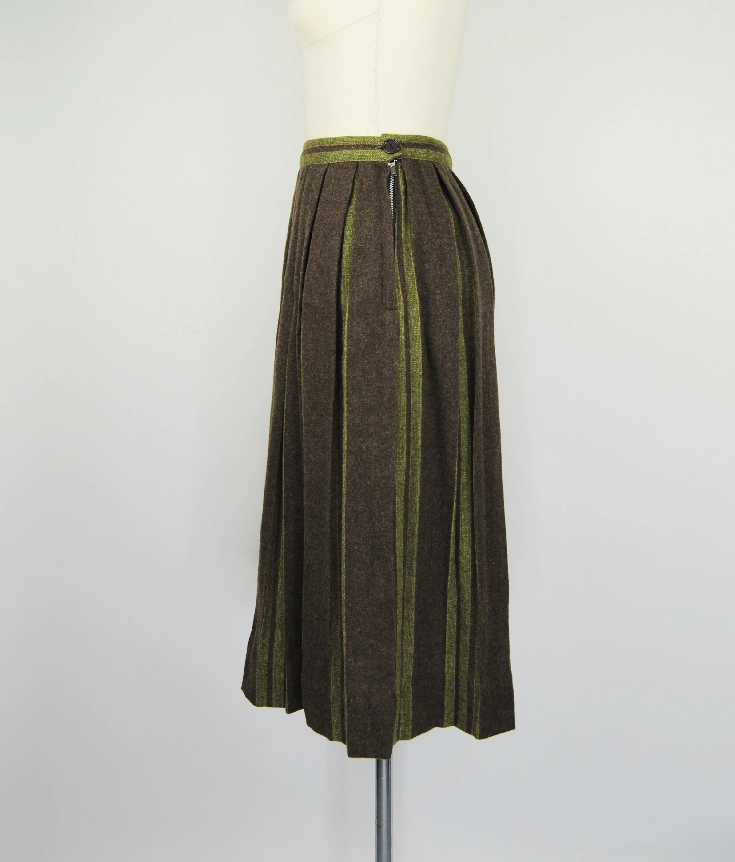 Good Vintage Condition- Some overall expected wear to piece. A few areas of very small pulls or pilling/ fuzzing/ faint spots. Some wear to the interior lining of the piece including some slight discoloration and small holes. Marks to tag. Very small pin hole found at the back of the neck on the green trim of the piece. Slight discoloration to that same piping right at the edge. Not obvious though unless looking very close.