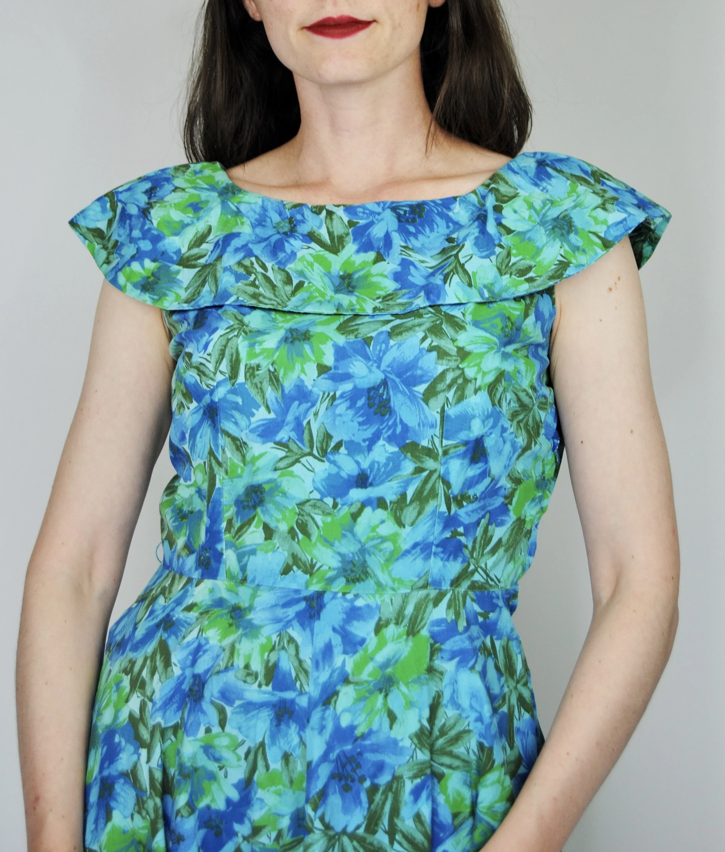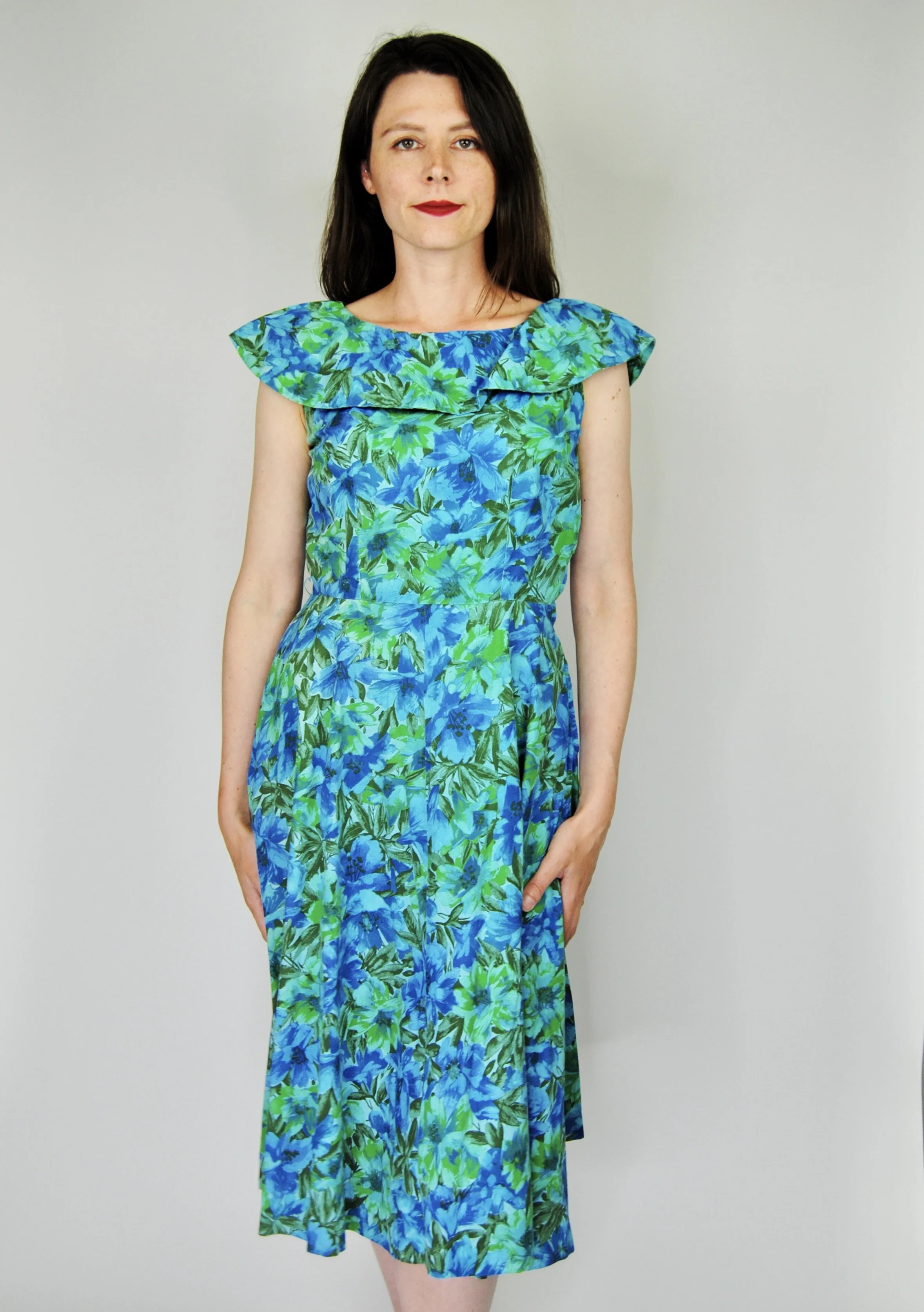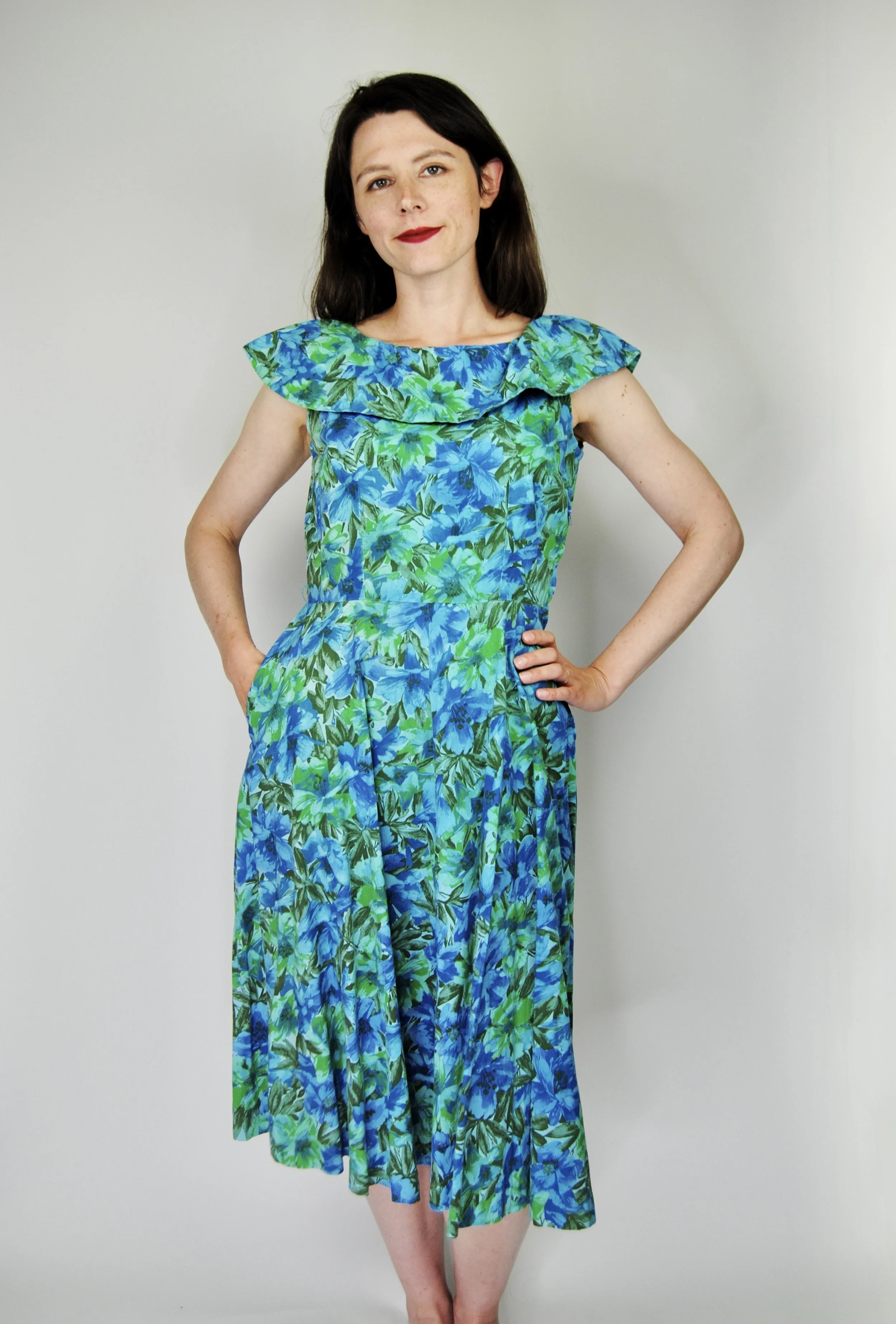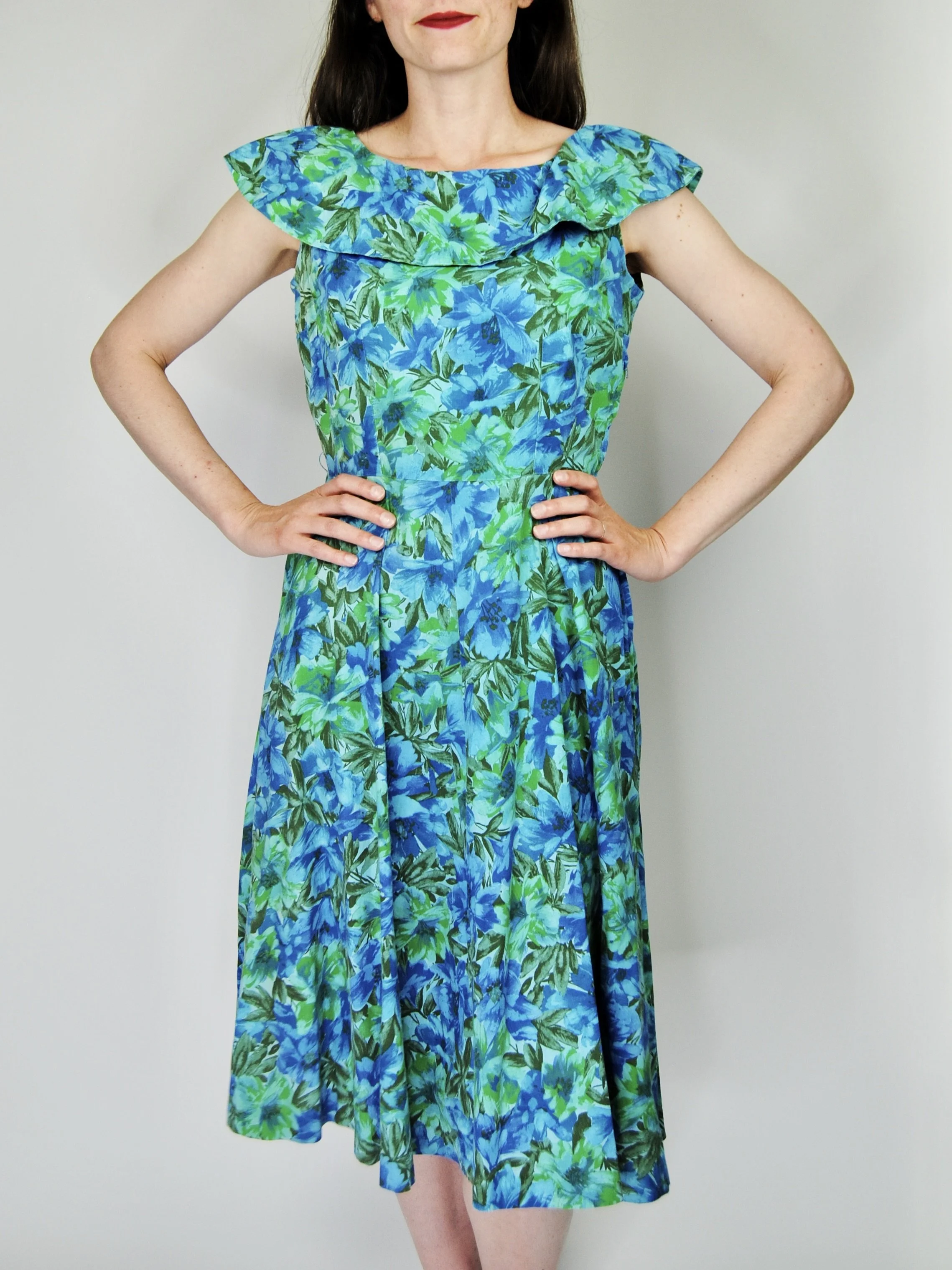 Simple and elegant. This lovely dress comes in a nice warm toned burnt red color. The silhouette is very unique, the dress looks like a two piece, but really its just one with the bodice front imitating a separate top. There is a lovely little flare and small pleats to the skirt as well . The fabric feels like a linen, possibly a cotton blend. Label for Alison Ayers. The dress zips up the back with a metal zipper. Additionally there is a strap that buttons at the sides and runs across the back. This would likely best fit a modern Small. For reference model is modern size 4/6.
