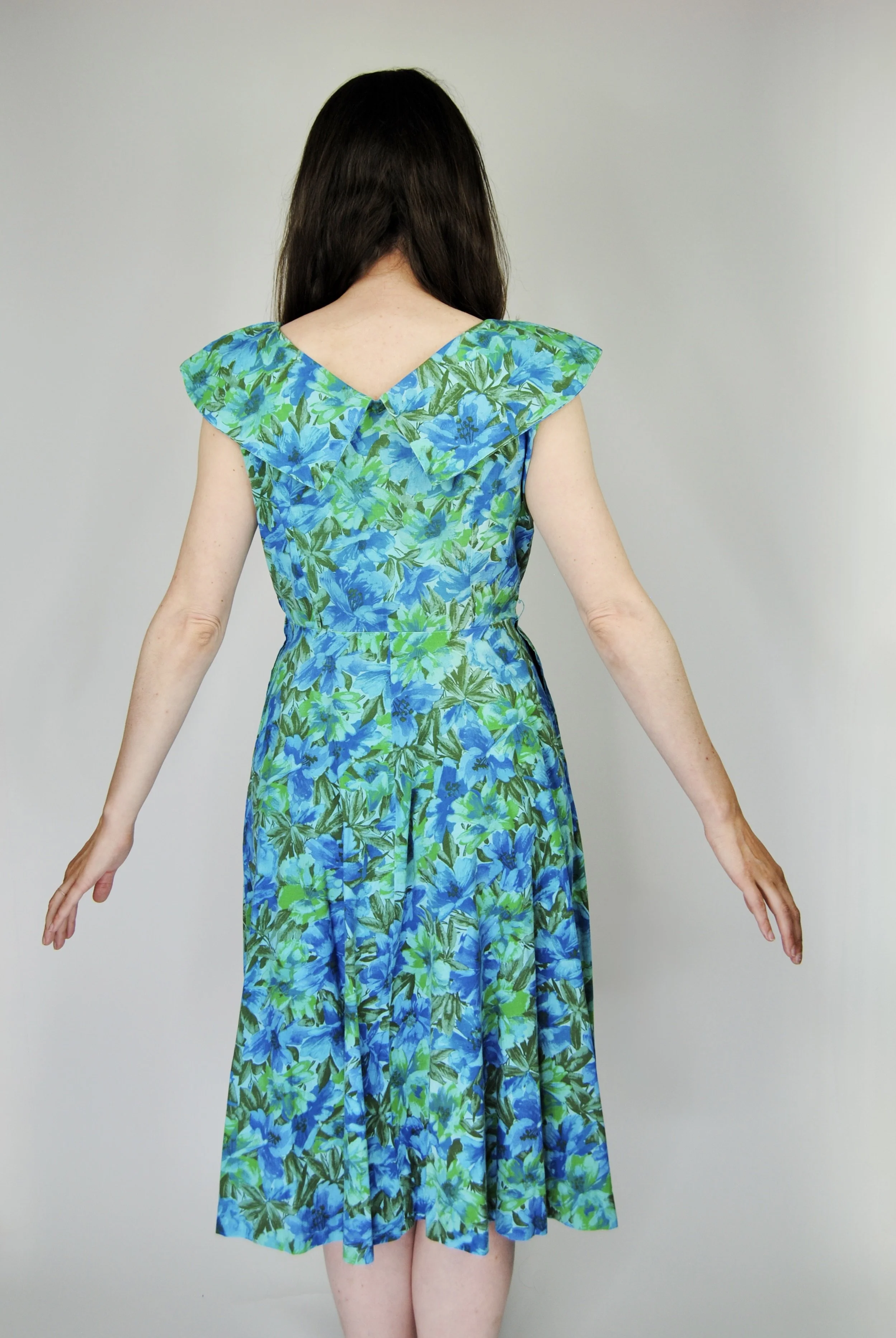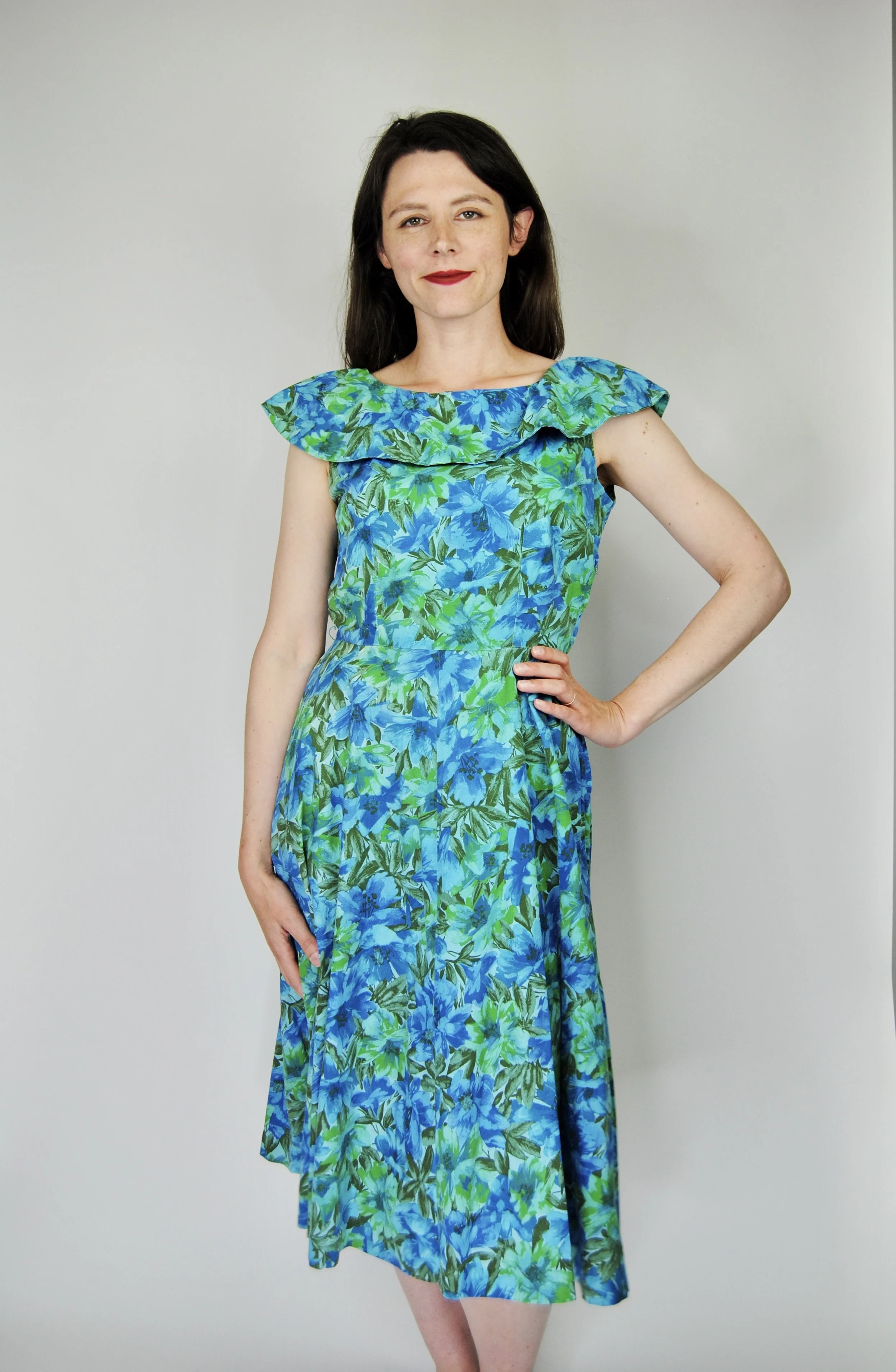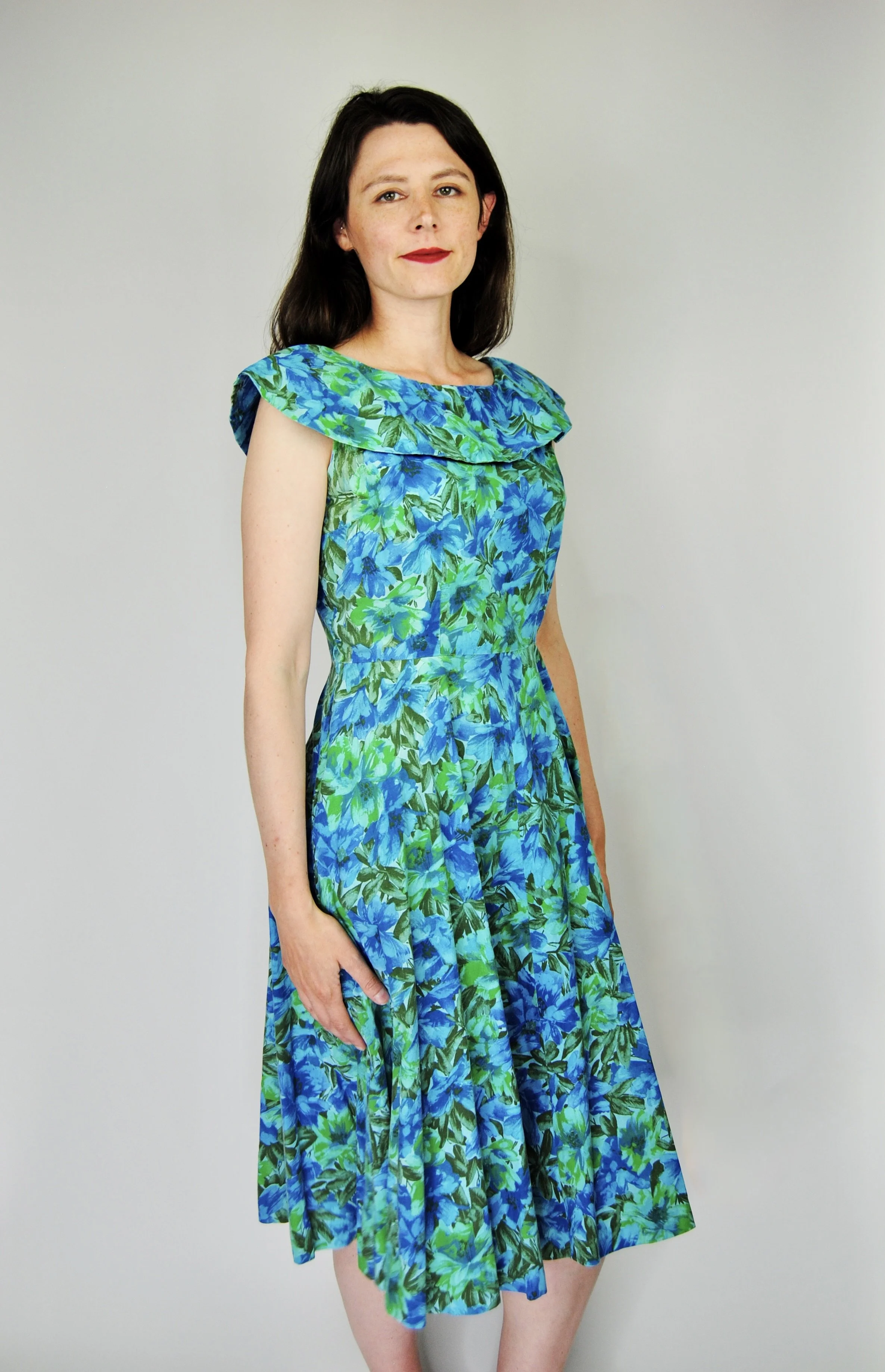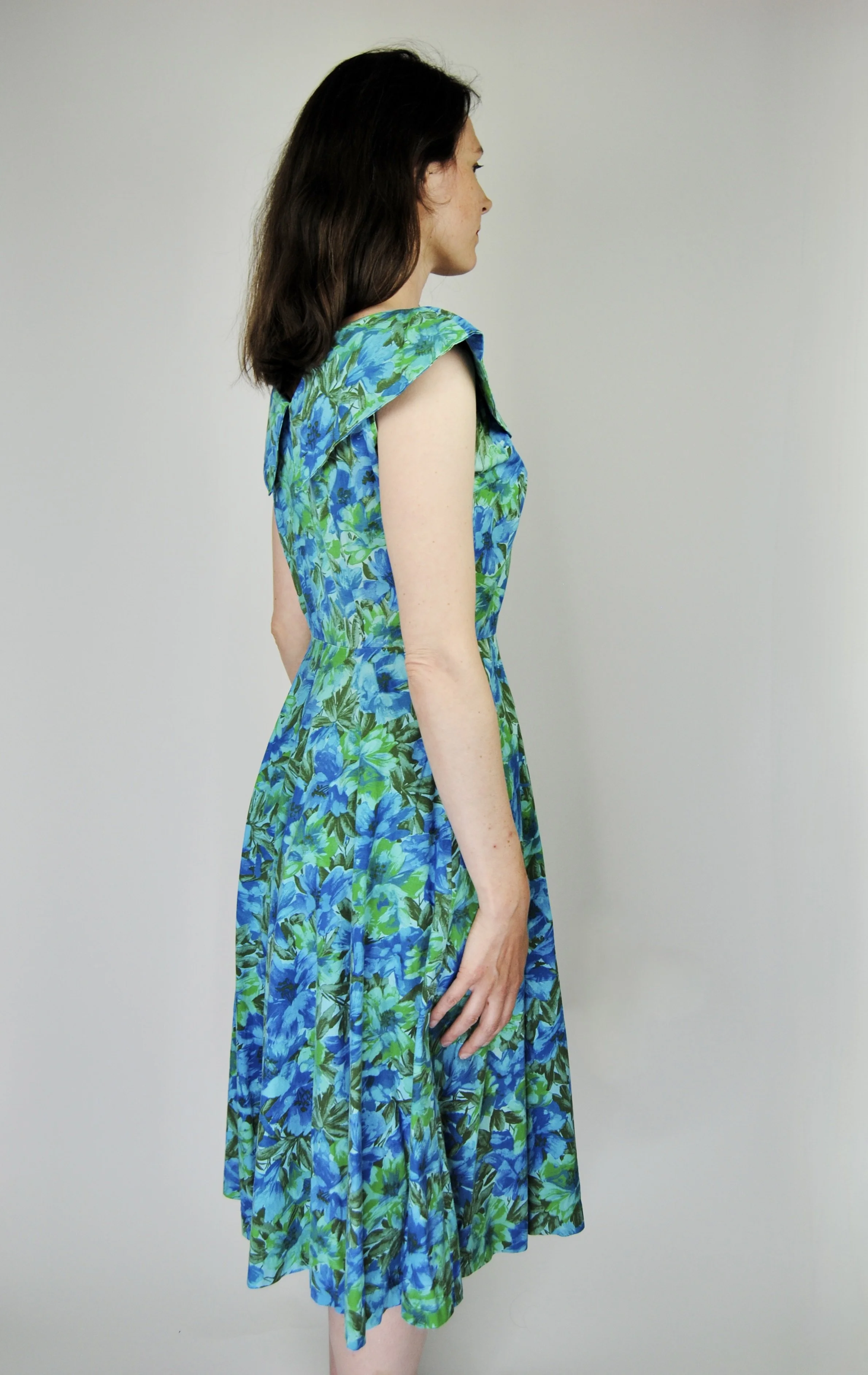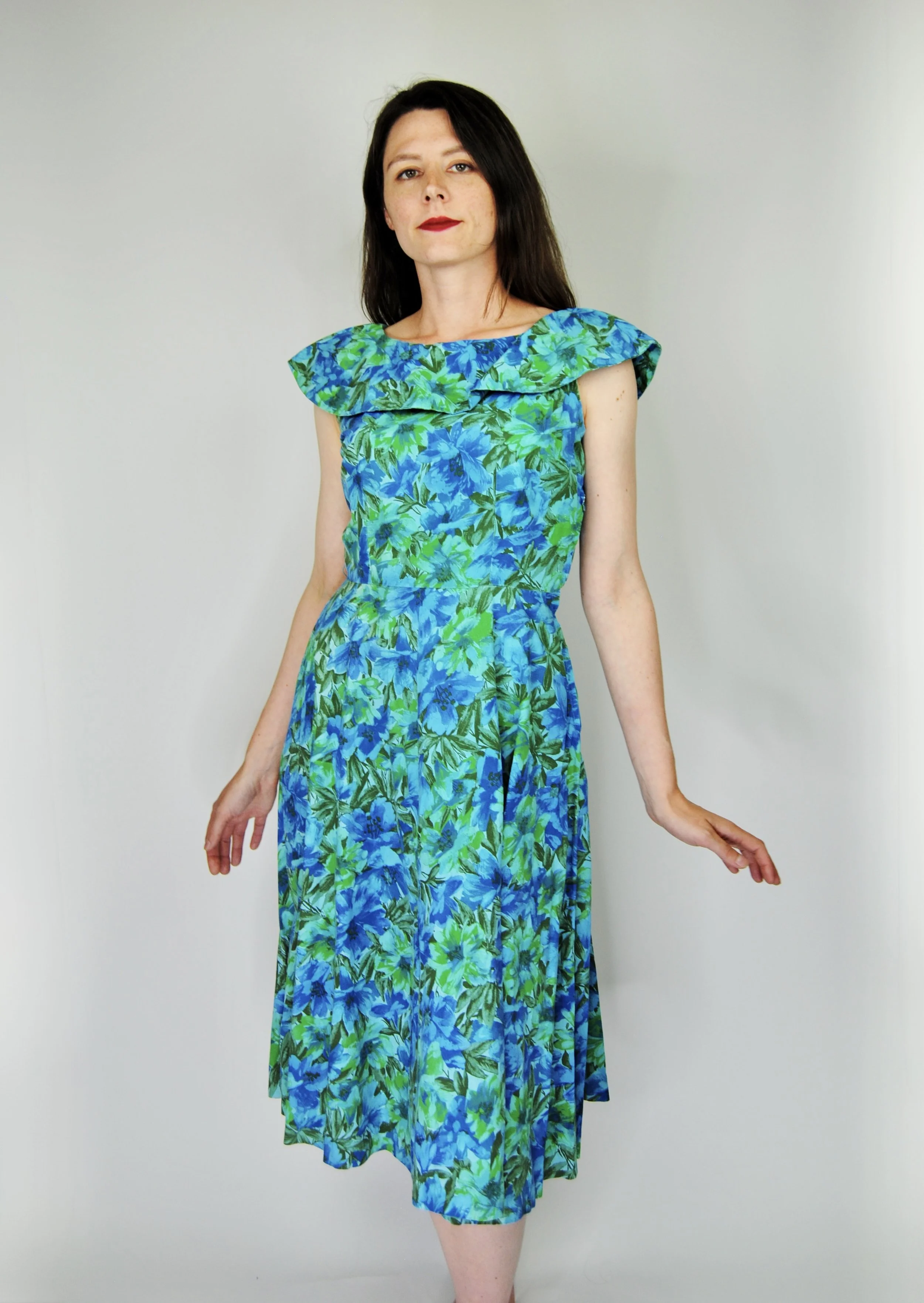Simple and elegant. This lovely dress comes in a nice warm toned burnt red color. The silhouette is very unique, the dress looks like a two piece, but really its just one with the bodice front imitating a separate top. There is a lovely little flare and small pleats to the skirt as well . The fabric feels like a linen, possibly a cotton blend. Label for Alison Ayers. The dress zips up the back with a metal zipper. Additionally there is a strap that buttons at the sides and runs across the back. This would likely best fit a modern Small. For reference model is modern size 4/6.