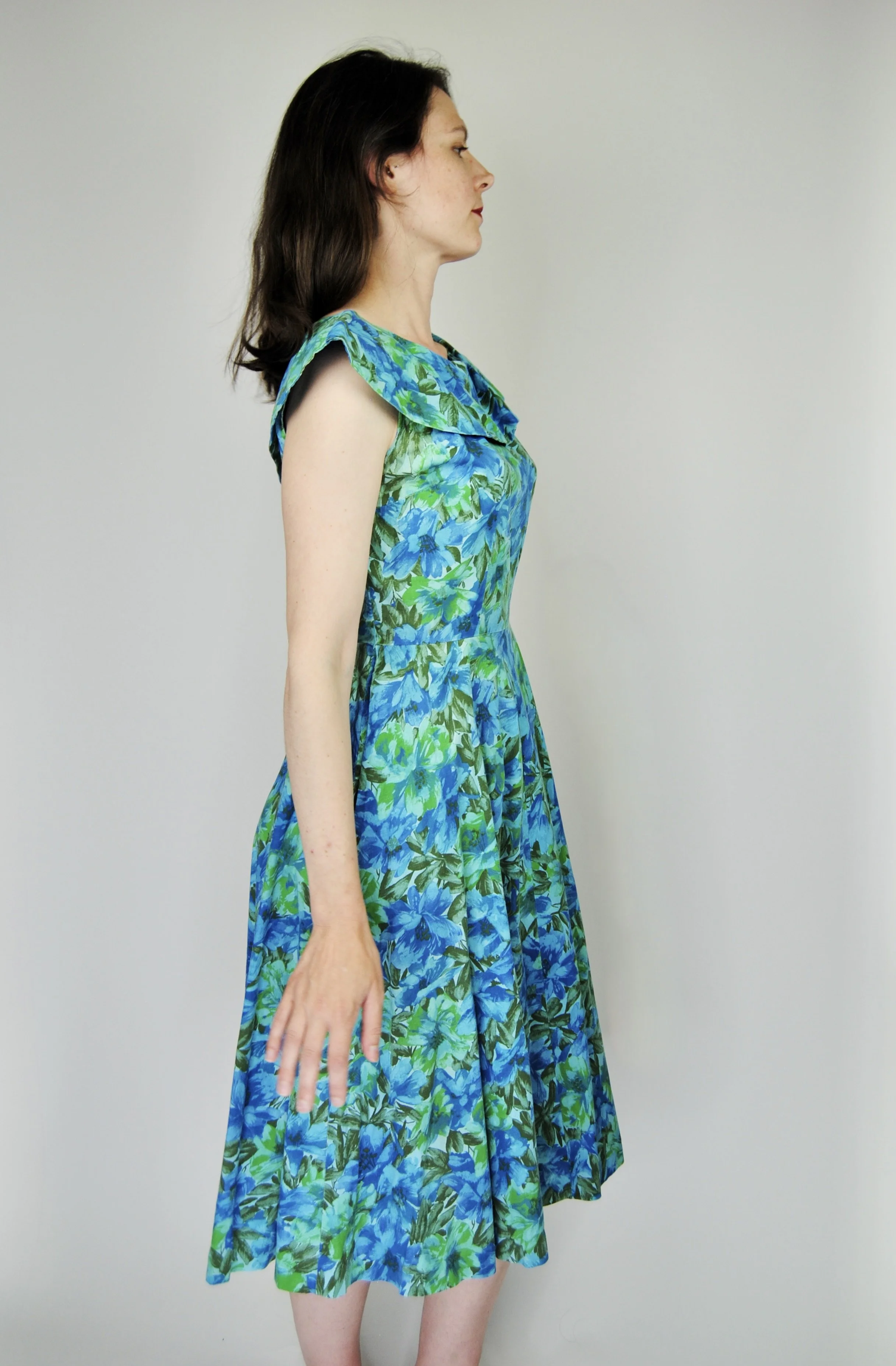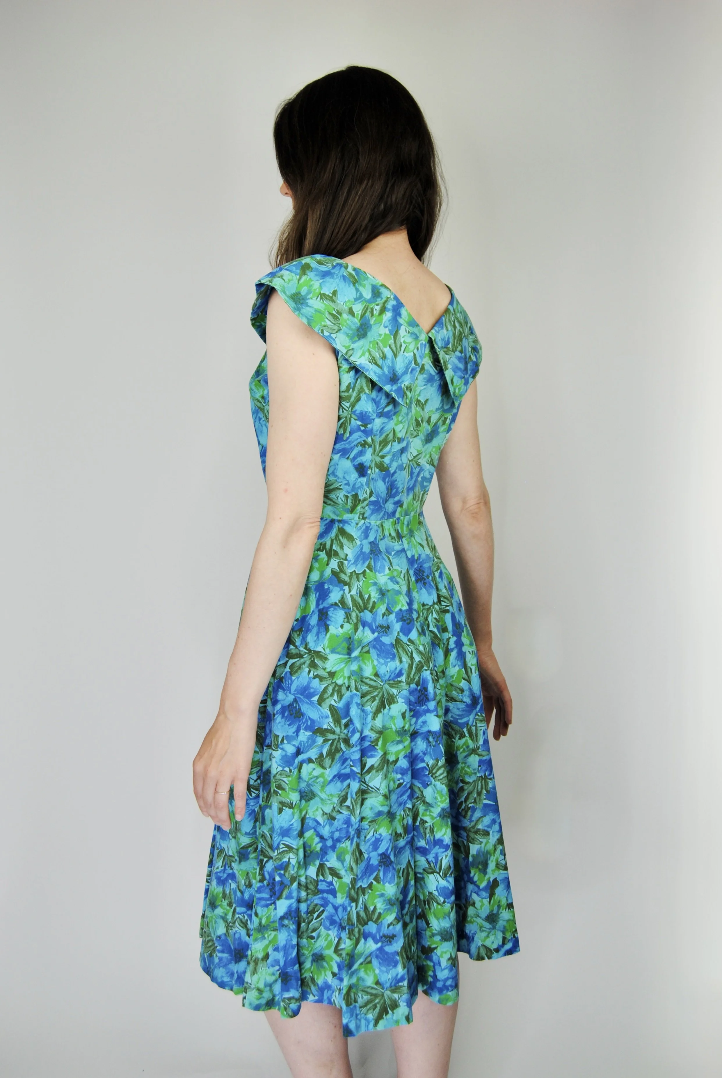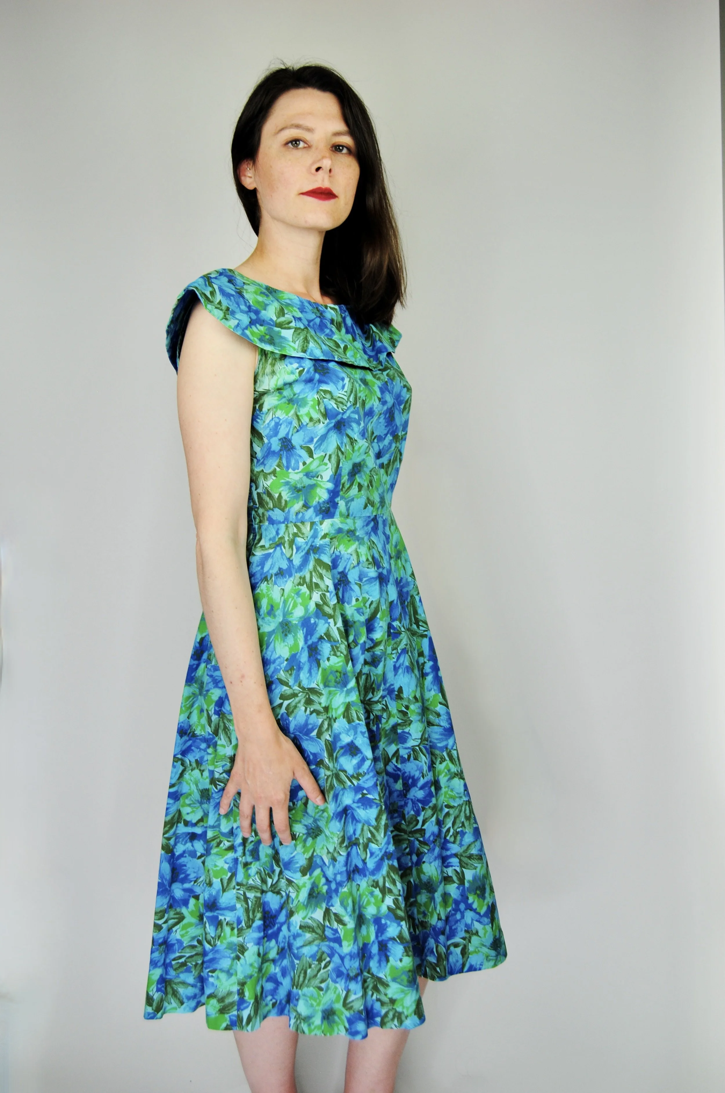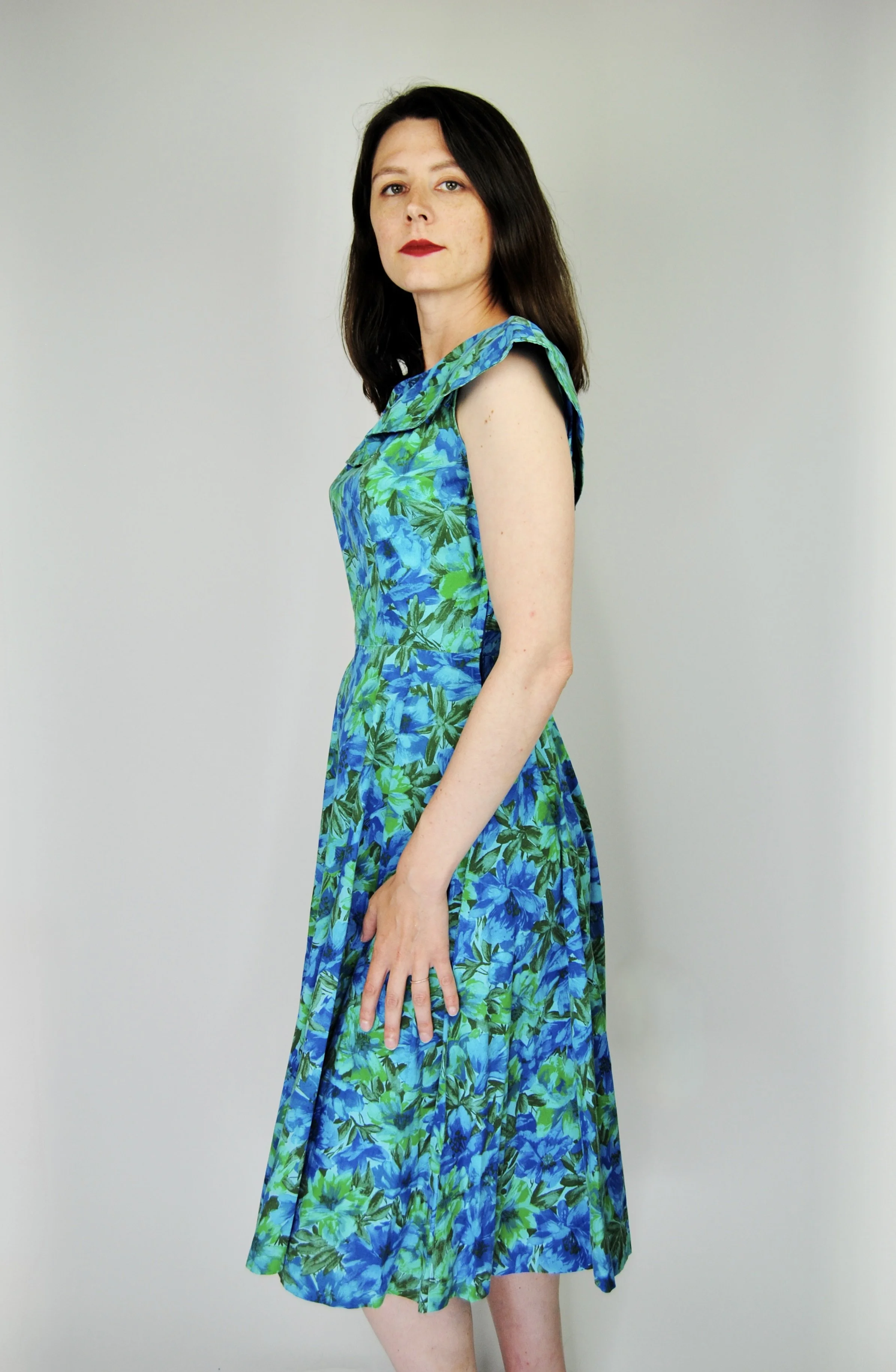 Simple and elegant. This lovely dress comes in a nice warm toned burnt red color. The silhouette is very unique, the dress looks like a two piece, but really its just one with the bodice front imitating a separate top. There is a lovely little flare and small pleats to the skirt as well . The fabric feels like a linen, possibly a cotton blend. Label for Alison Ayers. The dress zips up the back with a metal zipper. Additionally there is a strap that buttons at the sides and runs across the back. This would likely best fit a modern Small. For reference model is modern size 4/6.