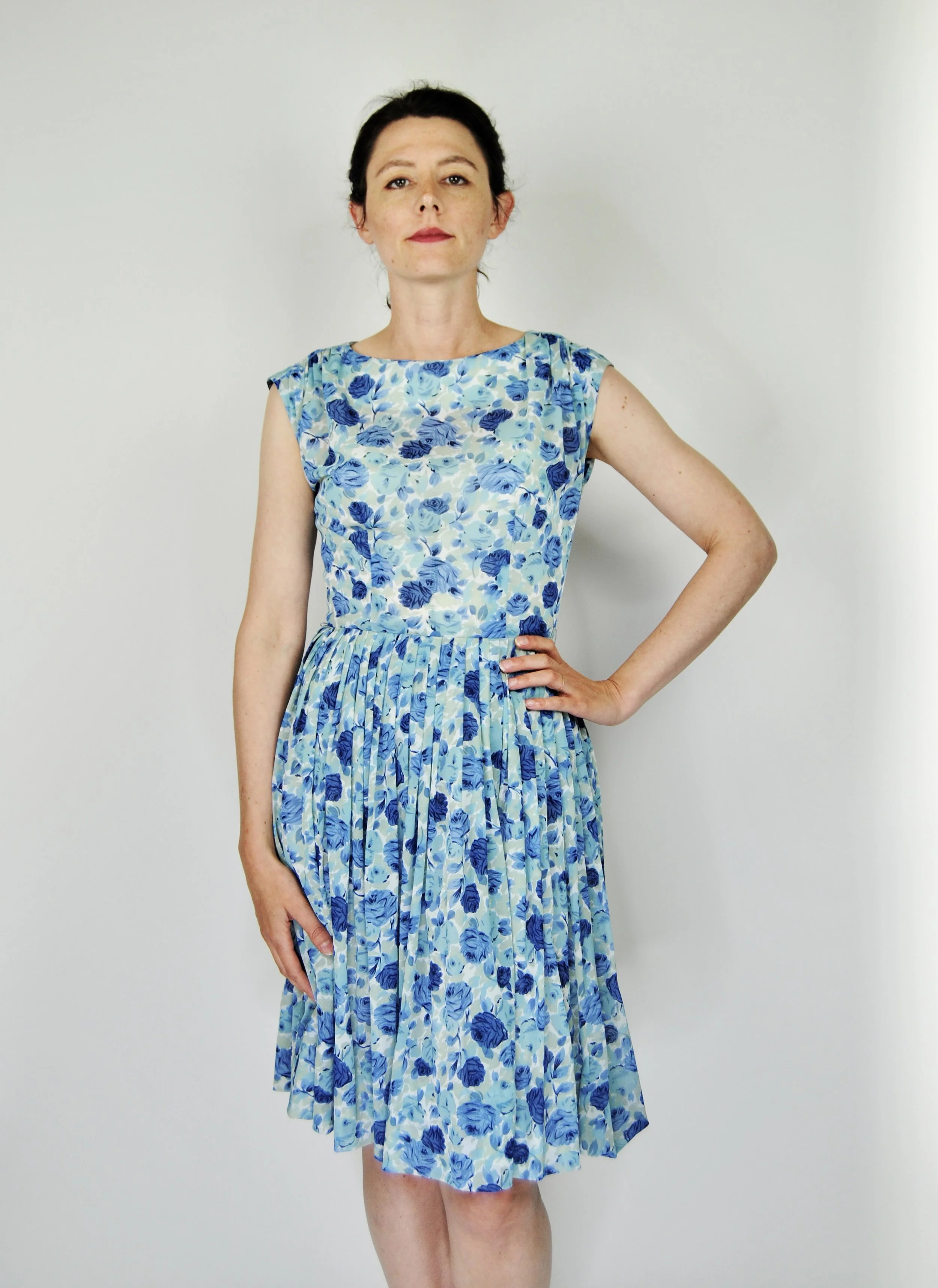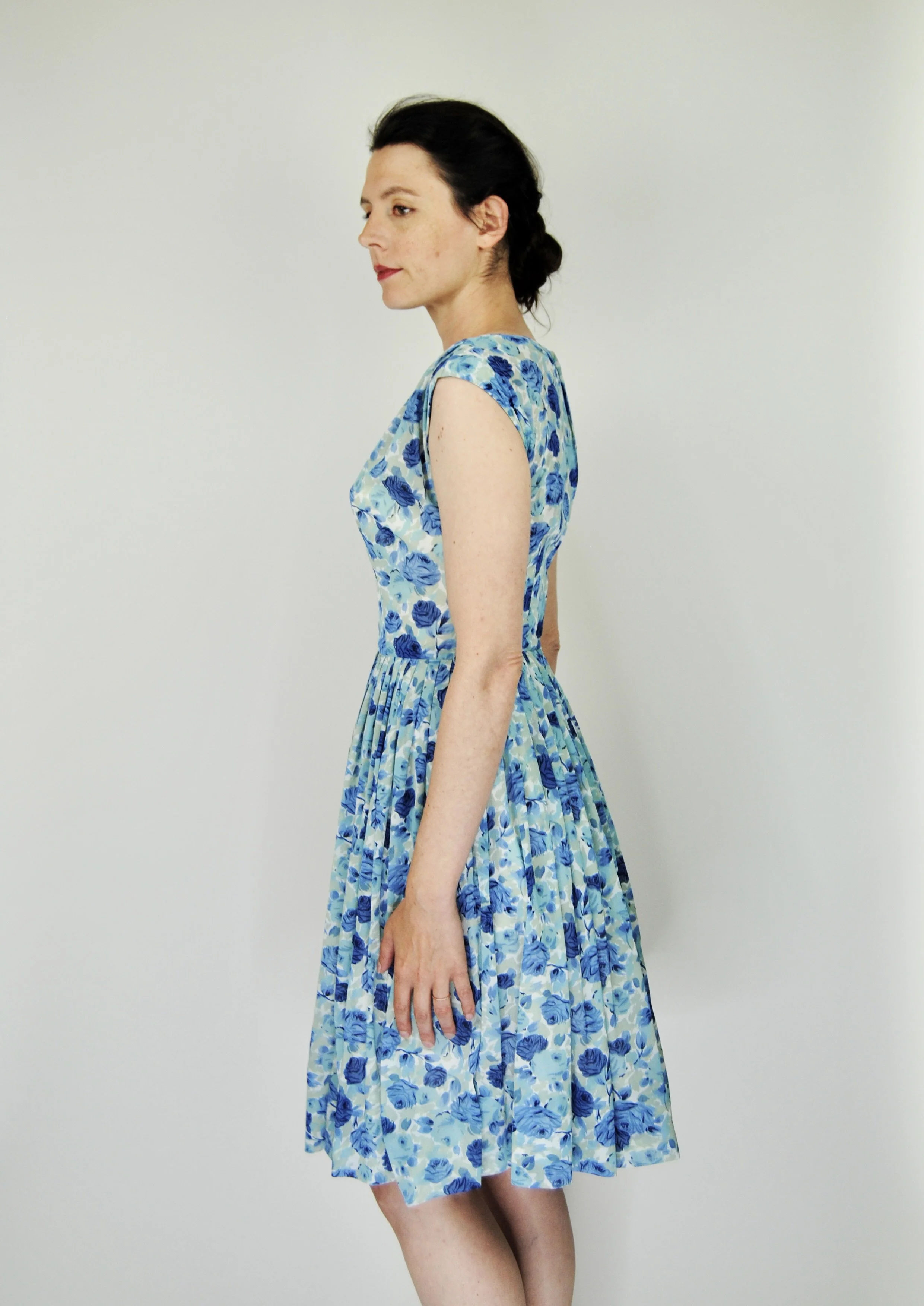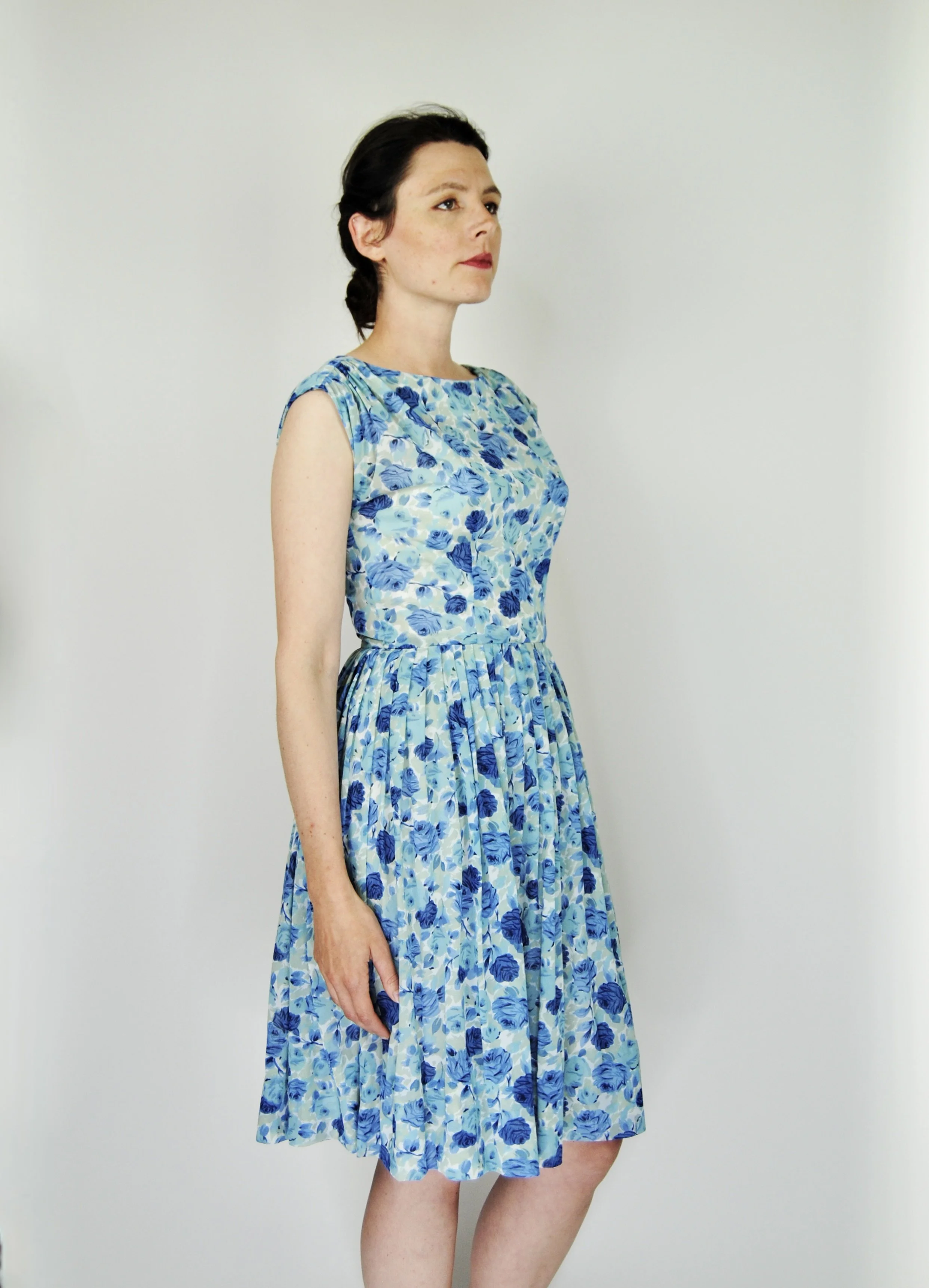 This lovely early 60s dress is a great item to add to your late Summer to Early Fall wardrobe! The subdued peach and pink colors plus the lovely leaf print make this a great transitional piece. The dress also features large buttons which do actually function - though the ones on the skirt function for no reason as the piece has no need for closure there - but they do look nice! The piece also zips up the side with a metal zipper. A classic fit. While the piece does have a zipper and buttons at the front of the bodice, it is still a pull over piece, so keep that in mind for sizing. Fabric feels like a type of thin crepe. Label is for Rite Fit and has a union tag. It Would likely best fit between a modern Large, possibly an Extra Large but please see measurements and remember it is still a pull over piece! Dress form is modern medium for reference.
