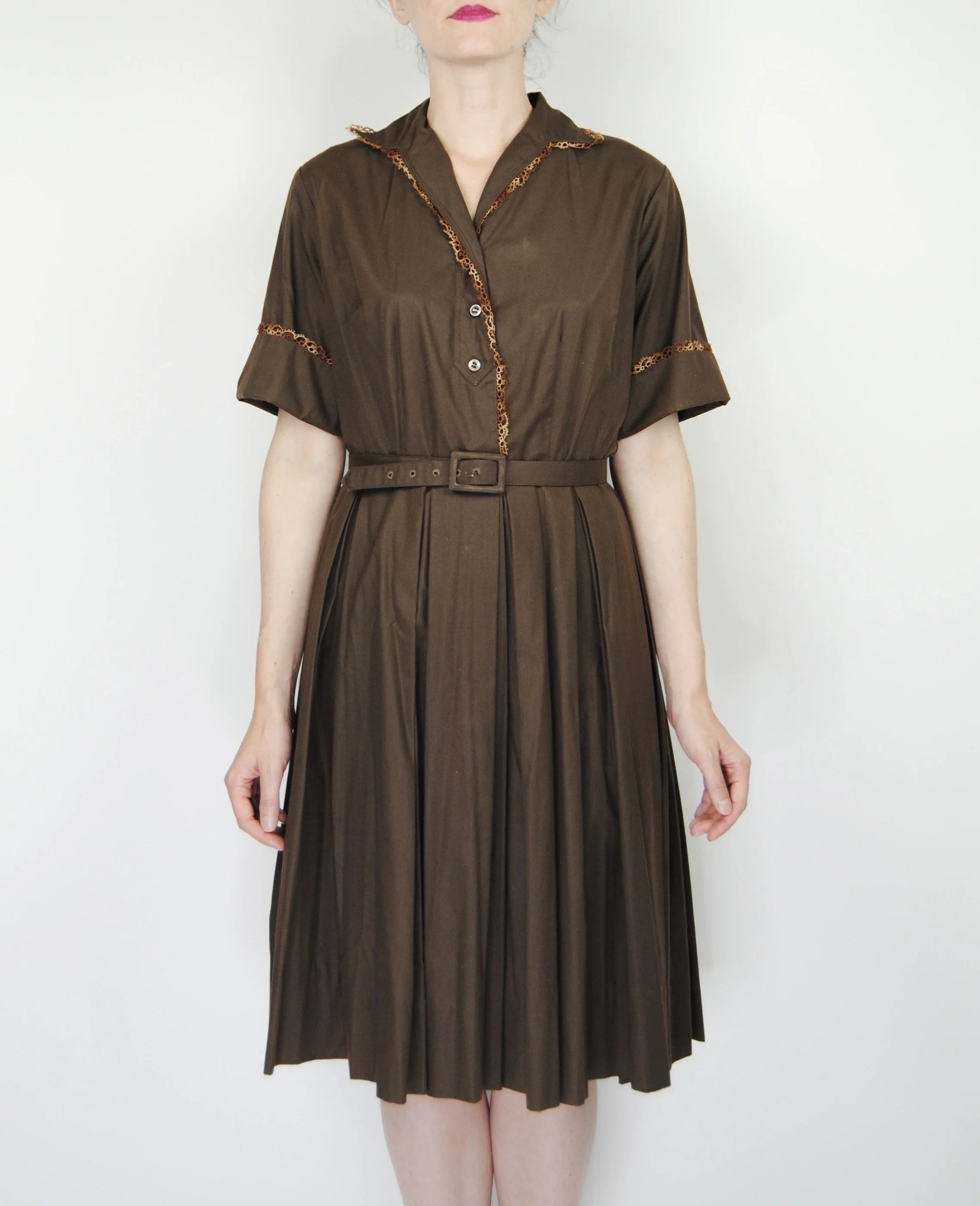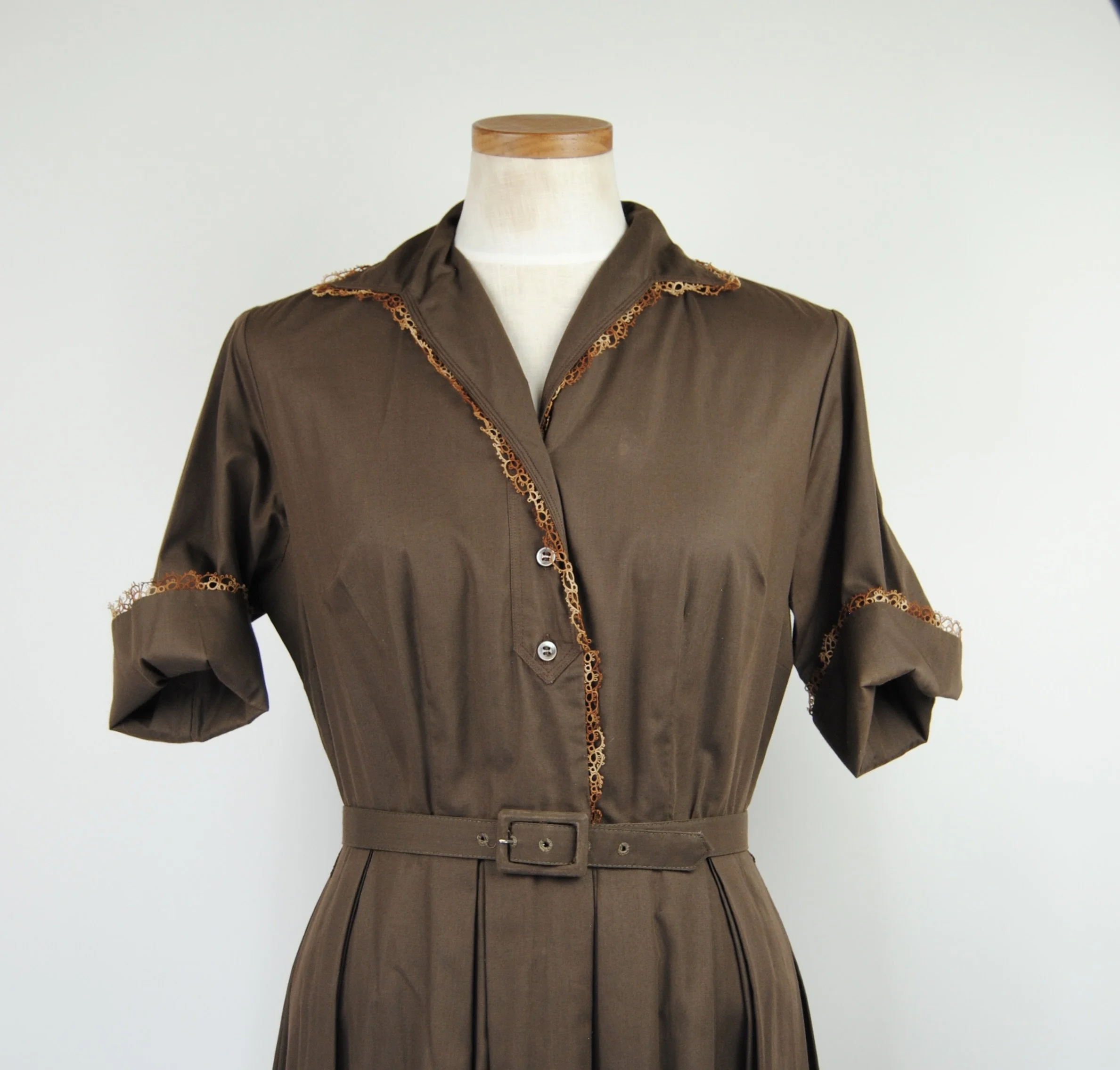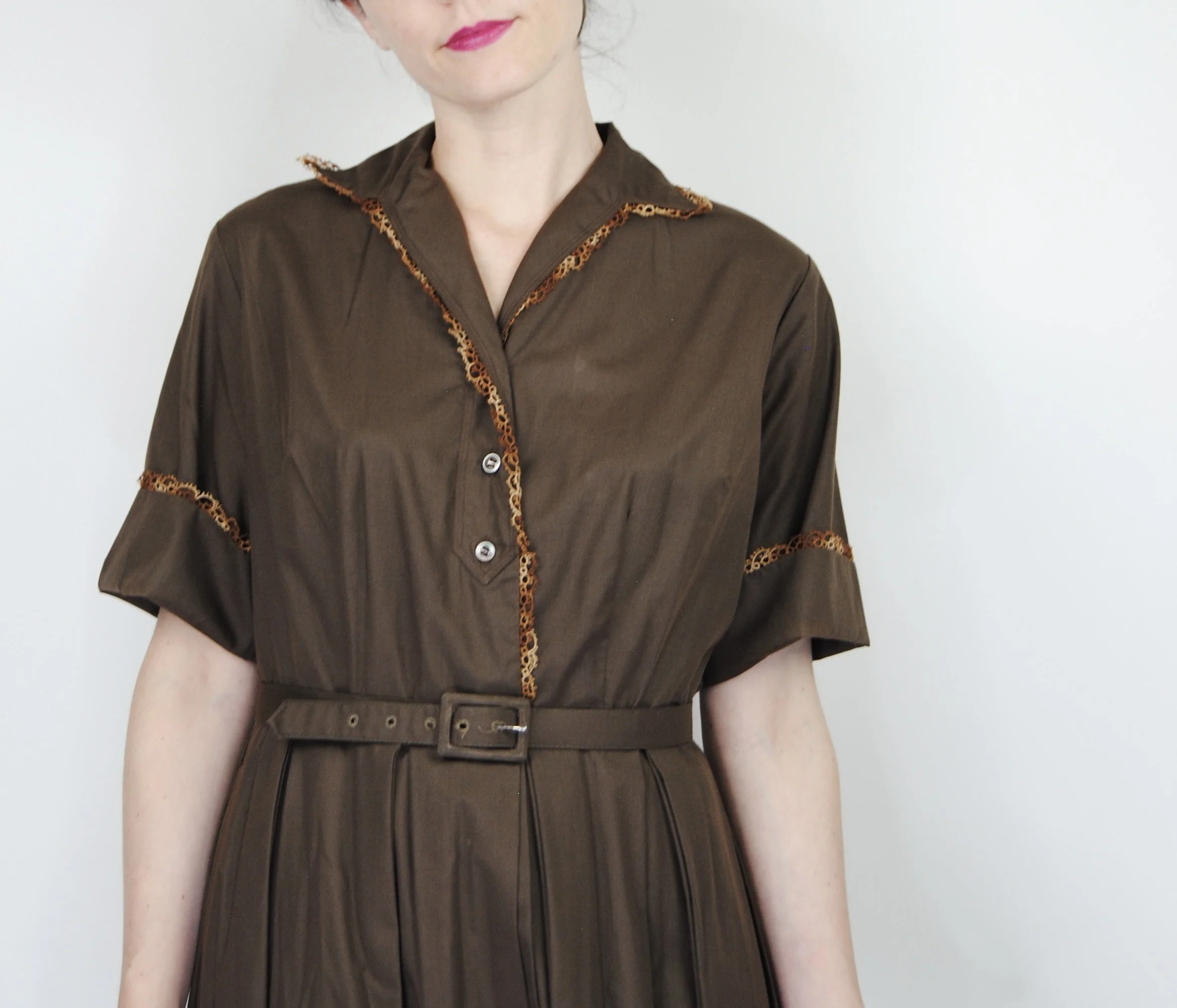 An absolutely incredible gown! This dark brown sequined gown is the perfect piece for all your Fall and Winter parties! This gown features a gorgeous knitted or woven bodice with sequins stitched all over. The sleeves are loosely woven so you can see your arm when examined closely! There is a gorgeous slit all the way up the skirt making it almost like a wrap-style skirt. The dress even has an elastic waist! There is a matching belt as well, though that is not elasticized. Zips up the back with Talon Zipper. Would likely best fit a modern Medium. Please see measurements Model is modern size 4/6 and dress form is a modern Medium.