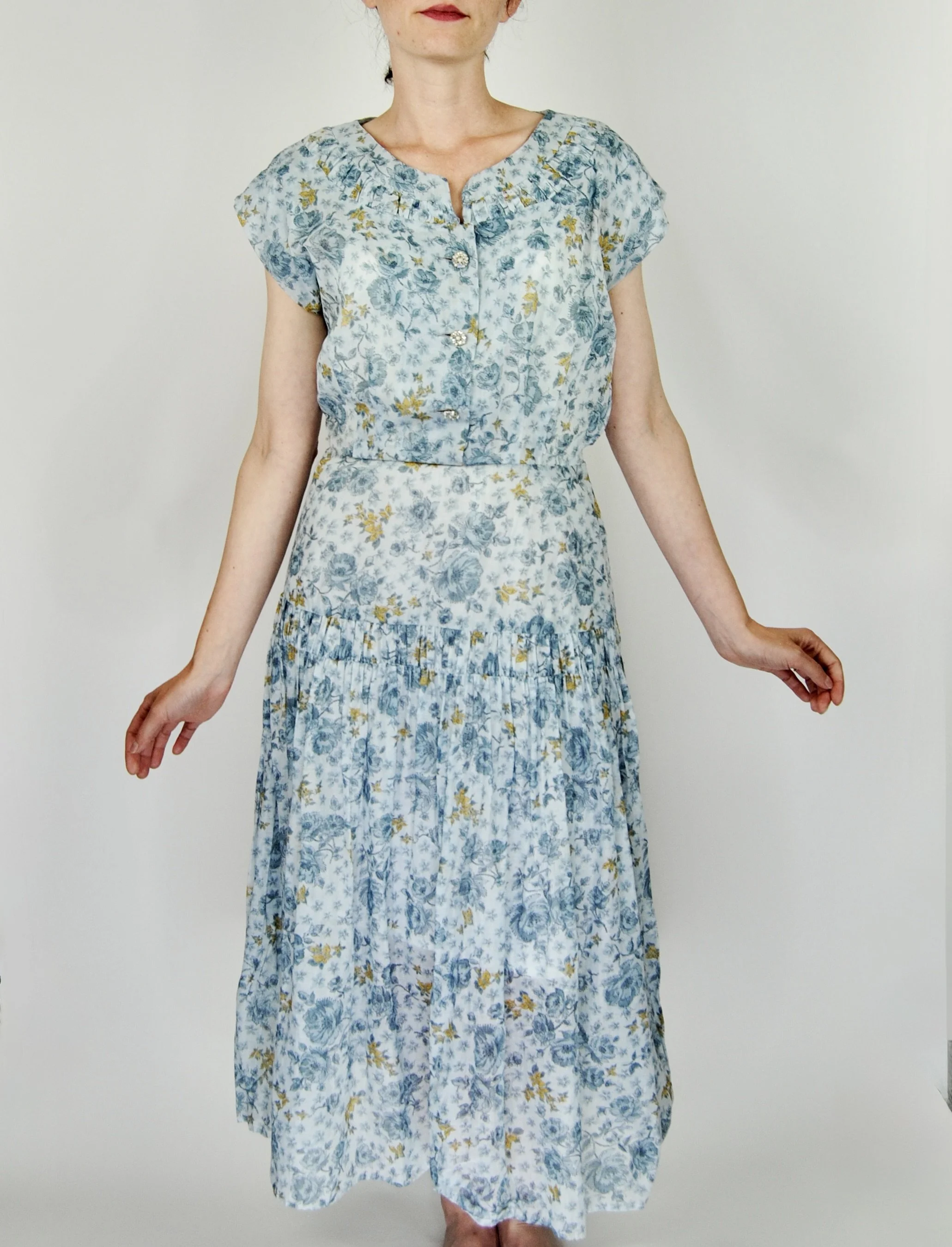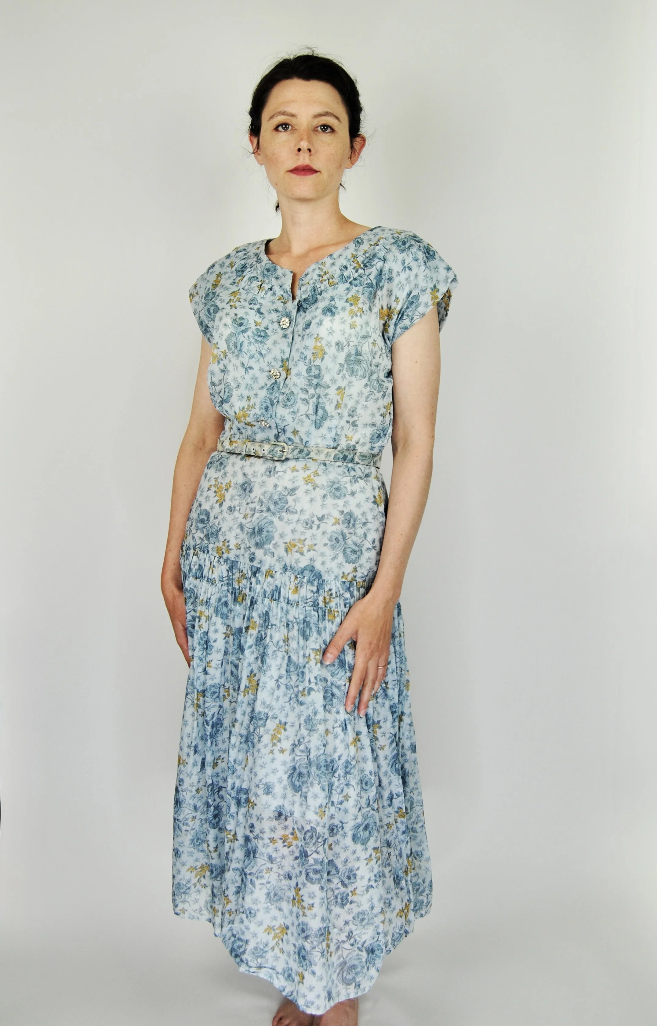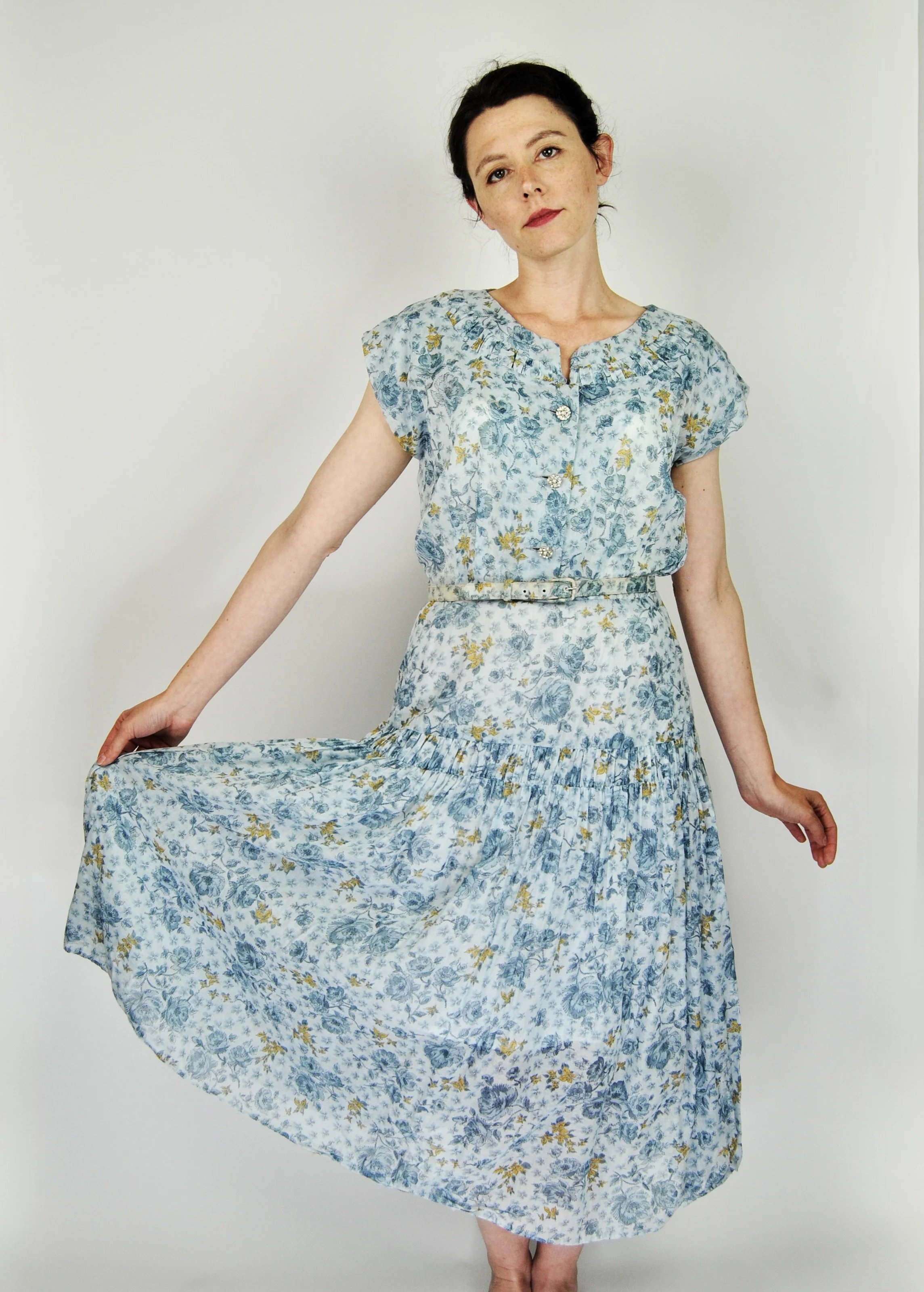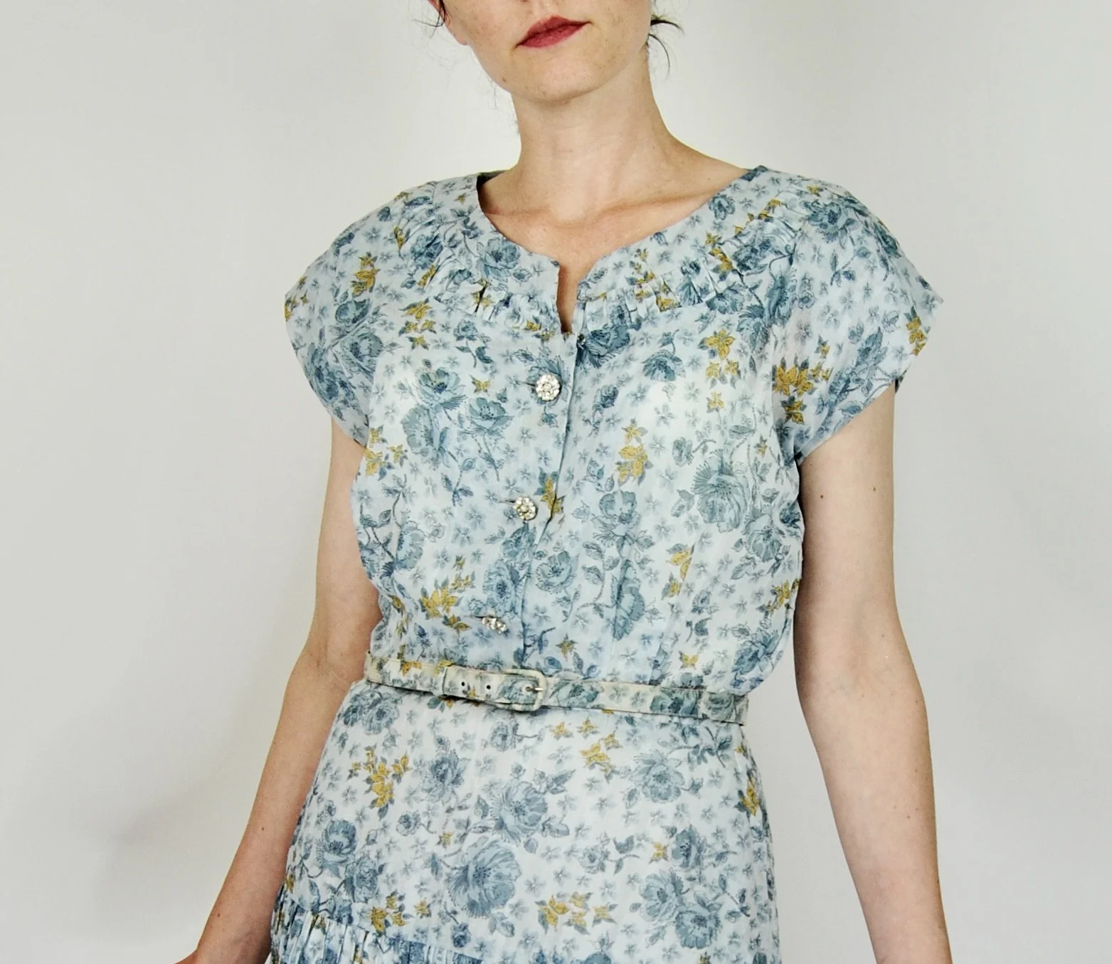 Good vintage condition - Some overall wear to garment but presents beautifully and is still wearable. There are numerous areas of small pull, snags, pinholes, and just general wear to the fabric. The fabric exhibits some slight discoloration/yellowing, especially on the interior and at the shoulders. There are also some marks and spots that did not come out with cleaning throughout the dress, though thankfully they do not seem too obvious from afar. Some wear to the inner seam allotments as well as some wear to the inner lining of the skirt portion with some small holes to the lining itself. The lining also does seem to peek out a teeny bit in places. Slight wear to zipper - paint is chipping off but it still functions. Some areas where there is a slightly more obvious sheen to the fabric - I would think this is likely from prior pressings. Hem is slightly longer in back - appears to have been sewn that way intentionally. Fabric does like to wrinkle, so hang it up as soon as you receive the garment!