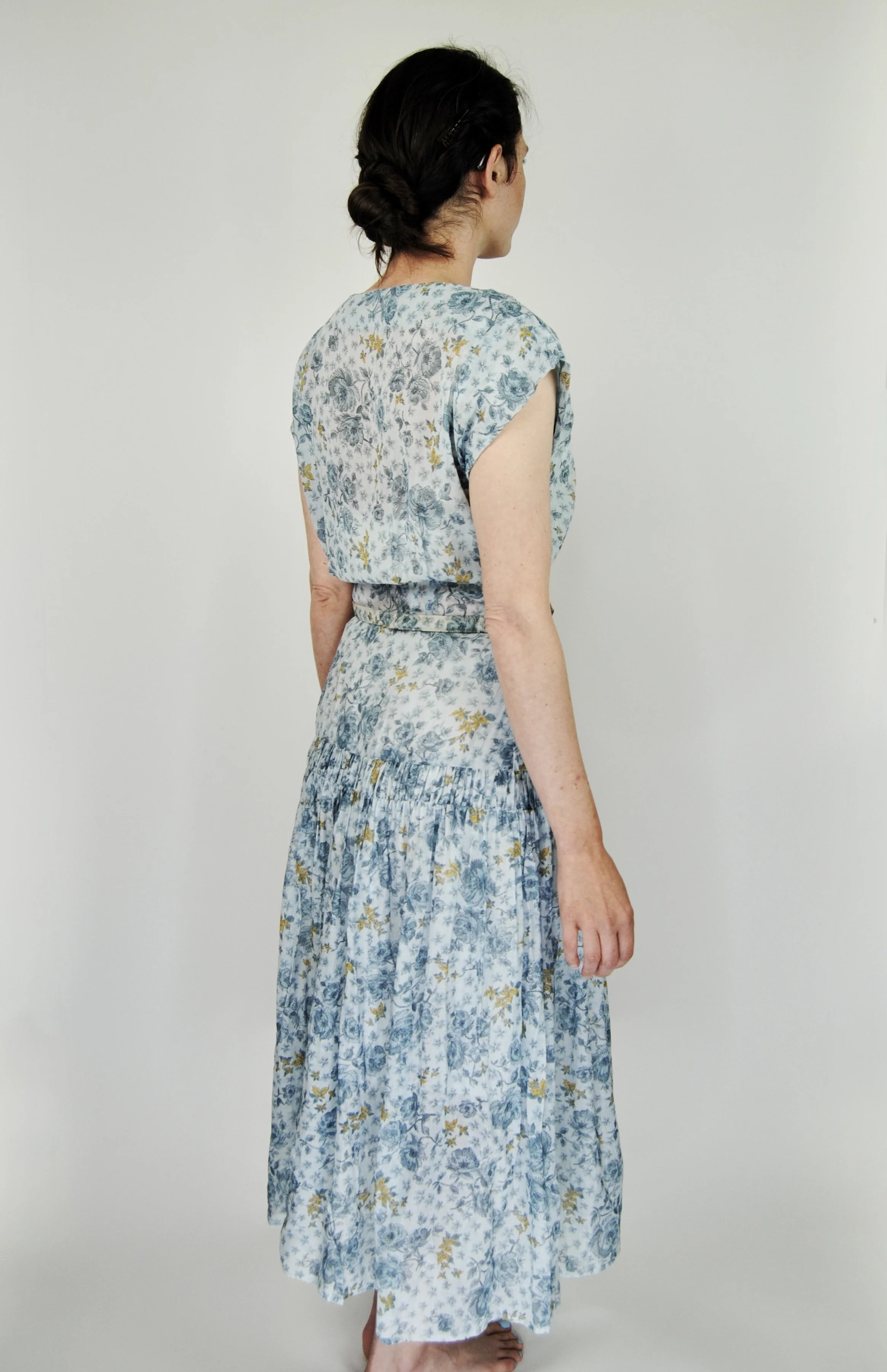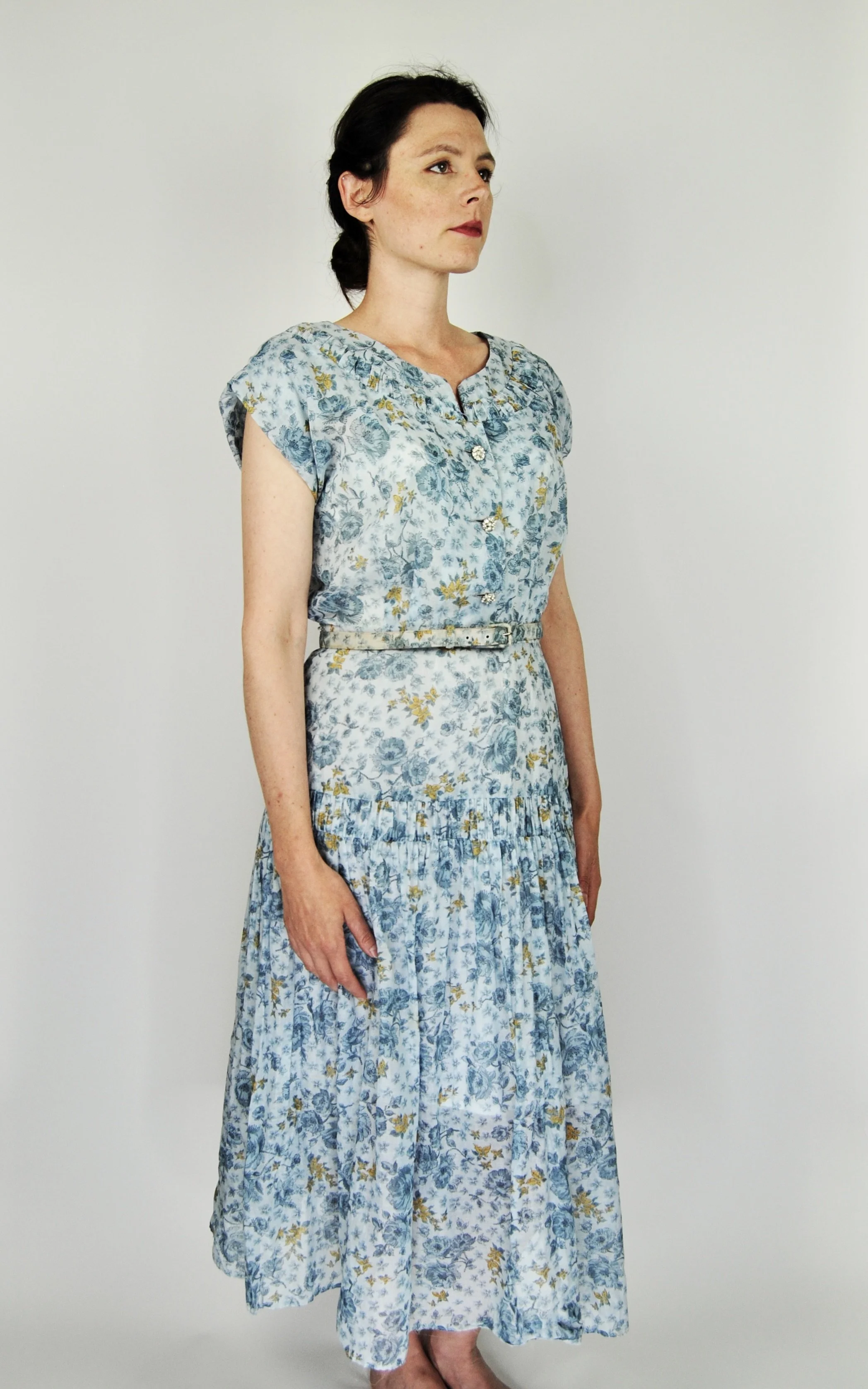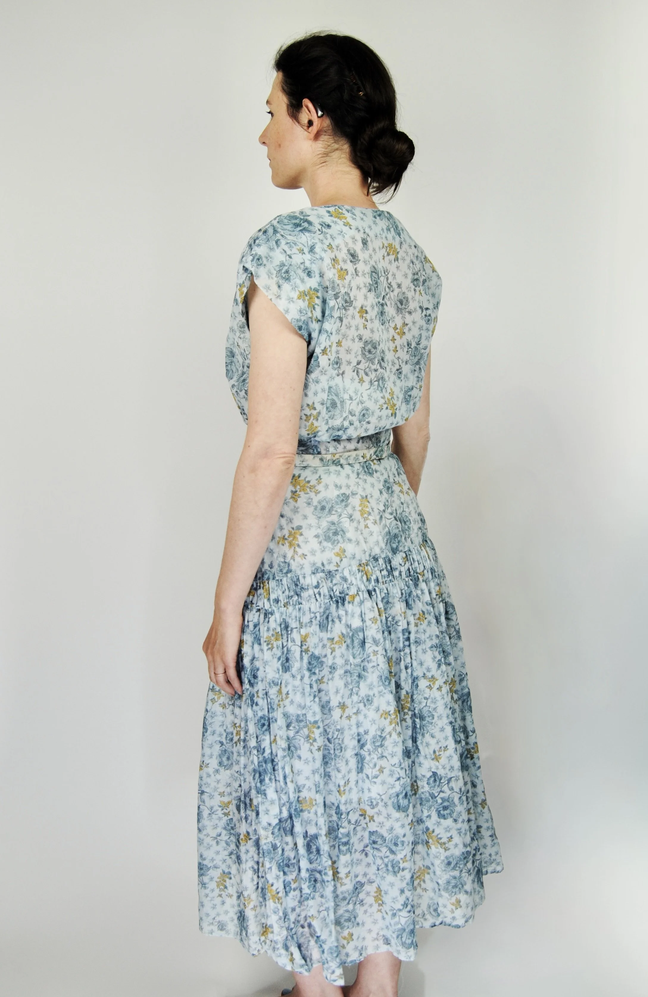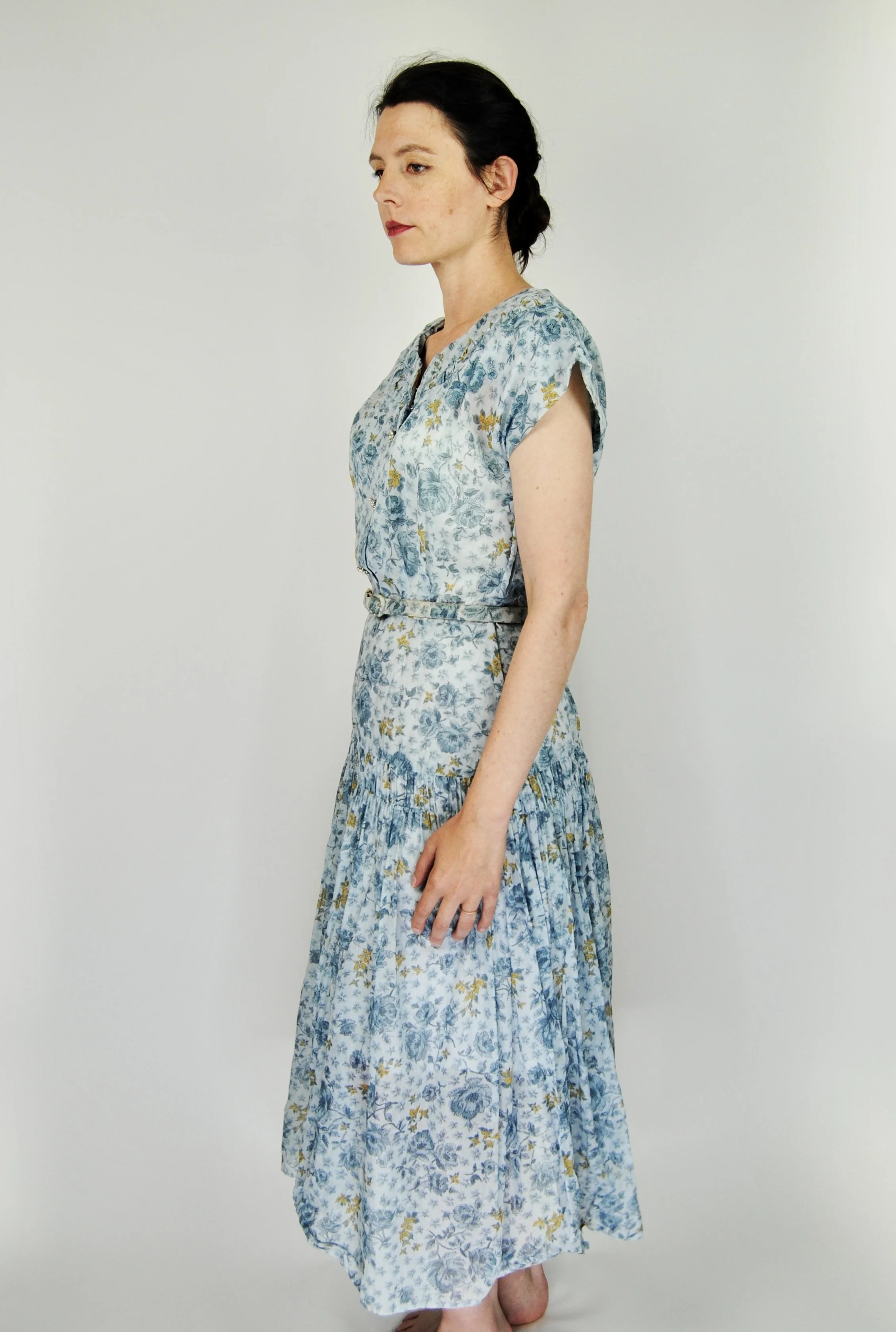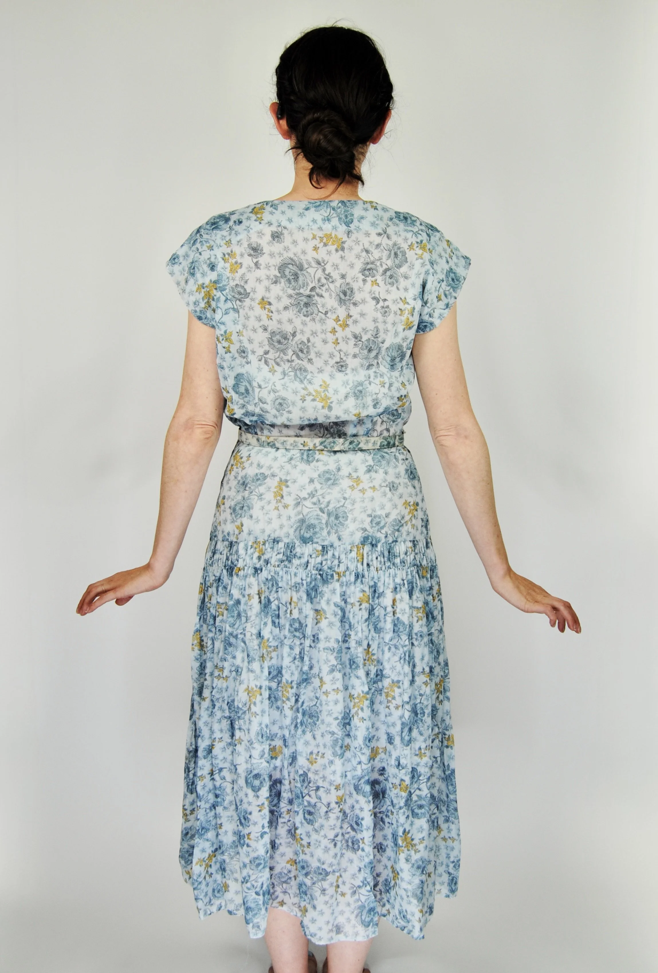 Good vintage condition - Some overall wear to garment but presents beautifully and is still wearable. There are numerous areas of small pull, snags, pinholes, and just general wear to the fabric. The fabric exhibits some slight discoloration/yellowing, especially on the interior and at the shoulders. There are also some marks and spots that did not come out with cleaning throughout the dress, though thankfully they do not seem too obvious from afar. Some wear to the inner seam allotments as well as some wear to the inner lining of the skirt portion with some small holes to the lining itself. The lining also does seem to peek out a teeny bit in places. Slight wear to zipper - paint is chipping off but it still functions. Some areas where there is a slightly more obvious sheen to the fabric - I would think this is likely from prior pressings. Hem is slightly longer in back - appears to have been sewn that way intentionally. Fabric does like to wrinkle, so hang it up as soon as you receive the garment!