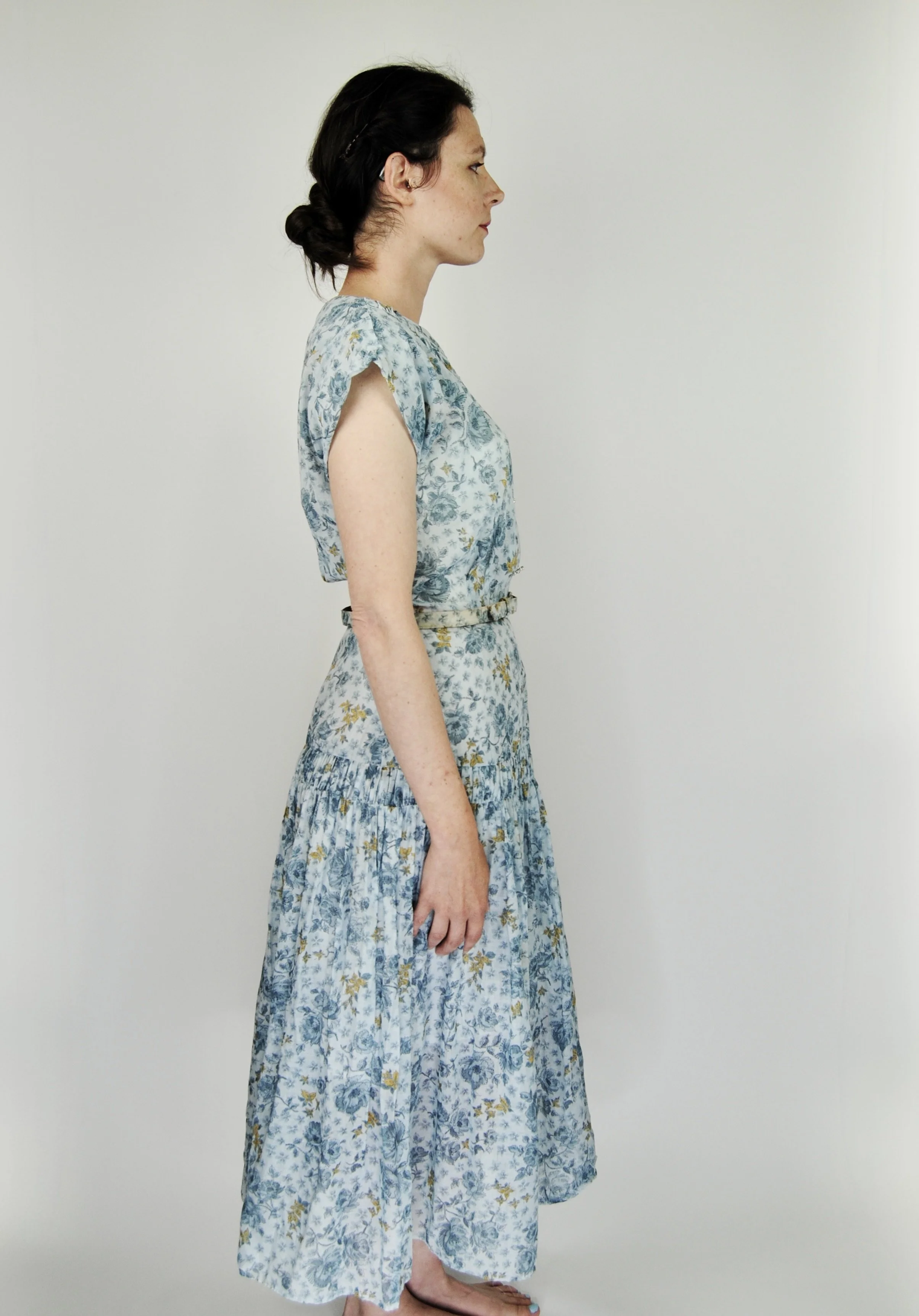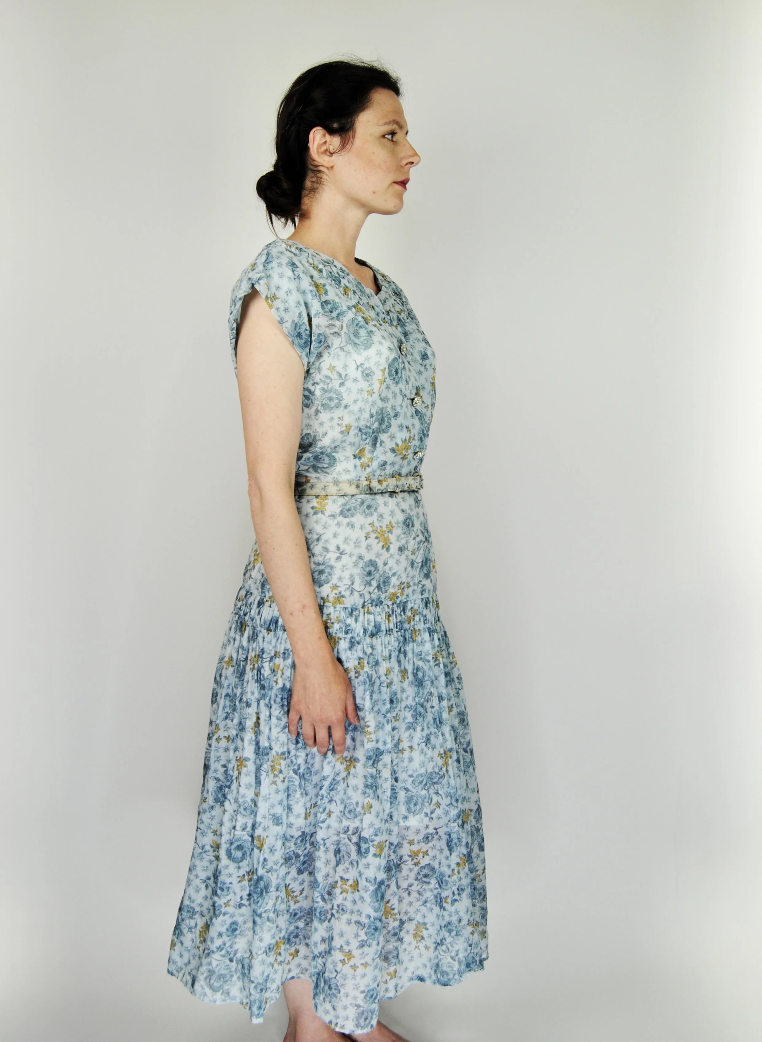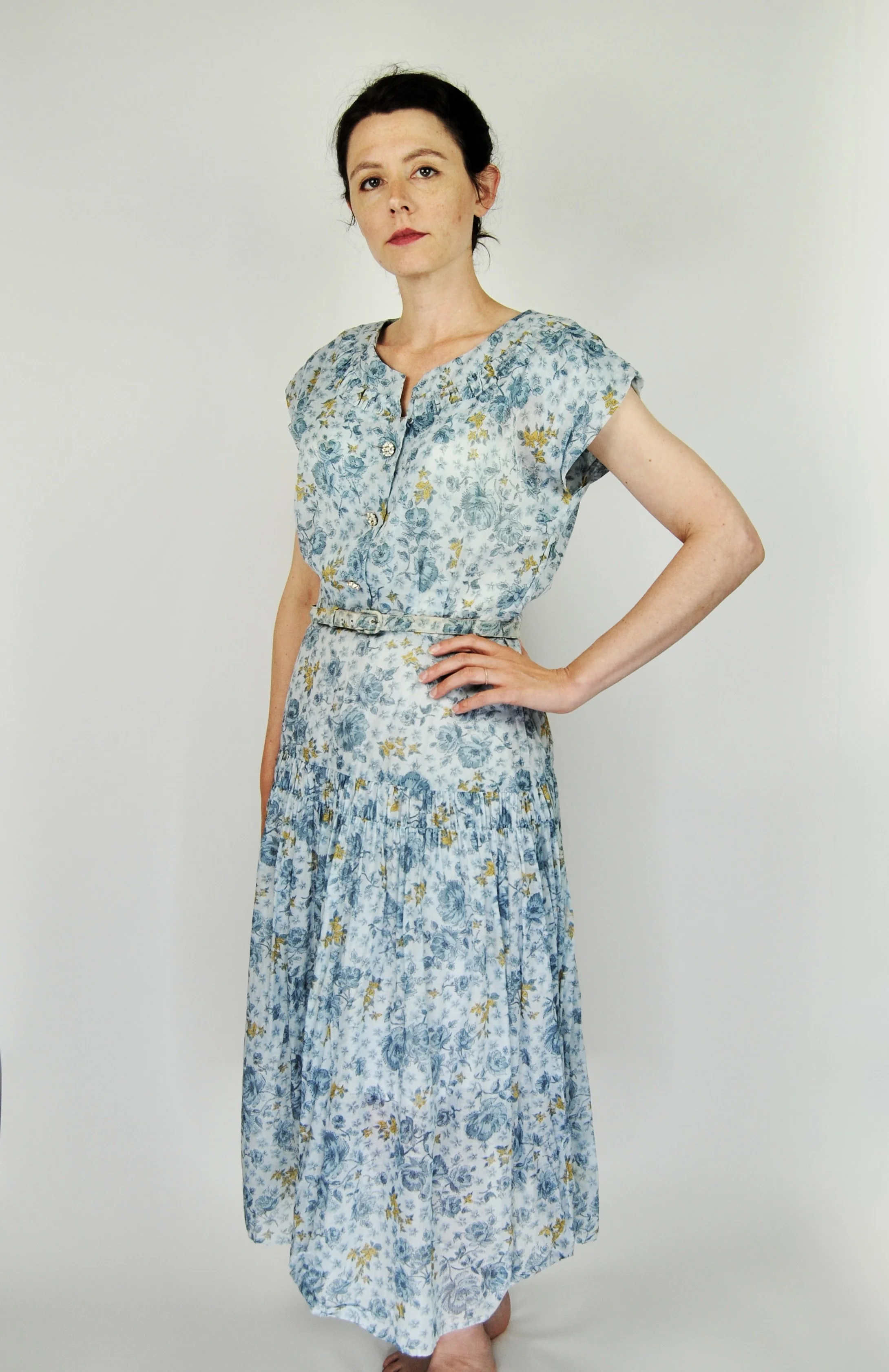 Wow! An absolutely stunning and unique little mini roller skater dress- I found it within a collection of 1940s roller skating costumes!!! The creamy or off white mini dress features a flared skirt and zips up the front. I love the touch of flutter to the sleeves. It was originally intended to be worn with cute ruffled shorts underneath - unfortunately the shorts that came with it were in absolute terrible shape and will not be sold. This dress appears to be handmade or at least hand altered possibly from another dress (?)- though of course it was made well. There are no labels, but it does have a metal Talon front zipper. Fabric feels like a possibly rayon-nylon blend and has an ever so slight sheen to it when examined closely. I would like to say that I am not 100% certain of this fabric, it is soft and feels nice to the touch, but this is one fabric NO ONE has ever been able to tell me what it is - I have now 3 pieces with this fabric and I have only EVER seen it in 1940s garments and always in this off white color. Skirt portion is lined. Would likely best fit a modern Medium. For reference model is modern size 4/6 and it felt a bit loose.