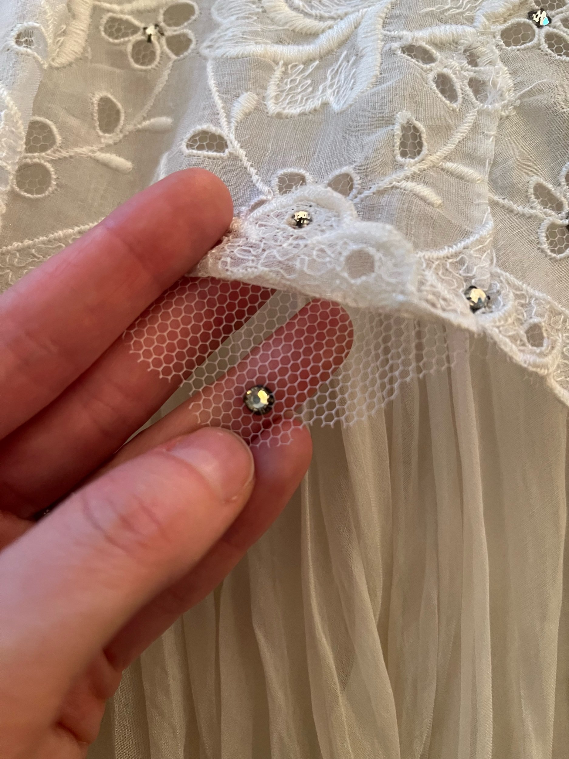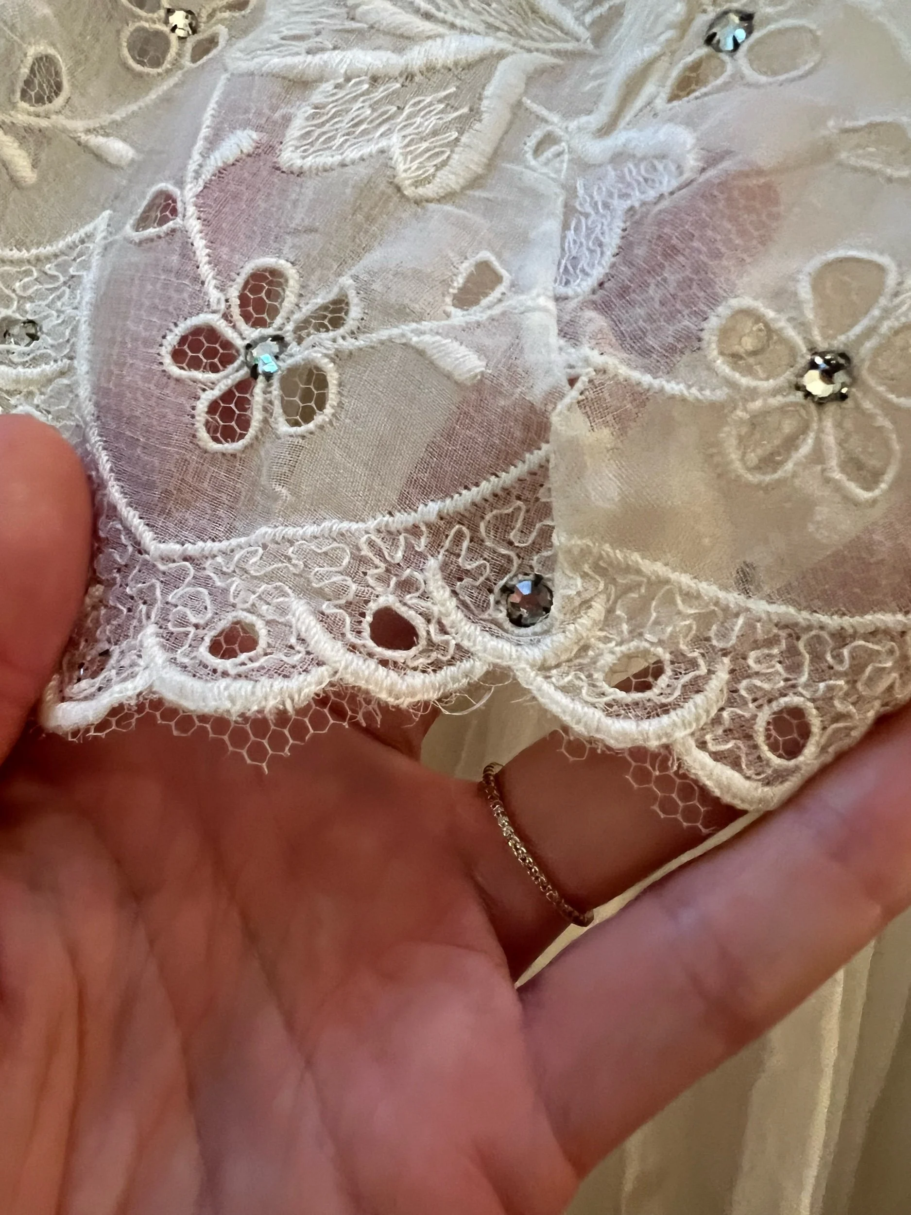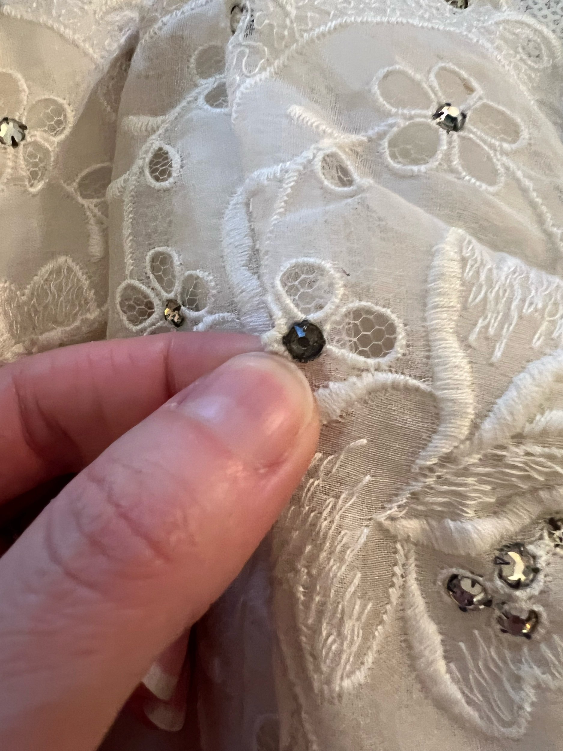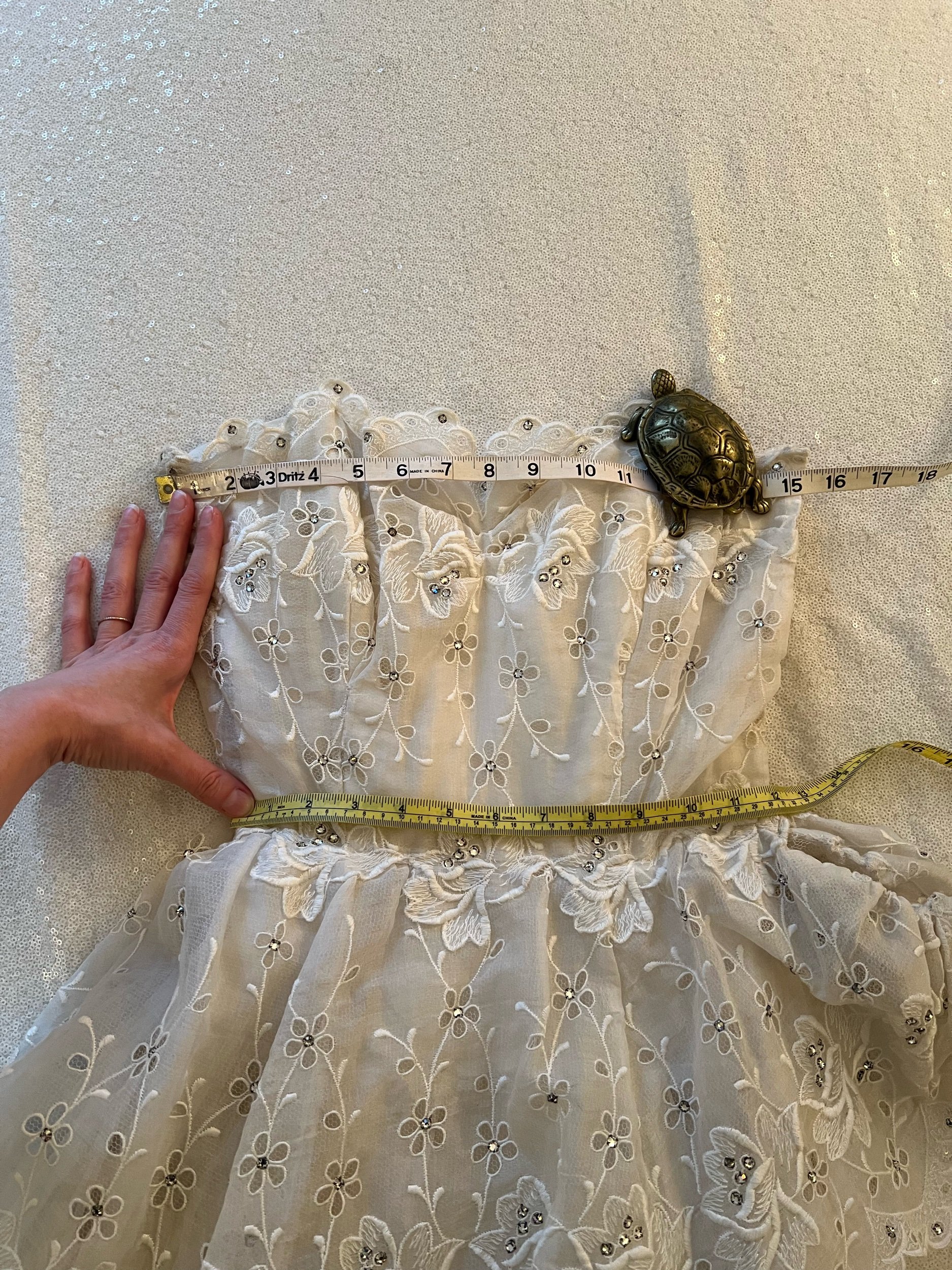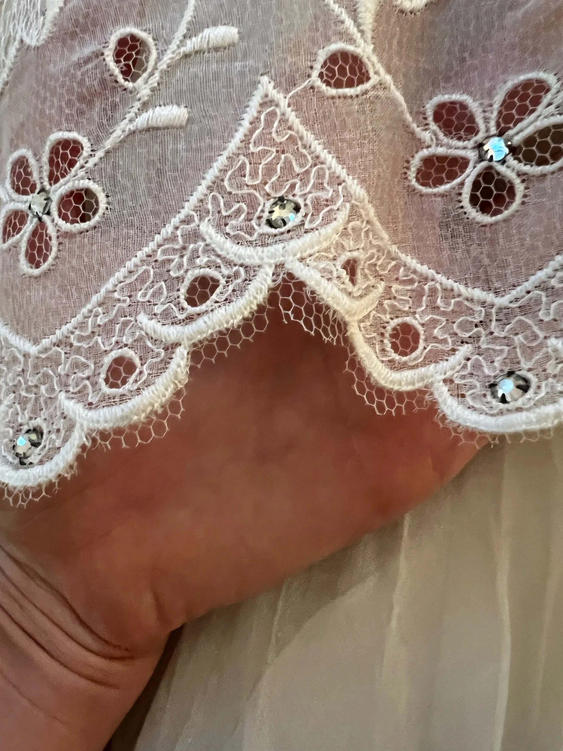 If you’re looking for a show stopper, this gown is for you! I have never seen anything like it. The lovely cotton eyelet lace and rhinestones on the boned bodice is so elegant. The added asymmetrical peplum is so unique too! The double layer of semi sheer- gauzy organza skirt adds such a delicate touch. The dress is just so whimsical and clearly expertly made. There is no tags in it to indicate who made this piece and given the estate I got it from, it was likely one of the many custom made gowns this woman owned. Zips up the side with a metal zipper. Best fits an XXS or XS. Model is modern size 4/6 and it would not zip up (its being held up to the best of my abilities in the photo and as such its fit looks somewhat loose). Model is also 5’5 and this dress is VERY long on her. You may be able to put a crinoline or smaller hoop underneath to puff it out, though I am not sure you can go too large unless you lay it over the innermost skirt.