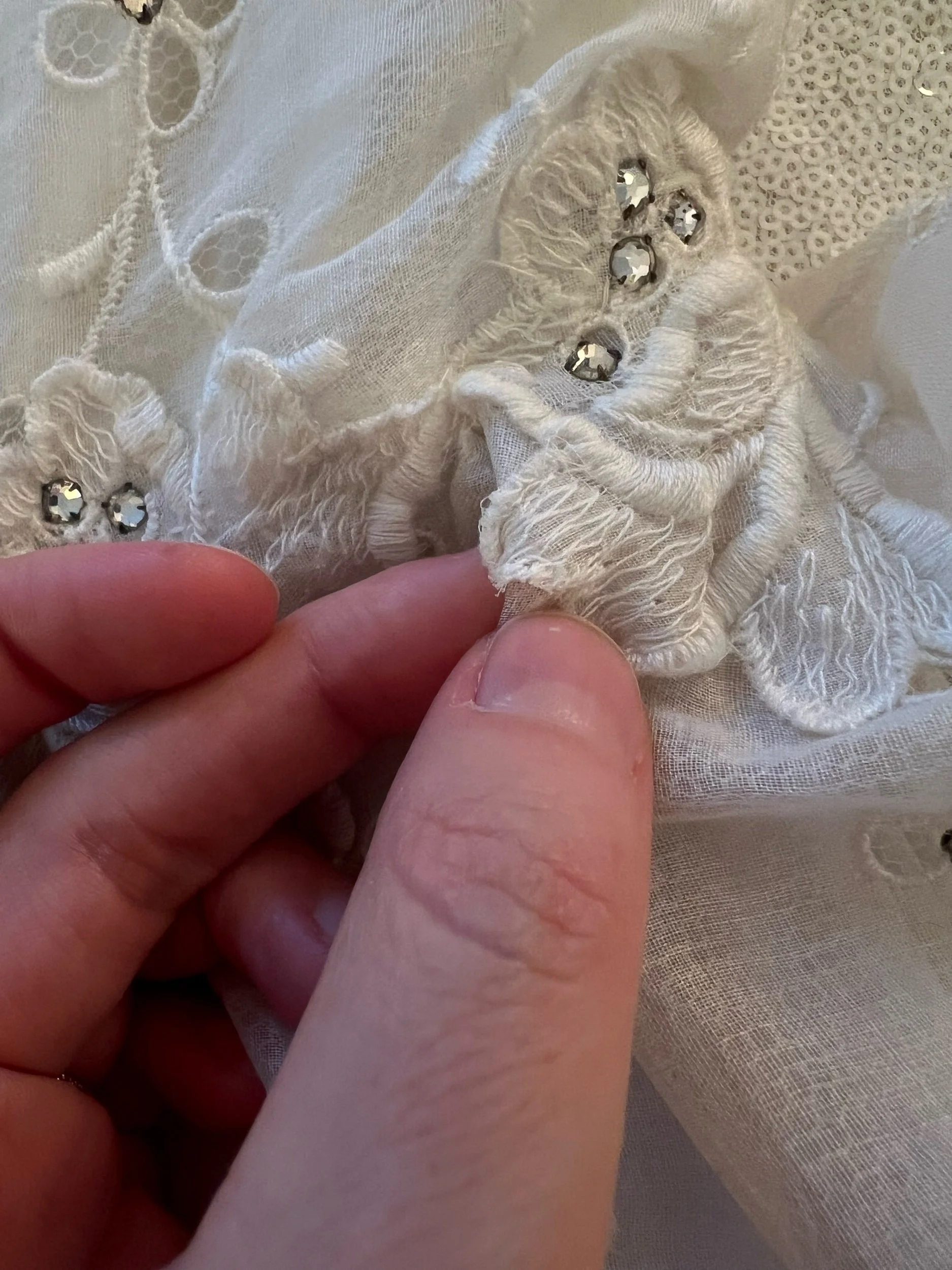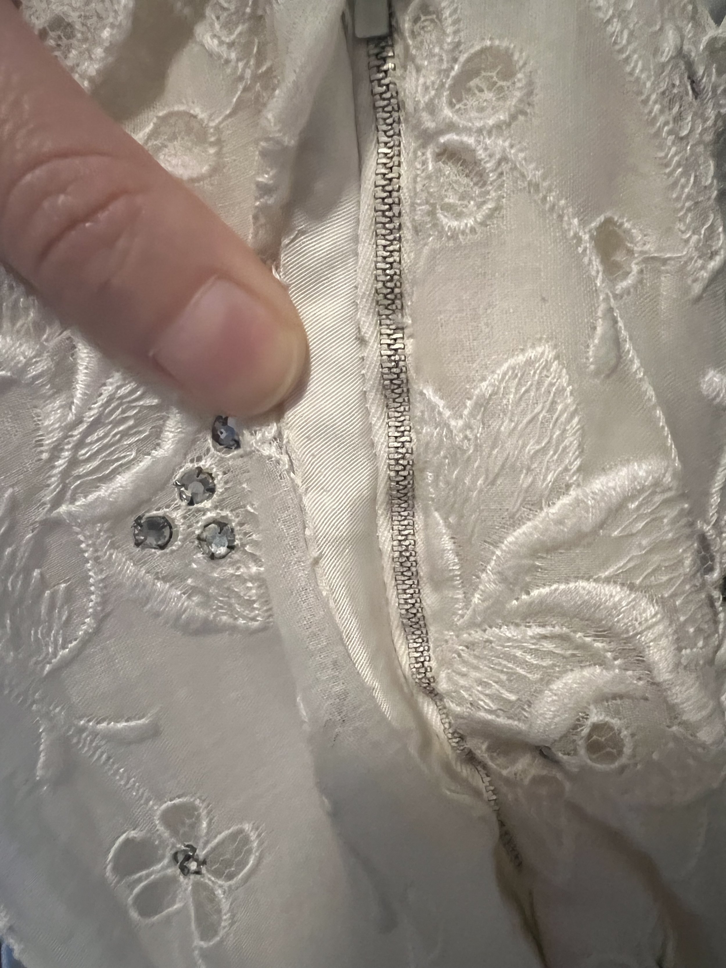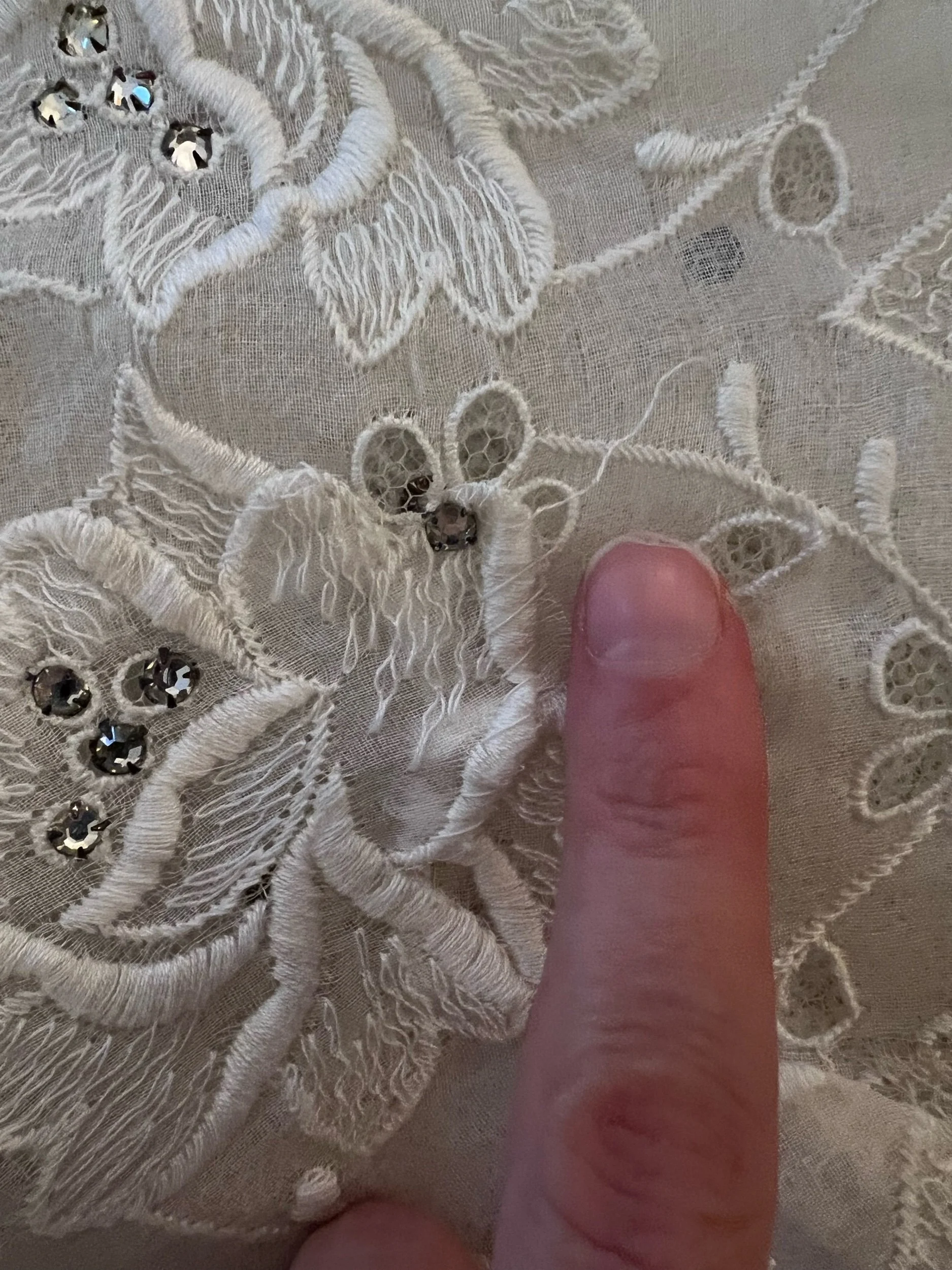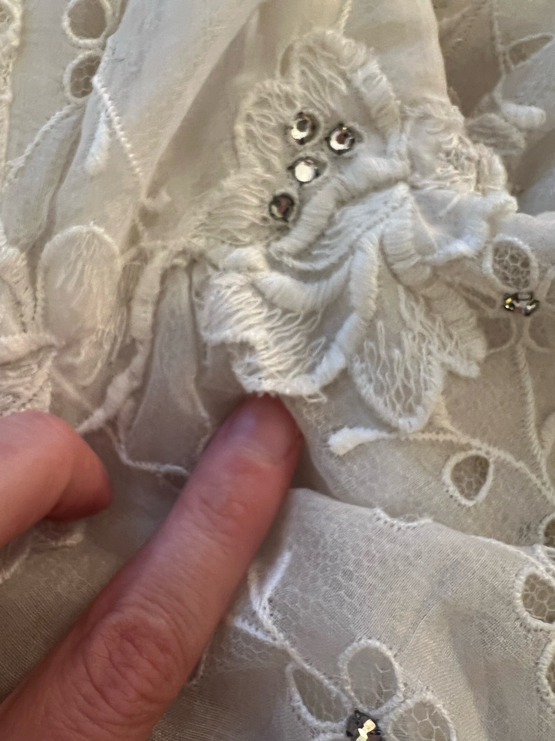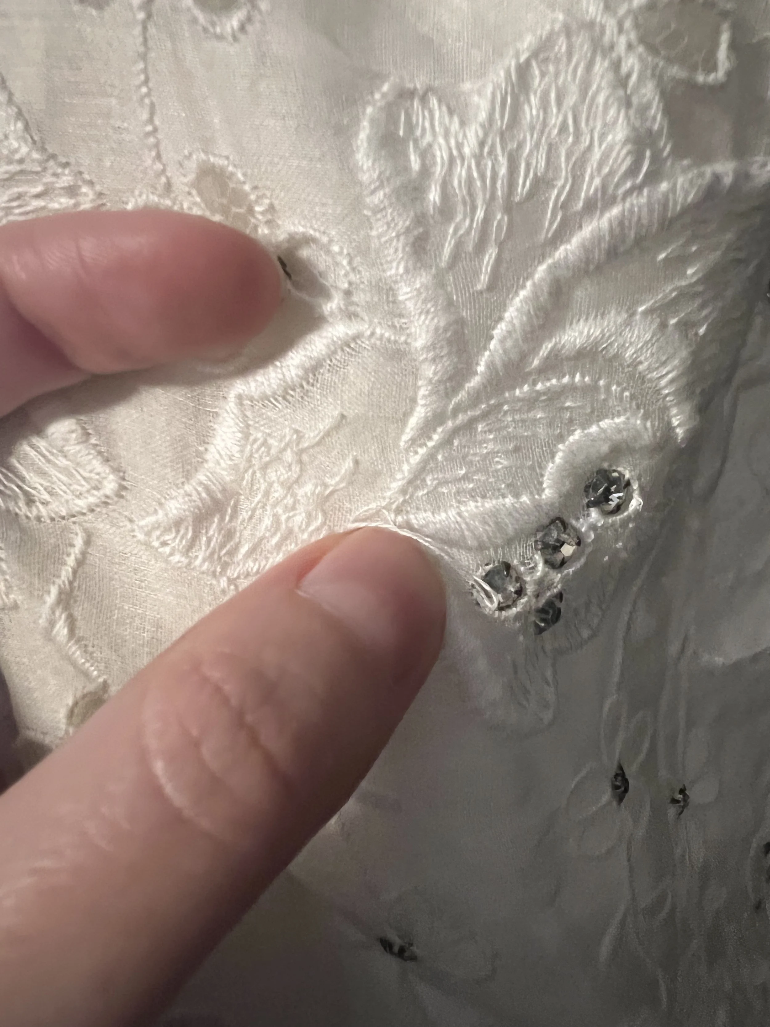 If you’re looking for a show stopper, this gown is for you! I have never seen anything like it. The lovely cotton eyelet lace and rhinestones on the boned bodice is so elegant. The added asymmetrical peplum is so unique too! The double layer of semi sheer- gauzy organza skirt adds such a delicate touch. The dress is just so whimsical and clearly expertly made. There is no tags in it to indicate who made this piece and given the estate I got it from, it was likely one of the many custom made gowns this woman owned. Zips up the side with a metal zipper. Best fits an XXS or XS. Model is modern size 4/6 and it would not zip up (its being held up to the best of my abilities in the photo and as such its fit looks somewhat loose). Model is also 5’5 and this dress is VERY long on her. You may be able to put a crinoline or smaller hoop underneath to puff it out, though I am not sure you can go too large unless you lay it over the innermost skirt.