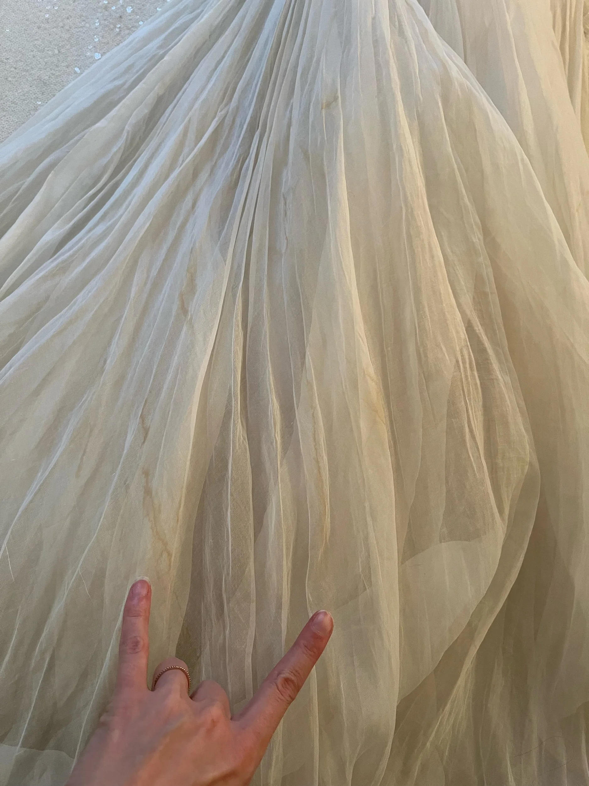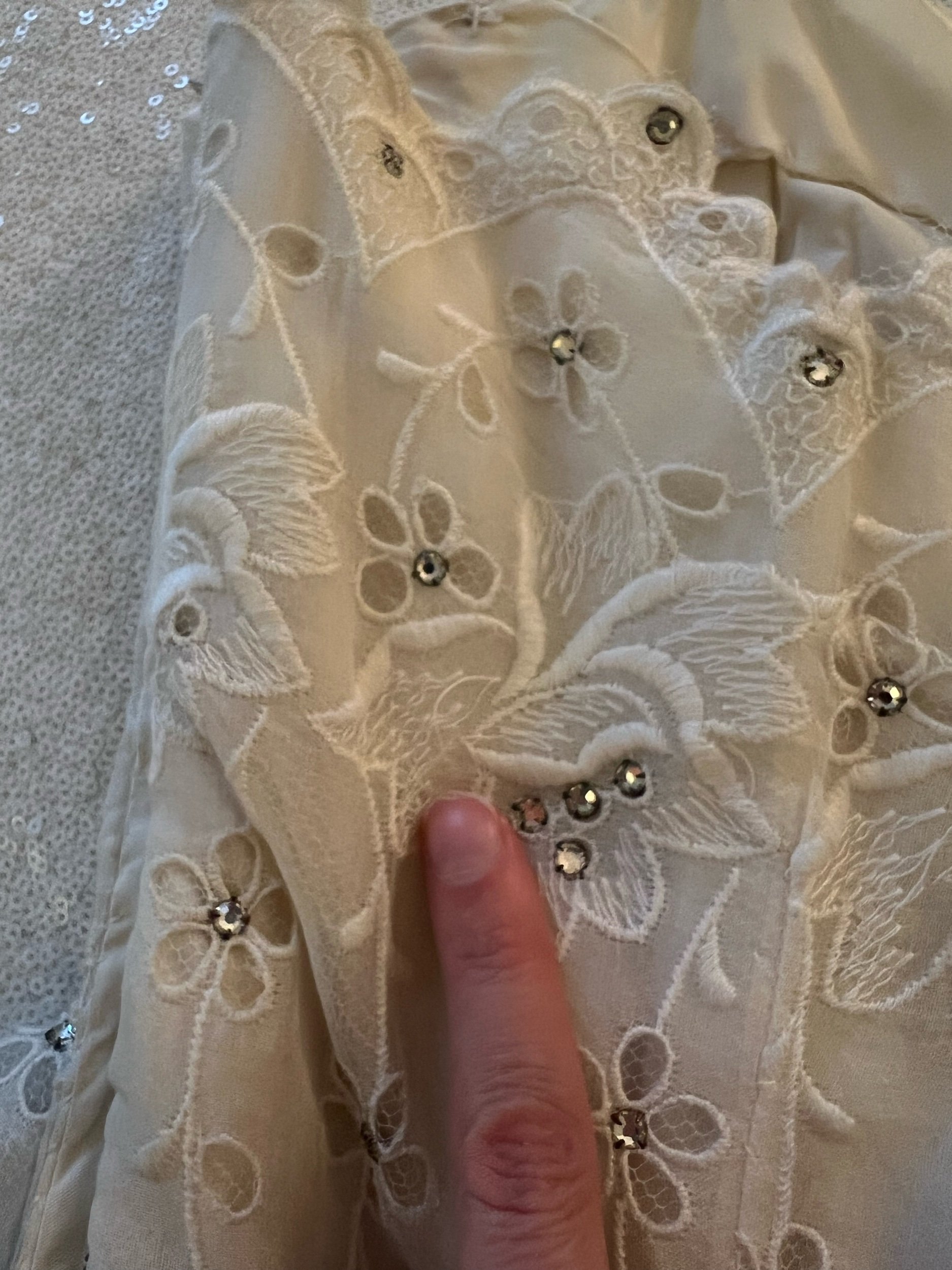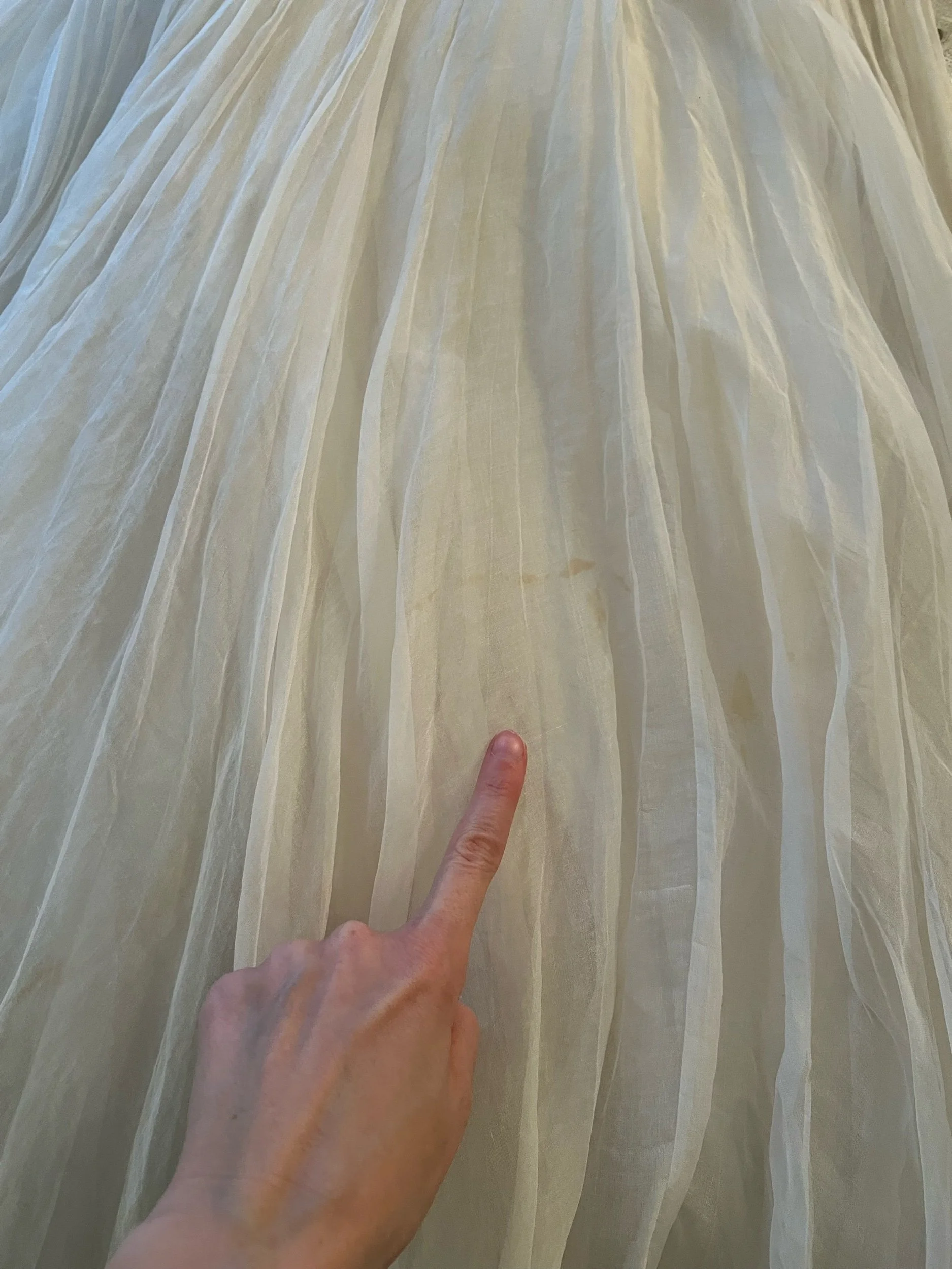 Good to Fair vintage condition - Overall wear to the piece but presents beautifully and still seams very wearable. There is some overall greying/yellowing to the piece. While I did delicately wash the gown a number of times, there are still a number of marks and stains remaining throughout the piece. With all the skirt fabric though, to my eye at least I didn’t think they were too terribly noticeable overall. Further faint markings on the hem of the inner skirts were also found. The rhinestones do not appear to be missing (though some are cloudy), but of course that could be overlooked on my part, so if any are gone or damaged it’s not obvious. Lace appears to be in good shape overall with only a few loose threads and minor wear and just some of the edges bending down around the bodice (these could be stiffened). There is some minor rip to the inner tulle underneath the lace right by the zipper. Wear to inner seam allotments. Please see photos.