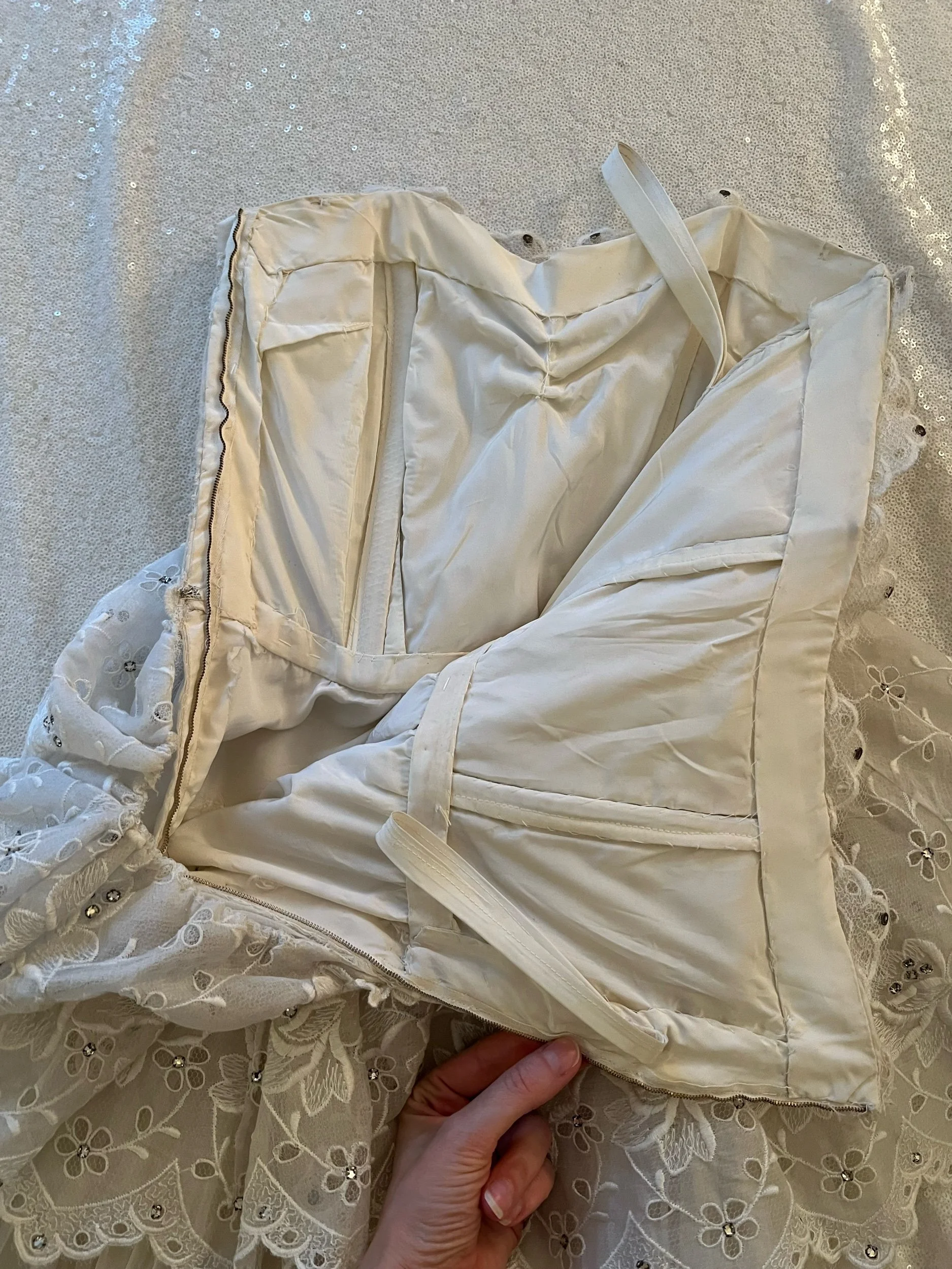RARE 1940s Vintage Cream Eyelet Lace and Rhinestone Organza Strapless Wedding Evening Gown - XXS or XS